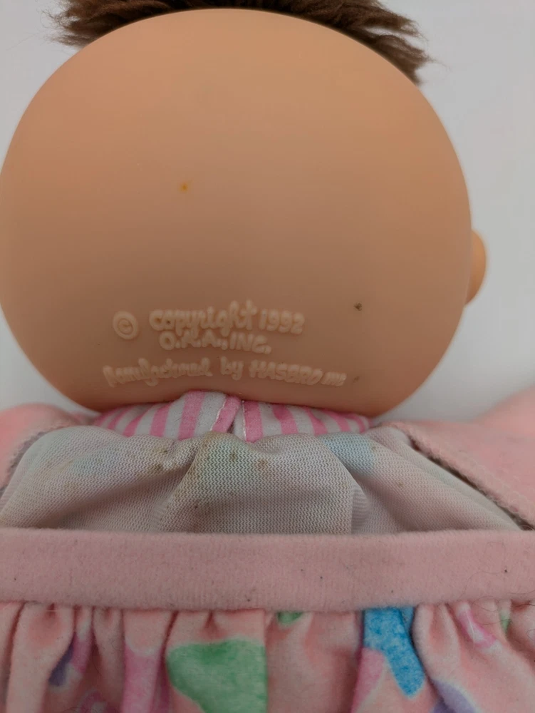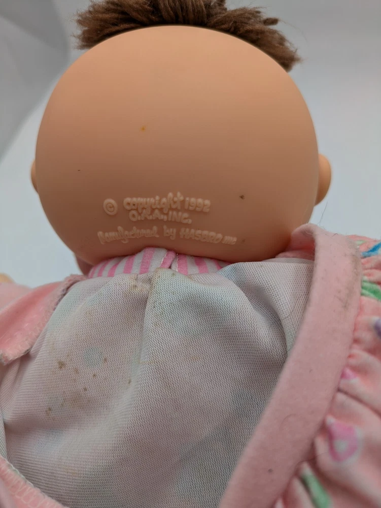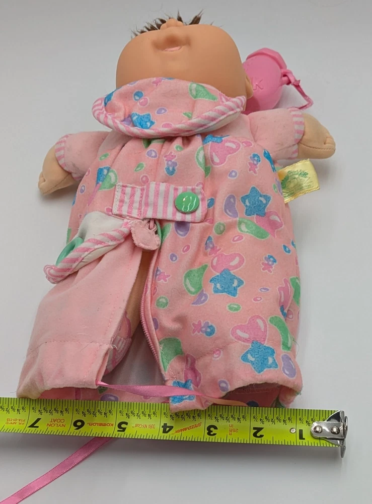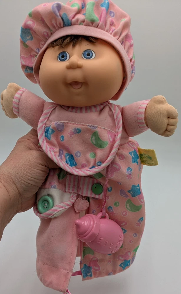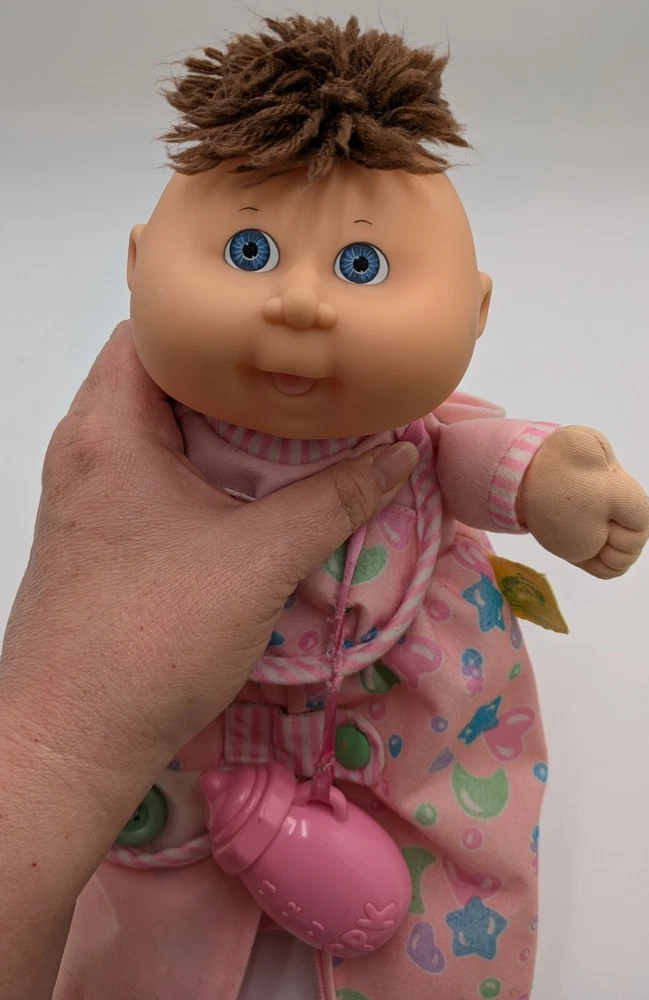 This vintage 1992 Cabbage Patch Toddler Collection Love N Care Baby Doll is a must-have for any collector or enthusiast. The doll is 12 inches in size and comes with straight brown hair and blue eyes. The doll is made of plastic and has a medium complexion. This original Hasbro doll is licensed and comes with a bottle. It was manufactured in the 1990s and is a great addition to any vintage doll collection. Perfect for display or play, this doll is sure to bring joy to any recipient.