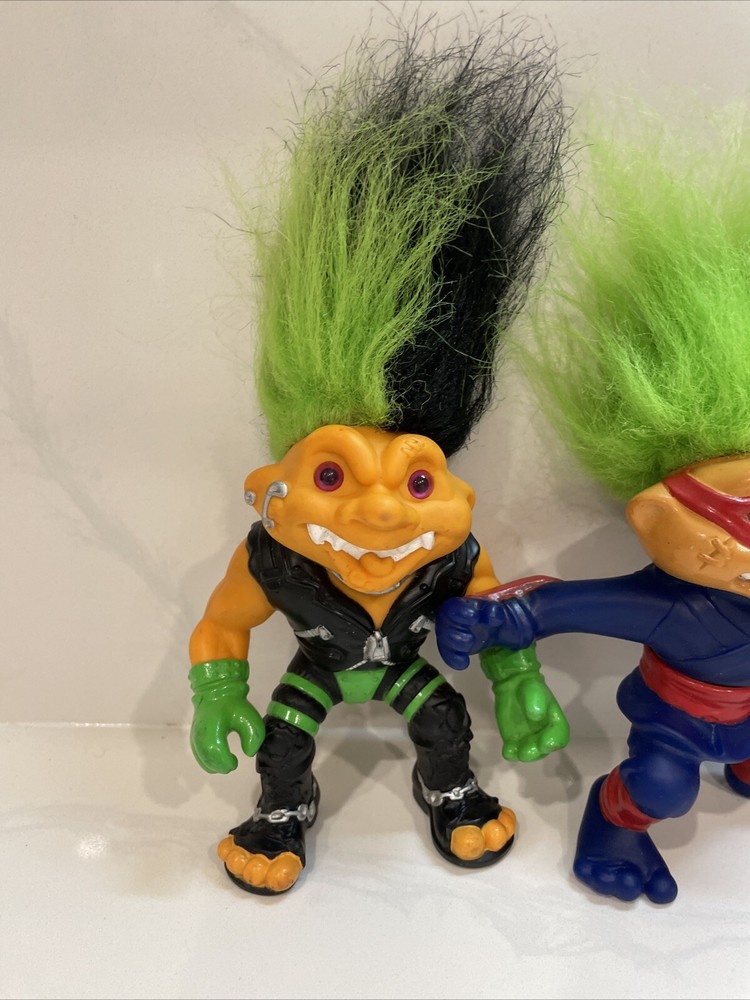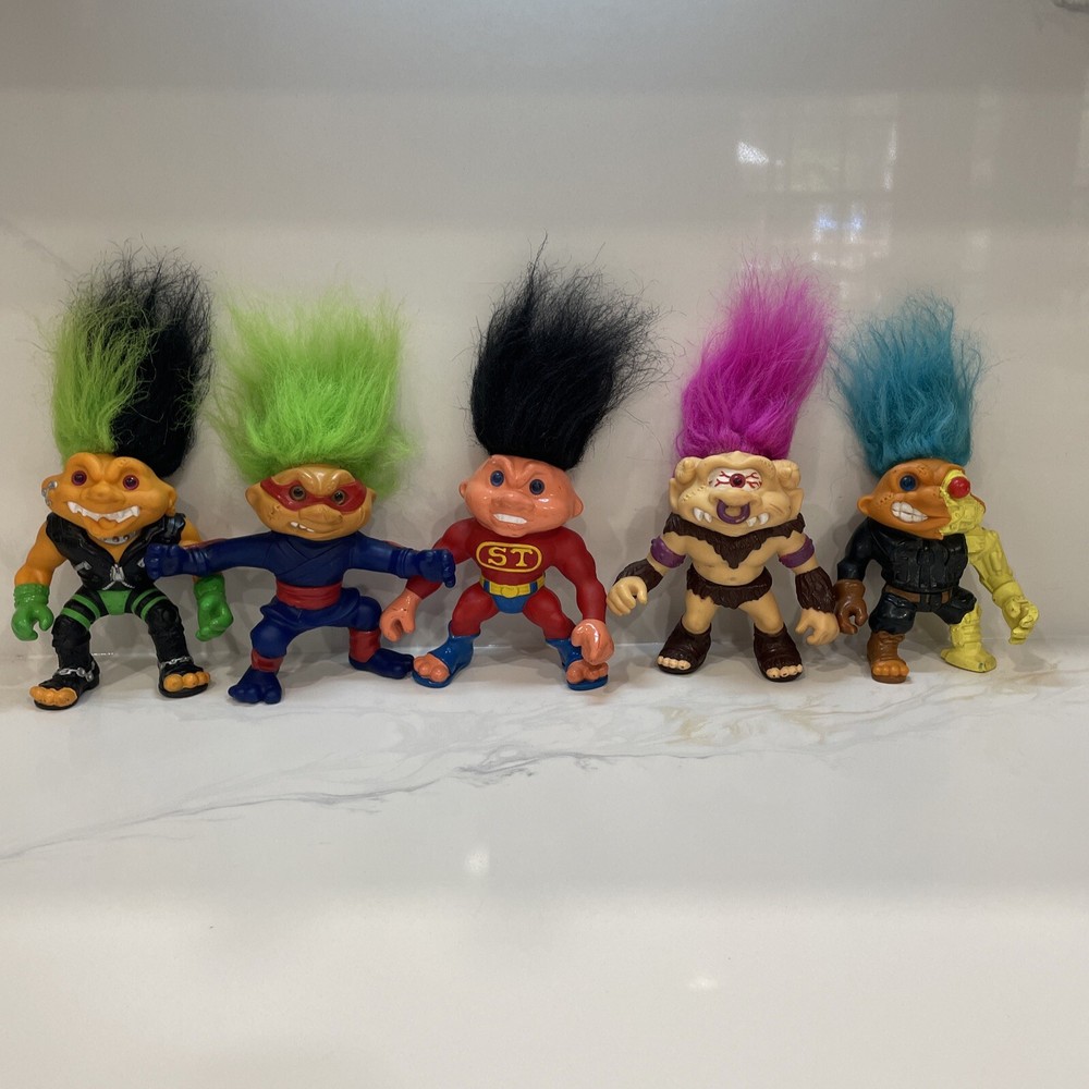 This lot of 5 vintage Hasbro Battle Trolls figurines is a must-have for any Trolls fan. These colorful vinyl figures stand at 5 inches tall and are perfect for display or play. The set includes characters from the Battle Trolls series and is an original, licensed reproduction from 1992. The multicolored Trolls are transformed into action figures with intricate details and are perfect for collectors or children aged 5-7 years. These figurines are a part of the Trolls franchise and are a great addition to any collection. Get your hands on this rare set of Battle Trolls and relive the fantasy adventures of your childhood.