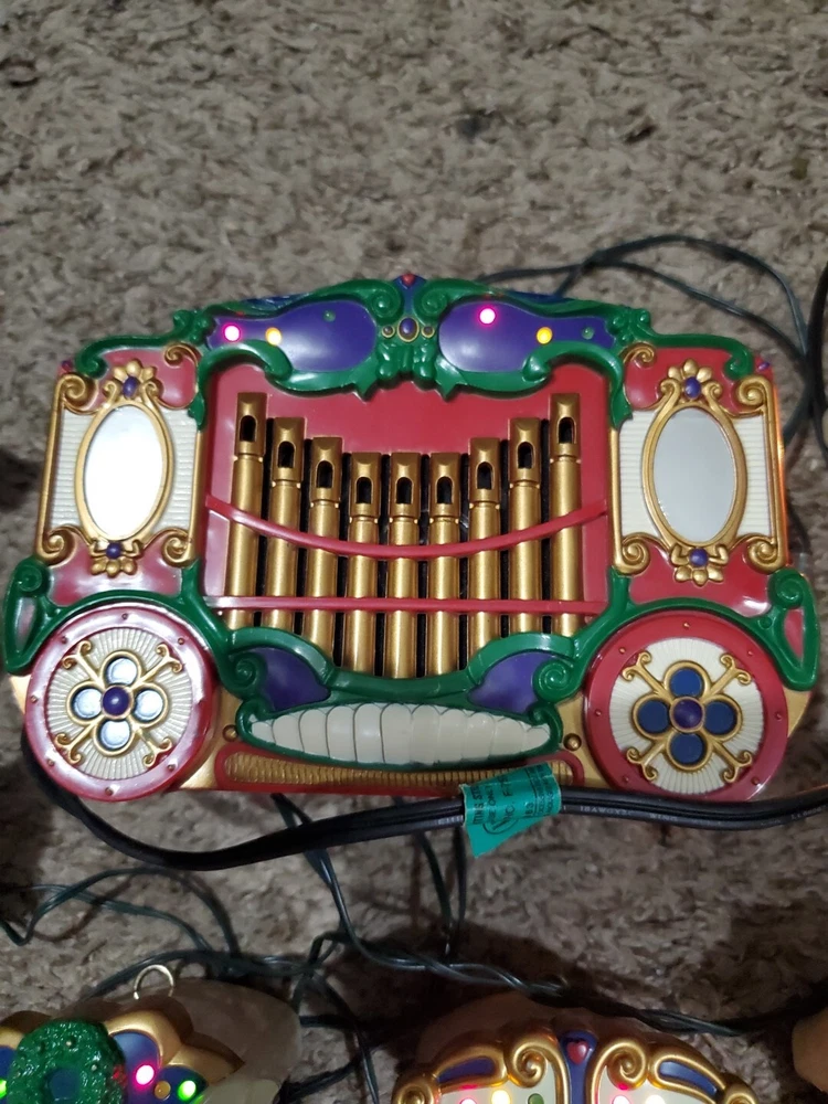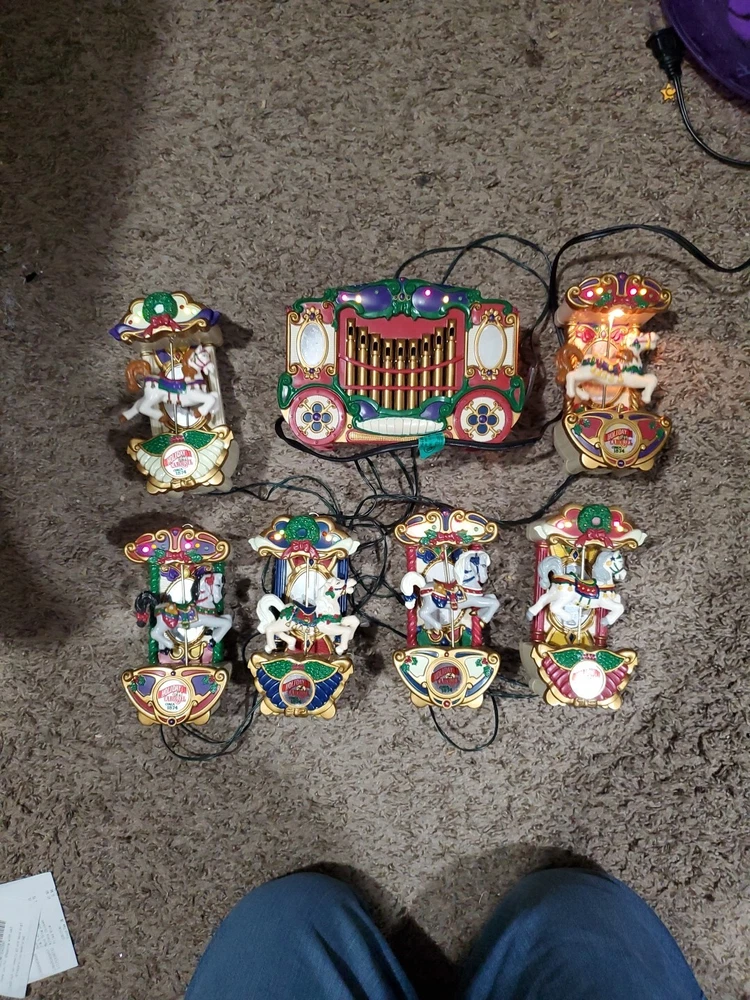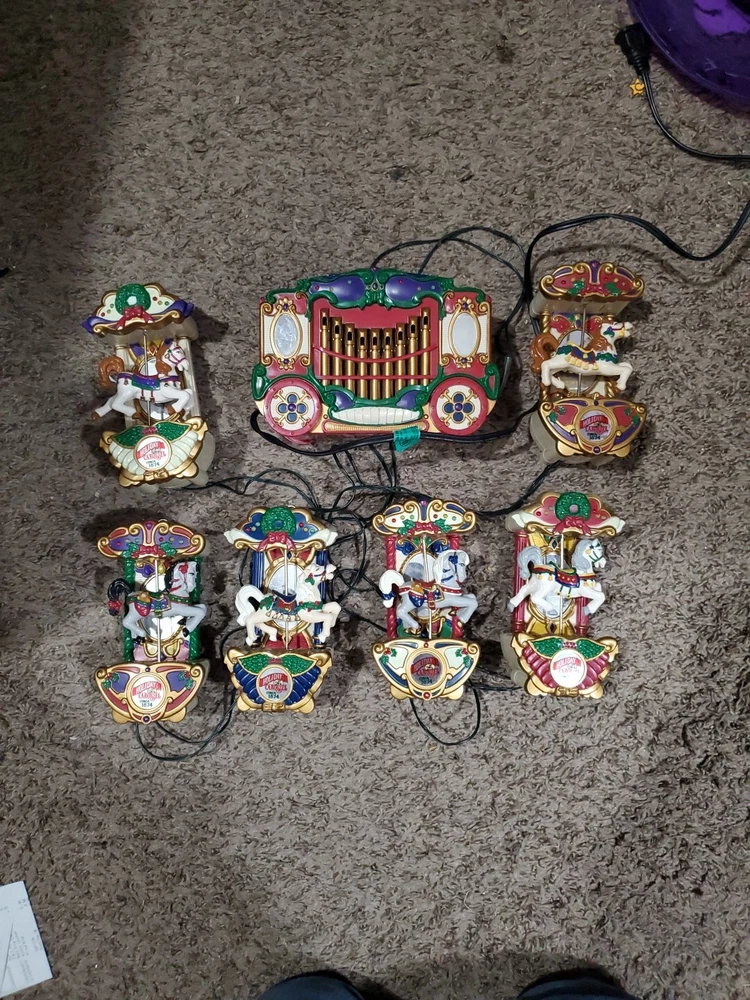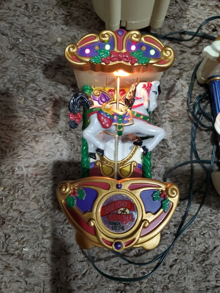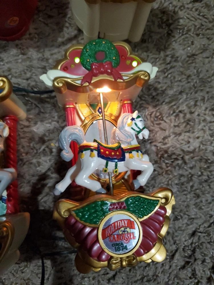 Vintage 1992 Mr Christmas Holiday Carousel Light & Musical 6 Horses - Circus Organ Plays all 21 carols, has colored lights on organ and each carousel ornament. Each horse has white spotlight on top, bulb on 3 horses do not light. On/Off switch and volume control on side of circus organ train. No original box. In excellent preowned condition.