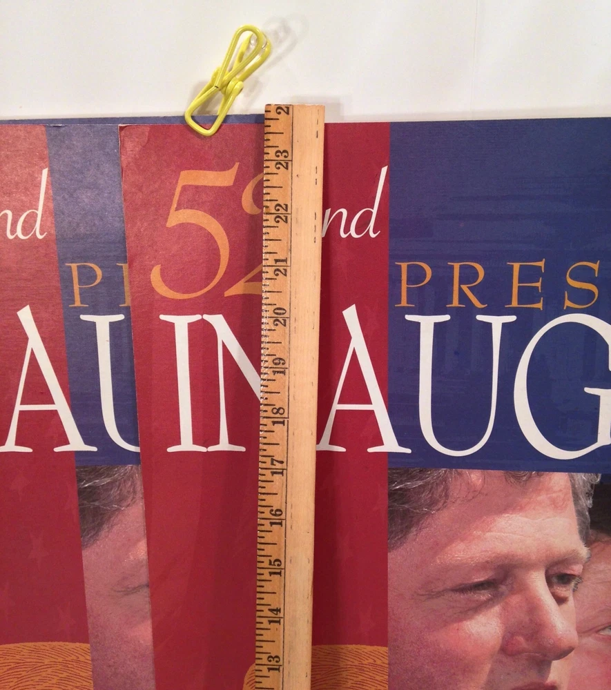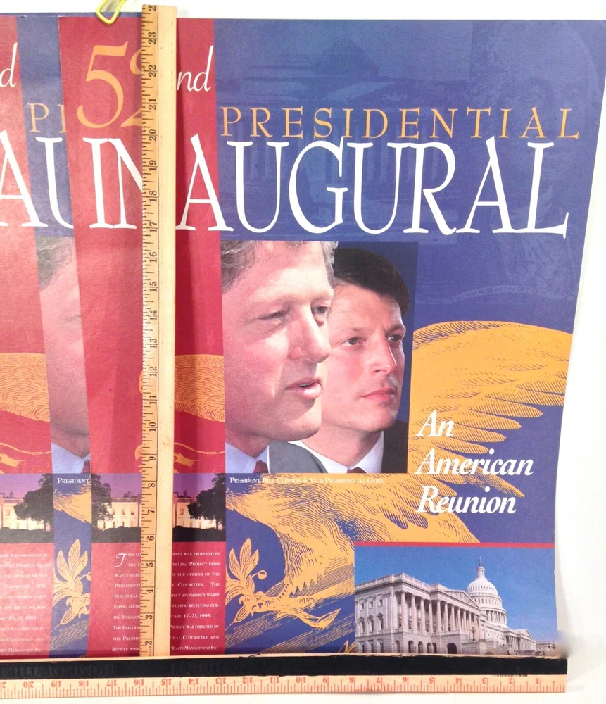AS SHOWN Vintage 1993 President Bill Clinton Inaugural Poster Lot Of 3 Nice RECOVERED FROM AN ESTATE LIQUIDATION THERE ARE THREE POSTERS HERE AS SHOWN ALL THREE FOR A SINGLE PRICE ALL ARE CLEAN AND HAVE BEEN WELL KEPT ORIGINAL FIRST TERM 1993 INAUGURAL POSTERS IT'S NOT EASY TO FIND LOTS LIKE THIS ONE WILL PROBABLY BE A WHILE BEFORE ANOTHER ONE LIKE THIS IS AVAILABLE (IF THERE IS ANOTHER ONE LIKE THIS......) SHIPS WELL PACKED AND FULLY INSURED 100% AUTHENTIC AND ORIGINAL NOT A CRUMMY REPRODUCTION SHIPS WELL PACKED AND FULLY INSURED PLEASE LOOK AT THE RULERS IN THE PICTURES PLEASE USE THE ZOOM TOOL TO LOOK AT ALL OF THE PICTURES PLEASE READ THE TERMS OF SALE THEY ARE IMPORTANT AND PLEASE KNOW WHAT YOU ARE BUYING HIGHLY UNLIKELY THERE WILL EVER BE MANY OPPORTUNITIES TO ACQUIRE THIS OPEN TO REASONABLE OFFERS...... BE REASONABLE AND IT'S YOURS! YOU'LL NEVER KNOW WHAT I'LL ACCEPT IF YOU DON'T MAKE AN OFFER.... I WANT YOU TO BE HAPPY WITH YOUR PURCHASE. THE TERMS OF SALE ARE LISTED BELOW PLEASE TAKE THE TIME TO READ AND UNDERSTAND THEM!! PLEASE KNOW WHAT YOU ARE BUYING. PLEASE ASK IF YOU HAVE ANY QUESTIONS!! IF YOU DO NOT UNDERSTAND SOMETHING ASK FOR CLARIFICATION BEFORE MAKING AN OFFER OR BID! PLEASE UTILIZE YOUR KNOWLEDGE TO INSURE YOUR OWN PURCHASING SATISFACTION! PLEASE SEE PROVIDED PICTURES THEY WERE TAKEN USING FIVE 300 WATT LIGHTBULBS!! MANY DIFFERENT VIEW ANGLES ARE SHOWN AND ANY DEFECTS ARE VERY EASILY SEEN!! PLEASE NOTICE THIS IS BEING SOLD AS A NON-RETURNABLE NON-REFUNDABLE ITEM!! UNPAID ITEM CASES ARE AUTOMATED TO OPEN 48 HOURS AFTER PURCHASE!! IF FREE SHIPPING IS OFFERED IT IS FOR THE LOWER 48 UNITED STATES ONLY! INTERNATIONAL SHIPPING IS ONLY THROUGH EBAY'S GLOBAL SHIPPING SERVICE!! ANY SHIPPING DAMAGED ITEM CLAIMS ARE THE RESPONSIBILITY OF THE BUYER!! SELLER CAN ASSIST THE BUYER IN CLAIM PROCESS FOR A DAMAGED ITEM!! THIS IS AN ESTATE LIQUIDATION ITEM THAT SHOWS SOME WEAR SCUFFS, SCRATCHES ETC ETC AND MAY NEED CLEANING!! ANY CLEANING NEEDED IS FOR THE NEW OWNER TO DO! THIS ITEM IS BEING SOLD AS IS AS SHOWN PLEASE NO CRY BABIES WHINERS OR COMPLAINERS, IF YOU DON'T LIKE THE TERMS OF SALE OR THE PRICE OF THE ITEM THEN PLEASE JUST DON'T BUY IT. THANKS FOR LOOKING AND HAPPY EBAYING TO YOU!!!!