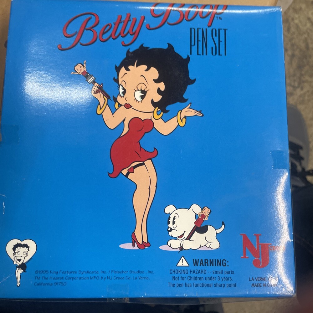 This product is a vintage 1995 Betty Boop pen set featuring four black plastic pens in the shape of the iconic character Betty Boop. The set is brand new in its original box, making it an extremely rare collectible item for fans of the beloved animation franchise. The figurine pens are themed around animation and are a unique and nostalgic addition to any collection of Betty Boop memorabilia. Made in China, these pens are a must-have for collectors and enthusiasts of classic animation.