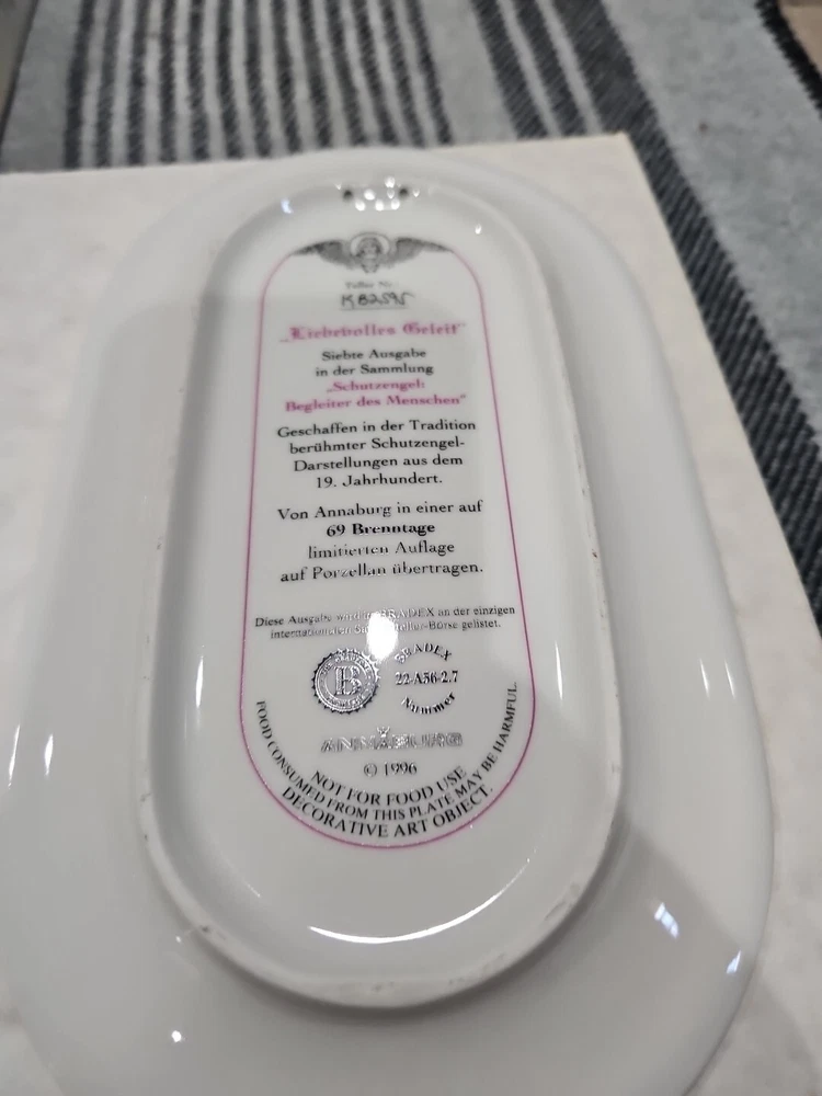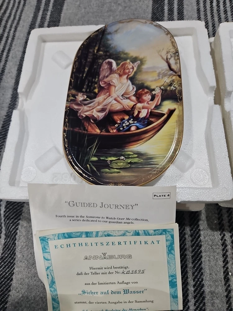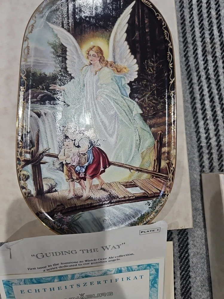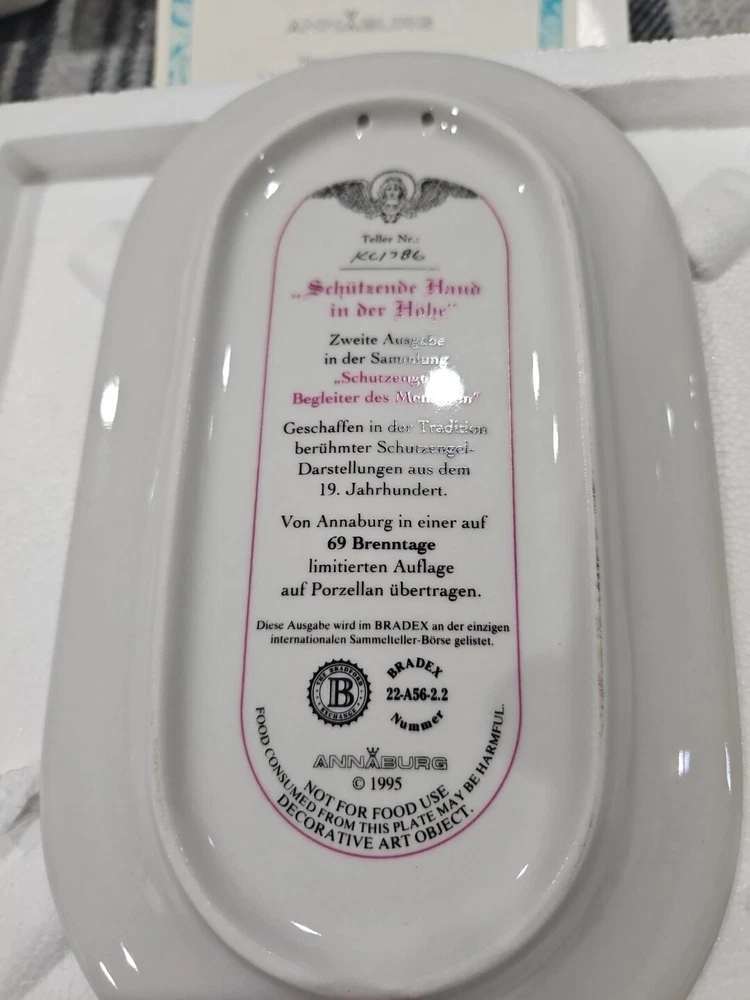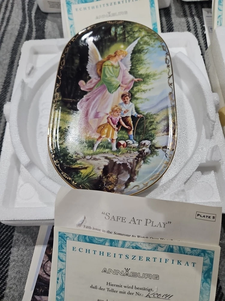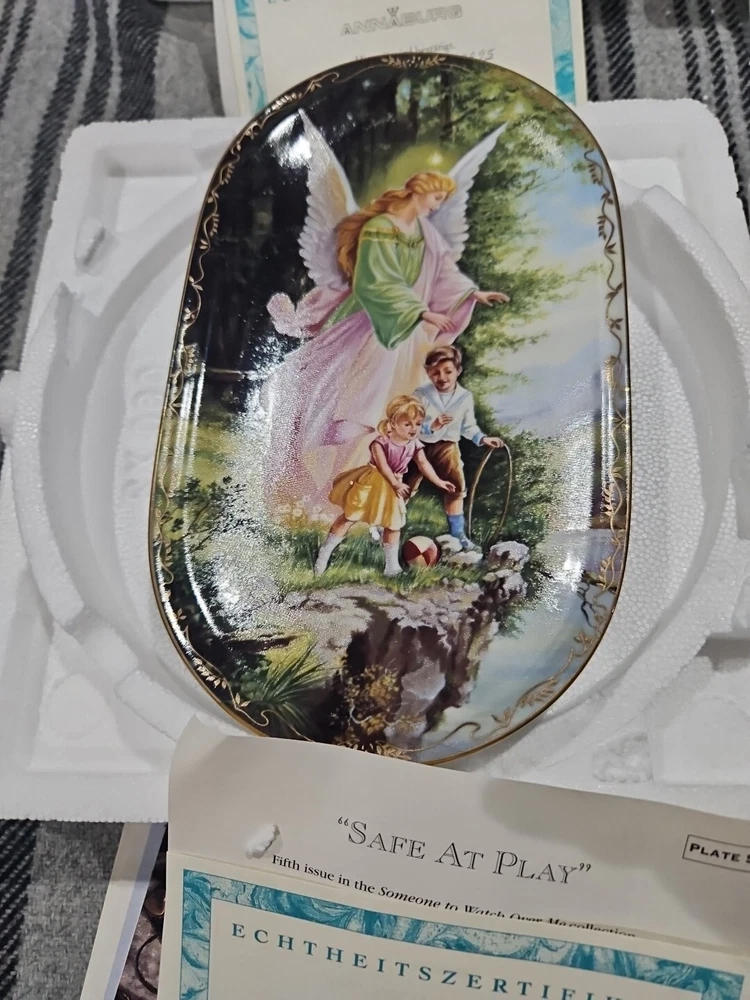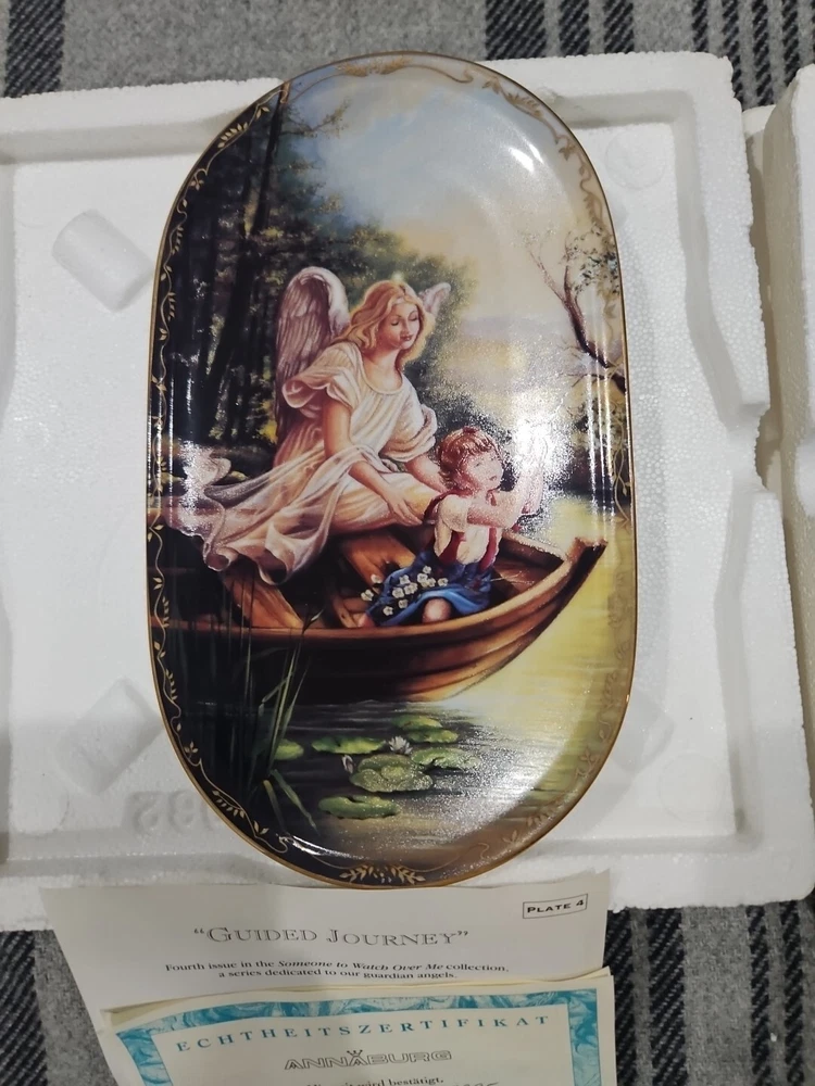 This set of seven oval collector plates from the 1995-96 Bradford Exchange features the beautiful and intricate Guardian Angel design. Made of high-quality porcelain, these plates showcase the artistry of German pottery from the late 20th century. The multicolor design is perfect for any collector or enthusiast, and the vintage production technique adds to their unique charm. The plates are perfect for display or for use as a decorative piece. The ANNABURG brand is known for its quality and attention to detail, making these plates a must-have for any collector. Add them to your collection today! Like new. Great new collection for your China.