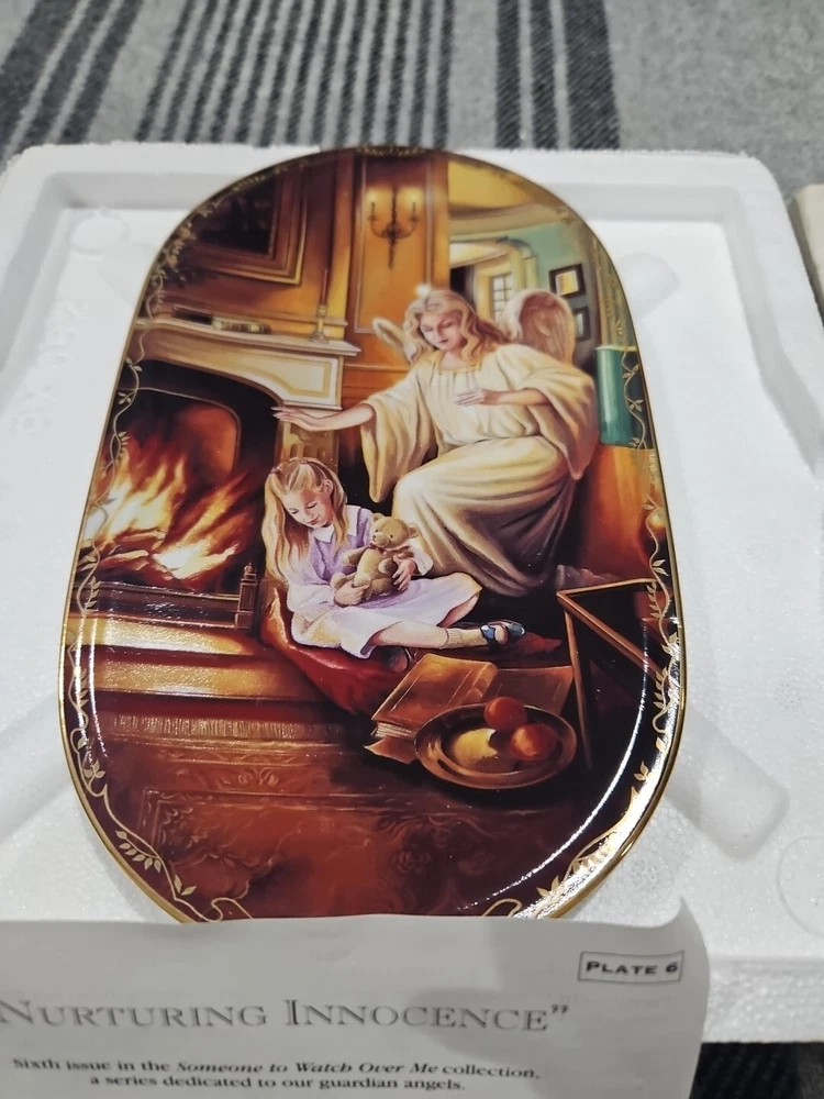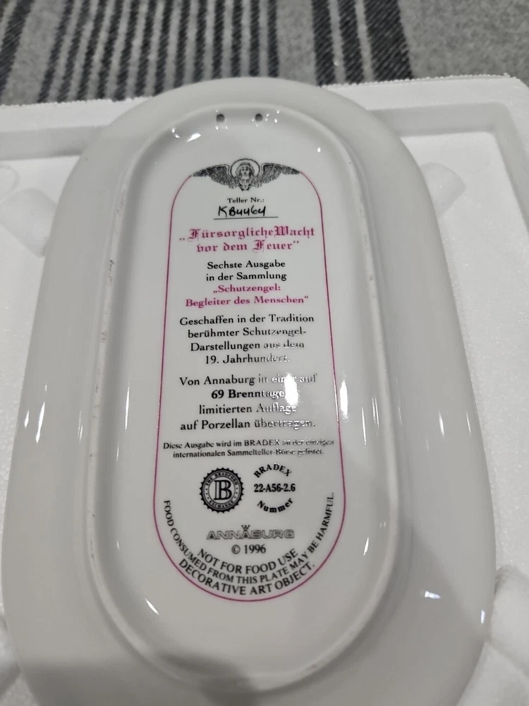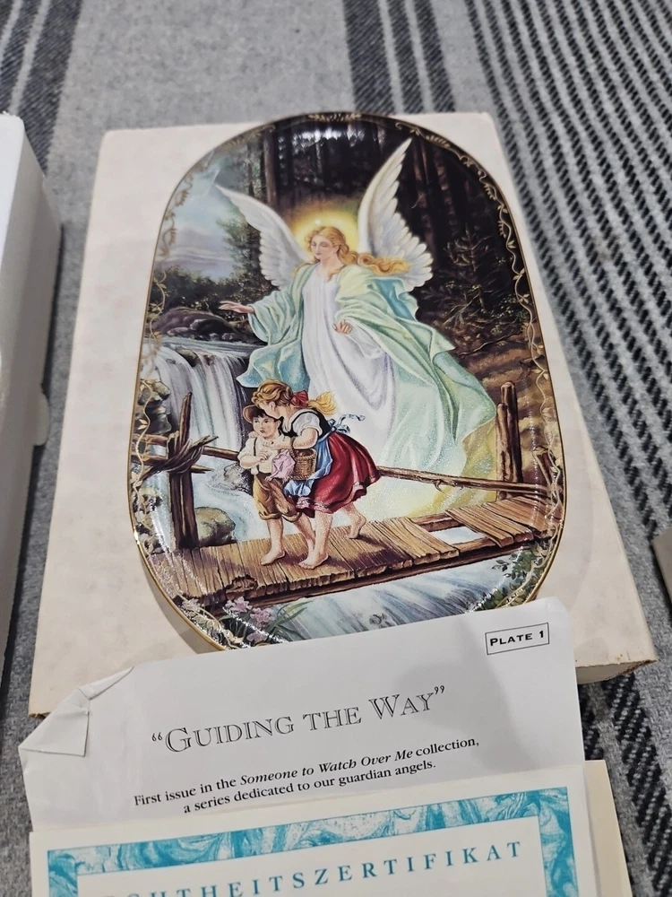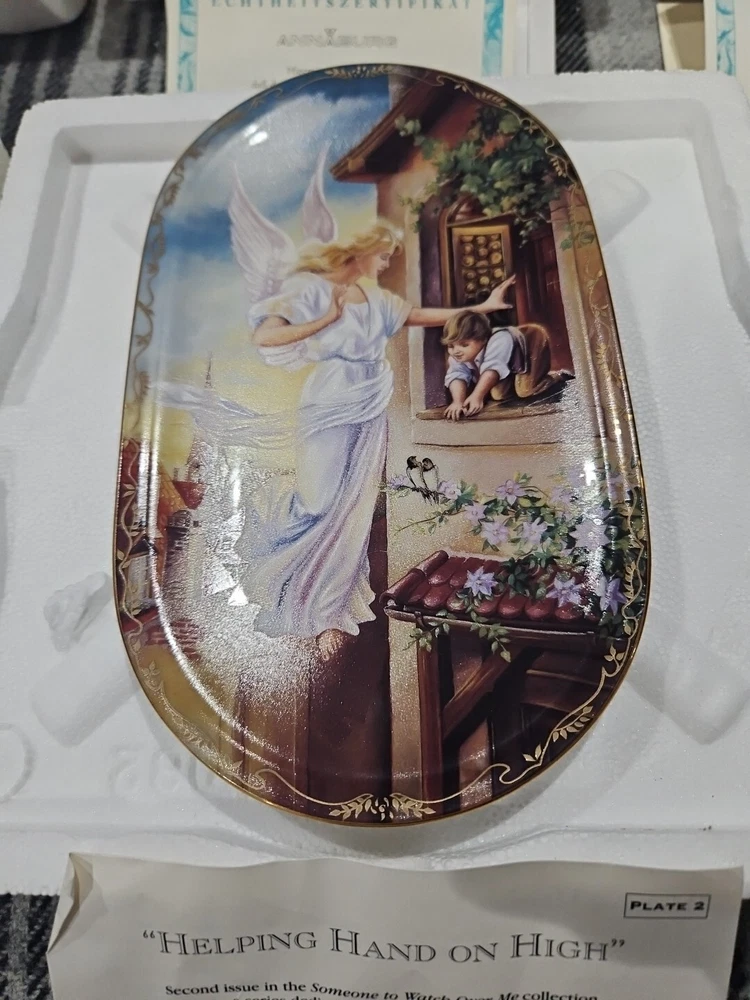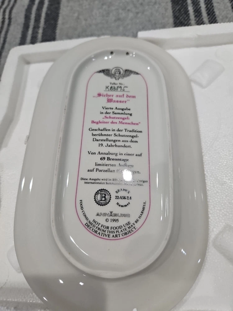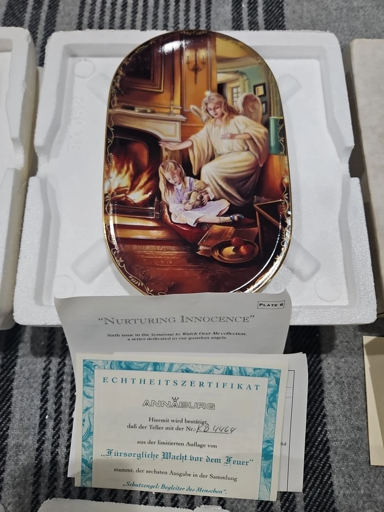 This set of seven oval collector plates from the 1995-96 Bradford Exchange features the beautiful and intricate Guardian Angel design. Made of high-quality porcelain, these plates showcase the artistry of German pottery from the late 20th century. The multicolor design is perfect for any collector or enthusiast, and the vintage production technique adds to their unique charm. The plates are perfect for display or for use as a decorative piece. The ANNABURG brand is known for its quality and attention to detail, making these plates a must-have for any collector. Add them to your collection today! Like new. Great new collection for your China.