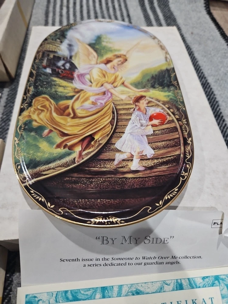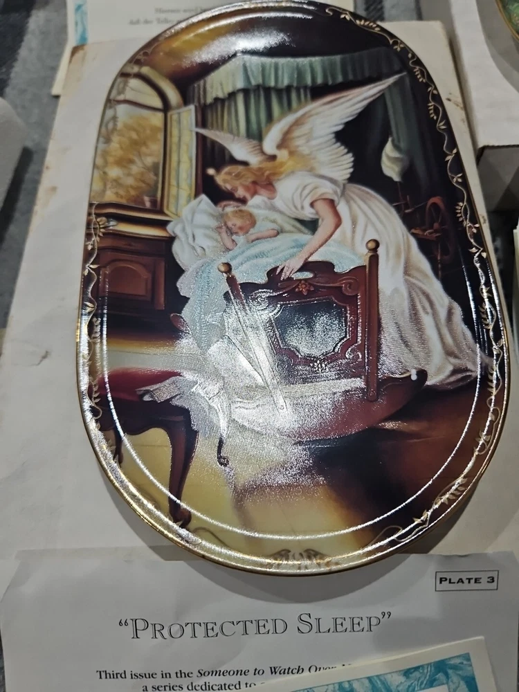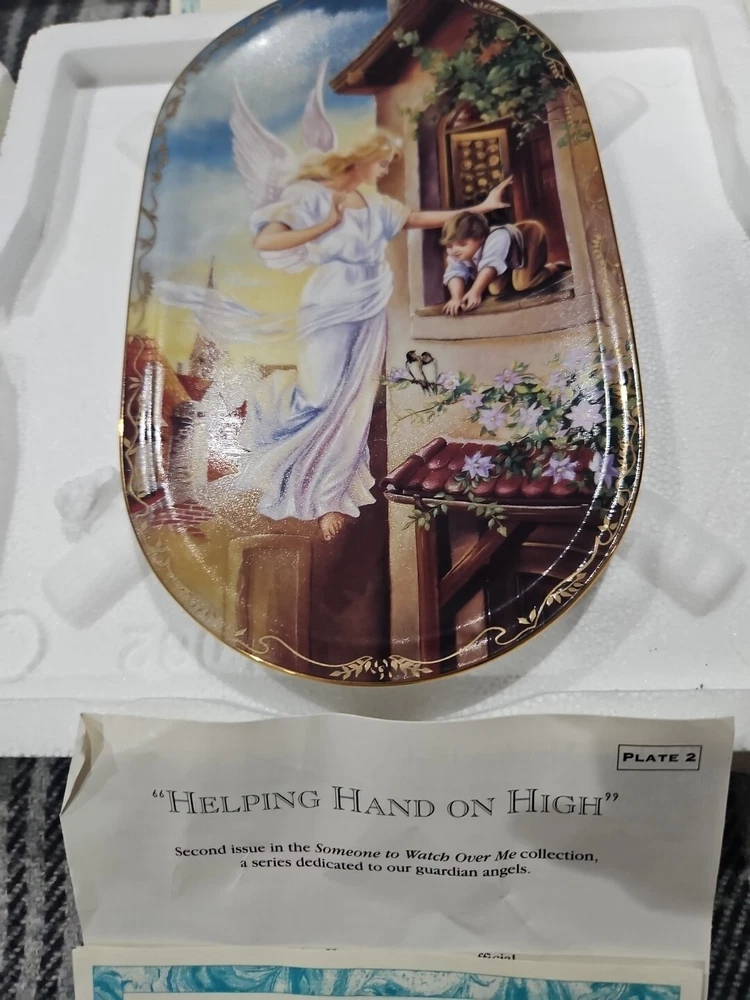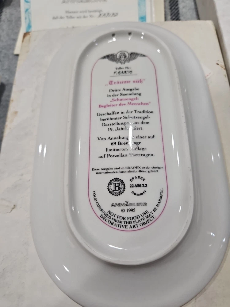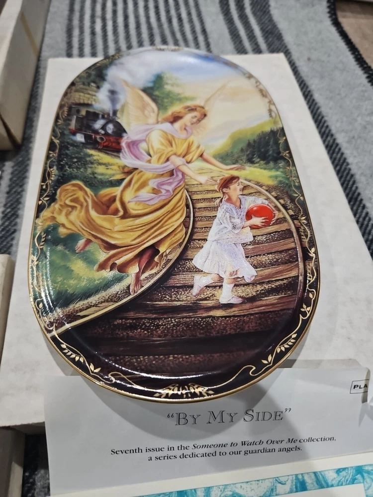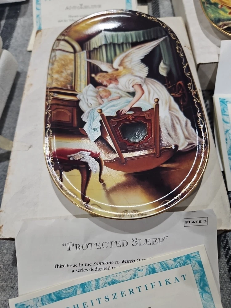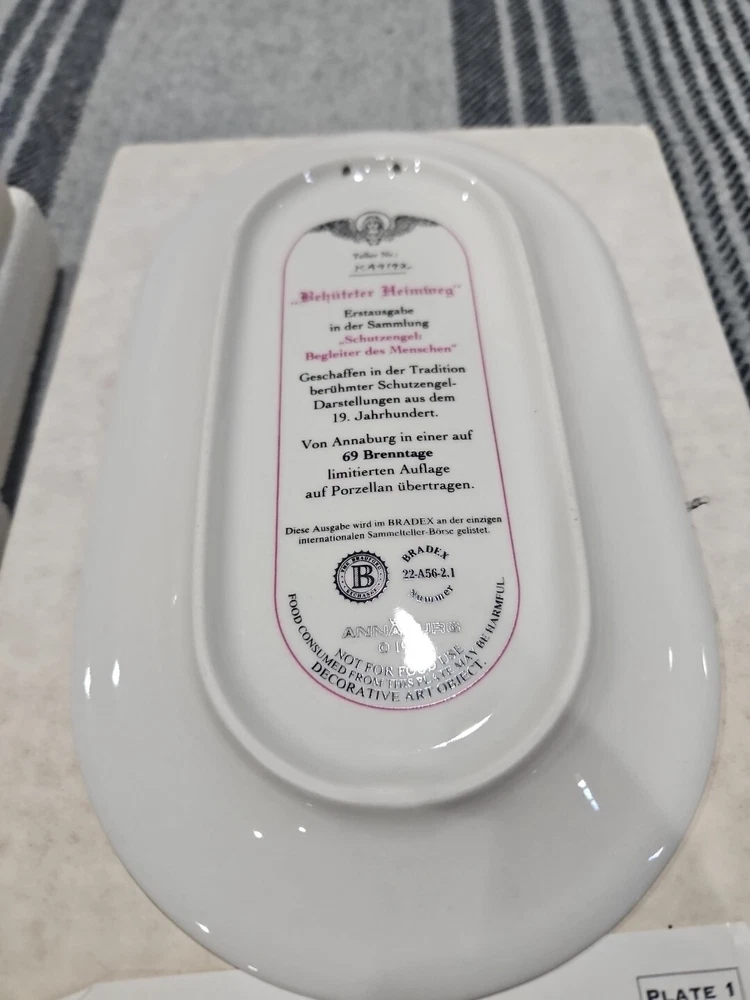 This set of seven oval collector plates from the 1995-96 Bradford Exchange features the beautiful and intricate Guardian Angel design. Made of high-quality porcelain, these plates showcase the artistry of German pottery from the late 20th century. The multicolor design is perfect for any collector or enthusiast, and the vintage production technique adds to their unique charm. The plates are perfect for display or for use as a decorative piece. The ANNABURG brand is known for its quality and attention to detail, making these plates a must-have for any collector. Add them to your collection today! Like new. Great new collection for your China.