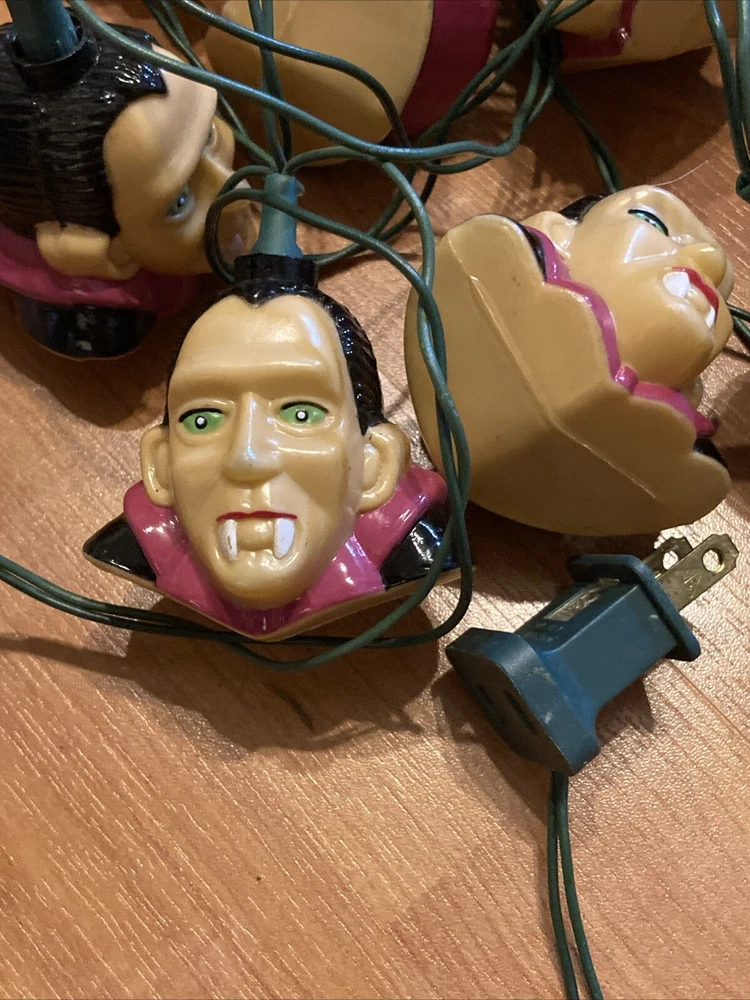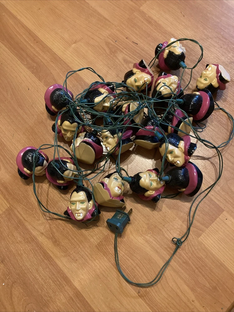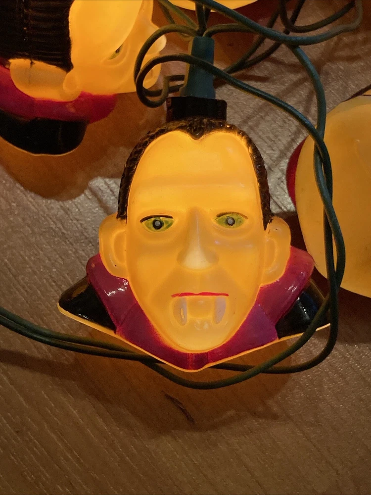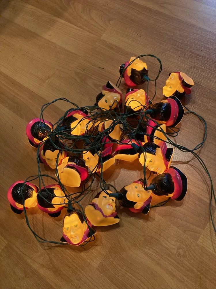 Add some spooky ambiance to your Halloween decor with this vintage 1996 Dracula vampire blow mold string light pumpkin from Pumpkin Hollow. The 20-light string features a multicolor design and is powered by corded electric, making it suitable for both indoor and outdoor installation areas. The Dracula design is perfect for Halloween and any other occasion where you want to add a touch of creepiness to your decor. This original and authentic collectible is a must-have for any Halloween enthusiast.