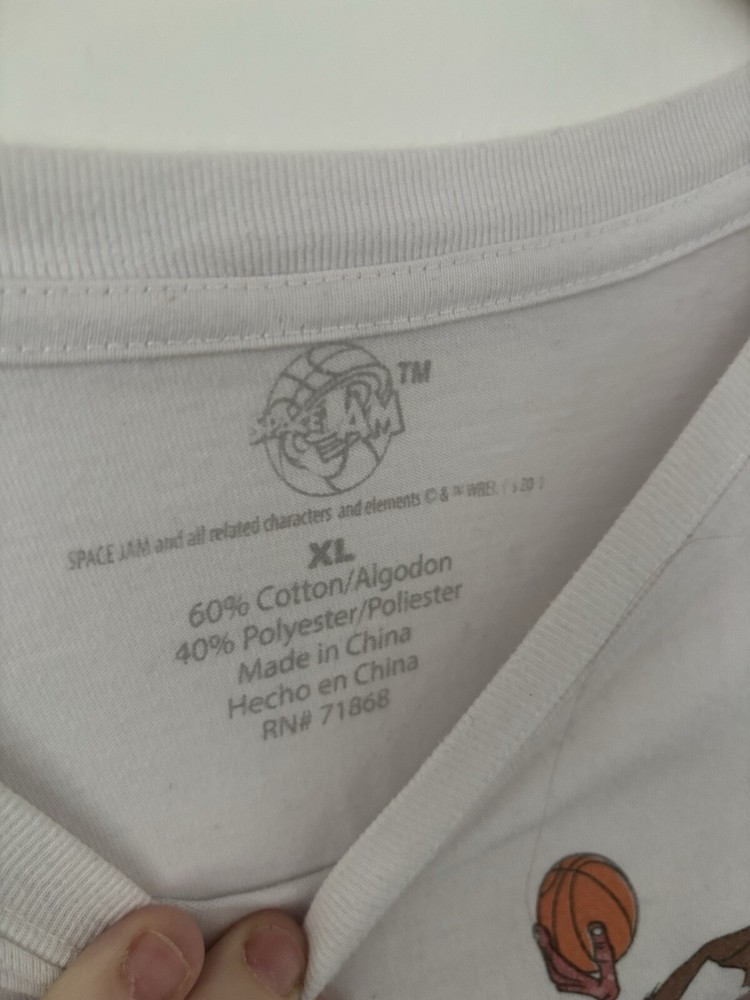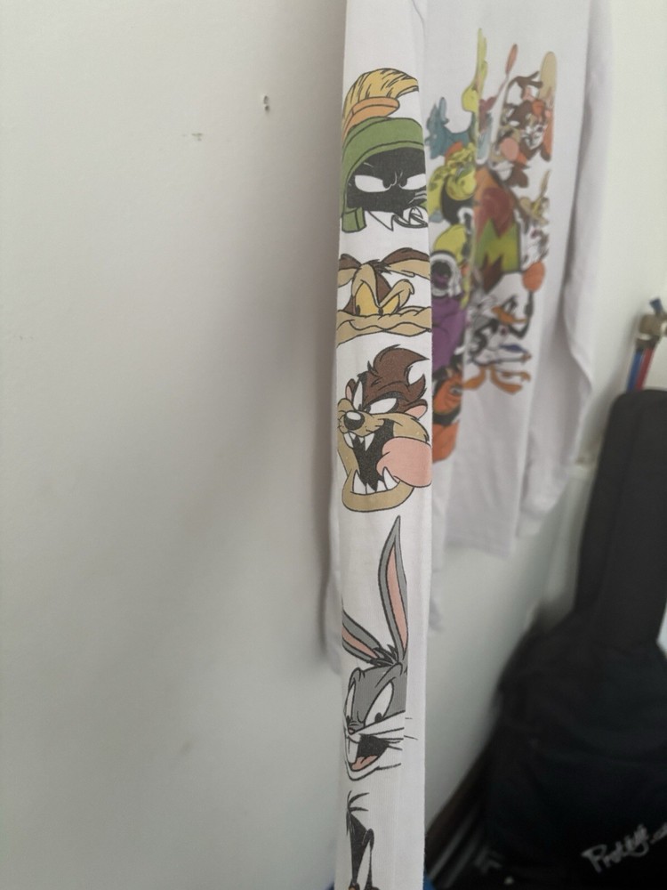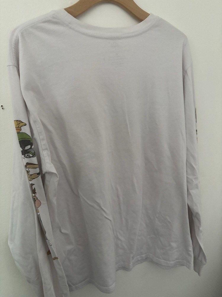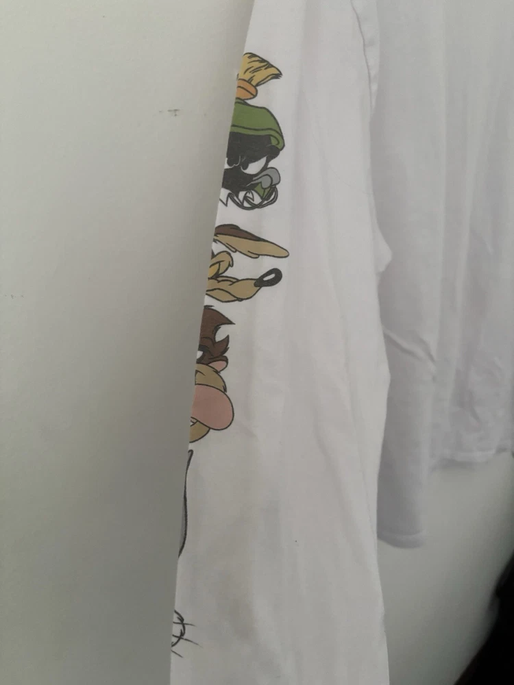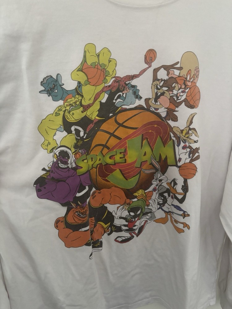 This is a vintage 1996 Space Jam Looney Tunes shirt featuring a white long-sleeve design. The shirt is made for regular size men and is size XL. It features the characters Michael, Bugs Bunny, and Daffy Duck from the Looney Tunes franchise. The shirt is perfect for fans of Space Jam and Looney Tunes, and it is a great addition to any cartoon-themed collection.