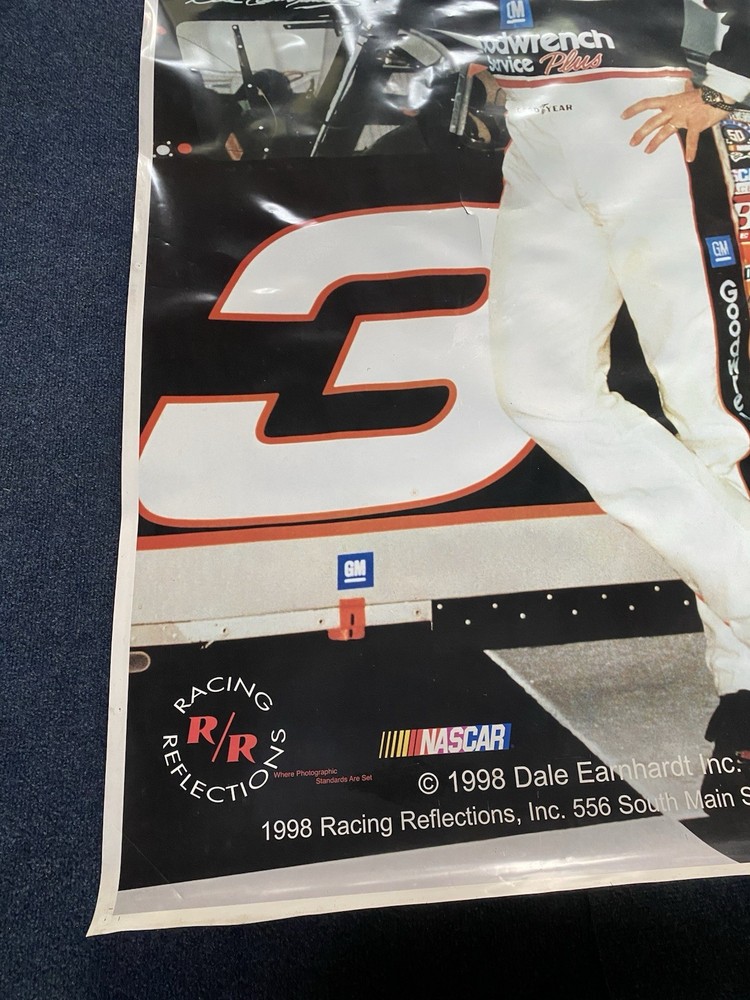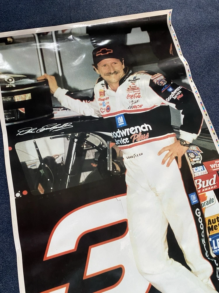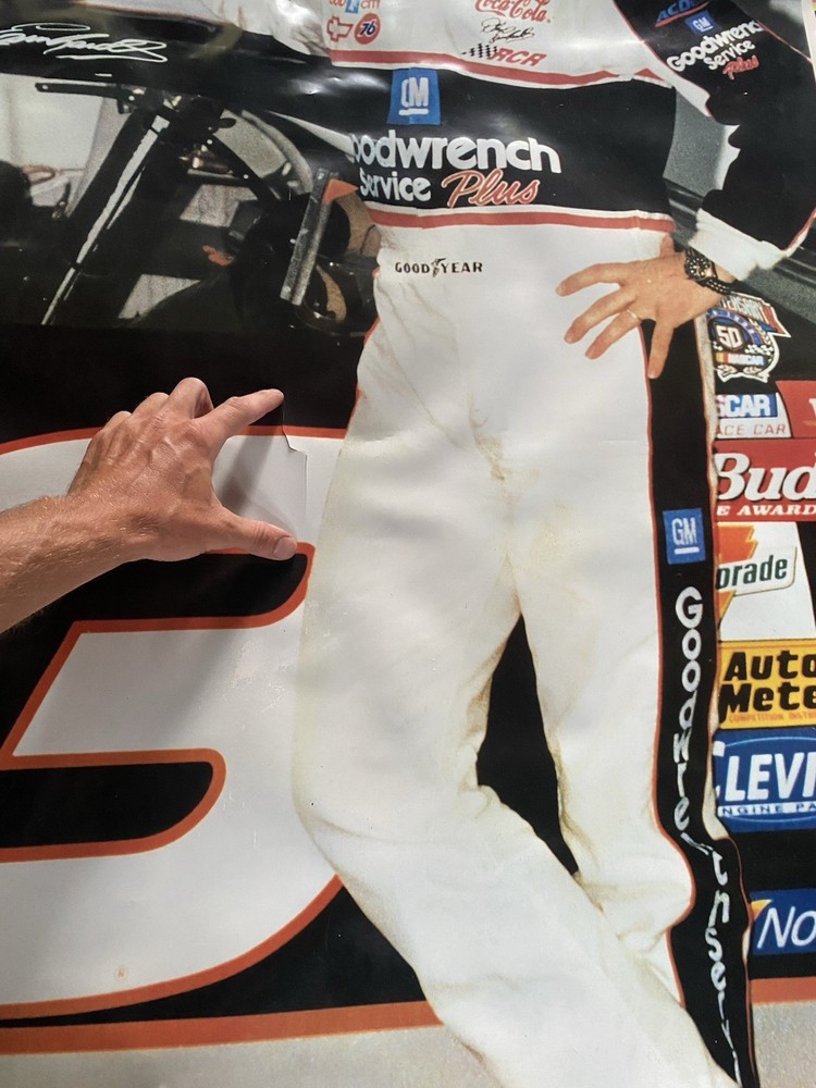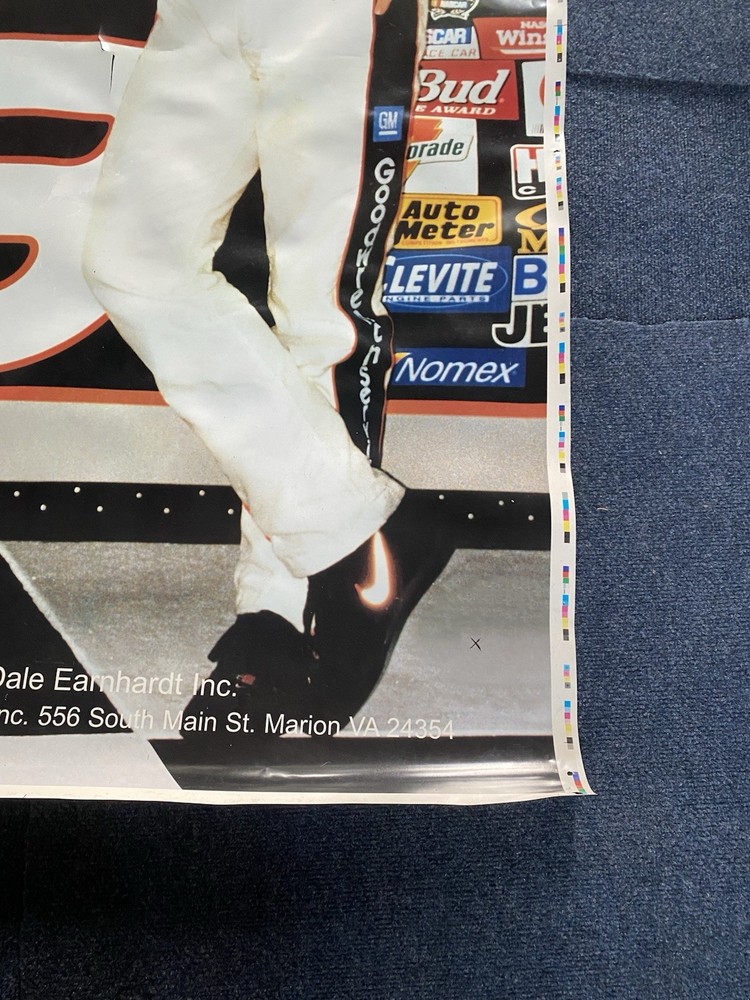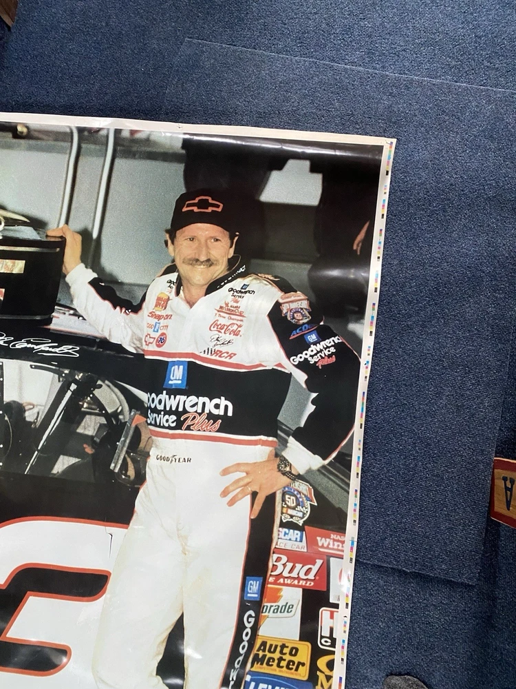 Raise H3ll & praise dale. This is a large 62”x34” pre-owned poster of “The Intimidator”. Overall it is in good to fair condition but has flaws. At closeup viewing there is a tear in the middle near the #3, please view the photo where I show that. Also there is a discolored spot near the number 3, also in the photos. And, there are some minor signs of being pre-owned, overall such as curled corner, holes in the corner where it was tacked to the wall, minor spots of dirt near the border, etc. None of this is excessive, but is there. No tattering, no soiled spots, no grease marks, no damage that really sticks out except for the tear in the middle. It’s a sick poster, and ships safely in a poster tube.