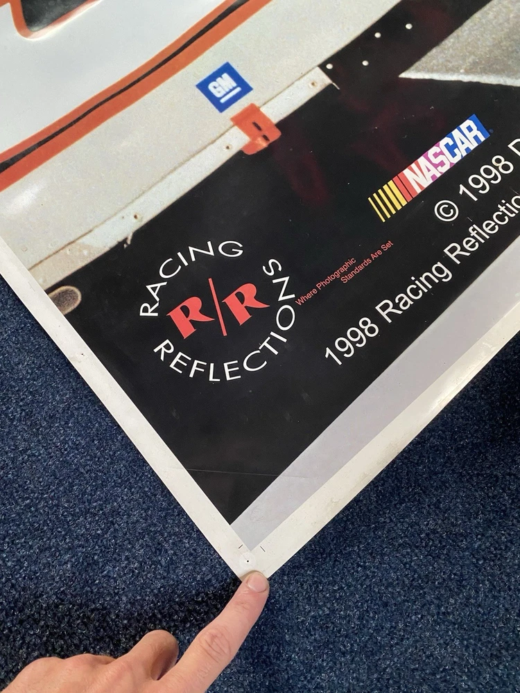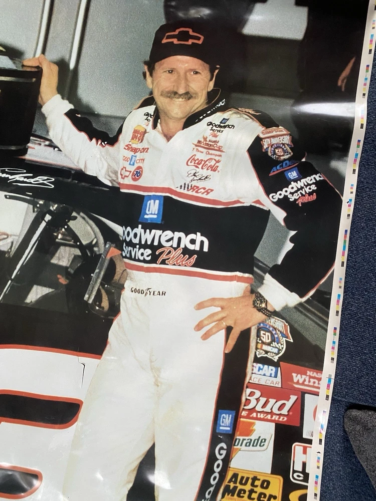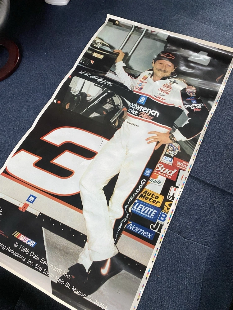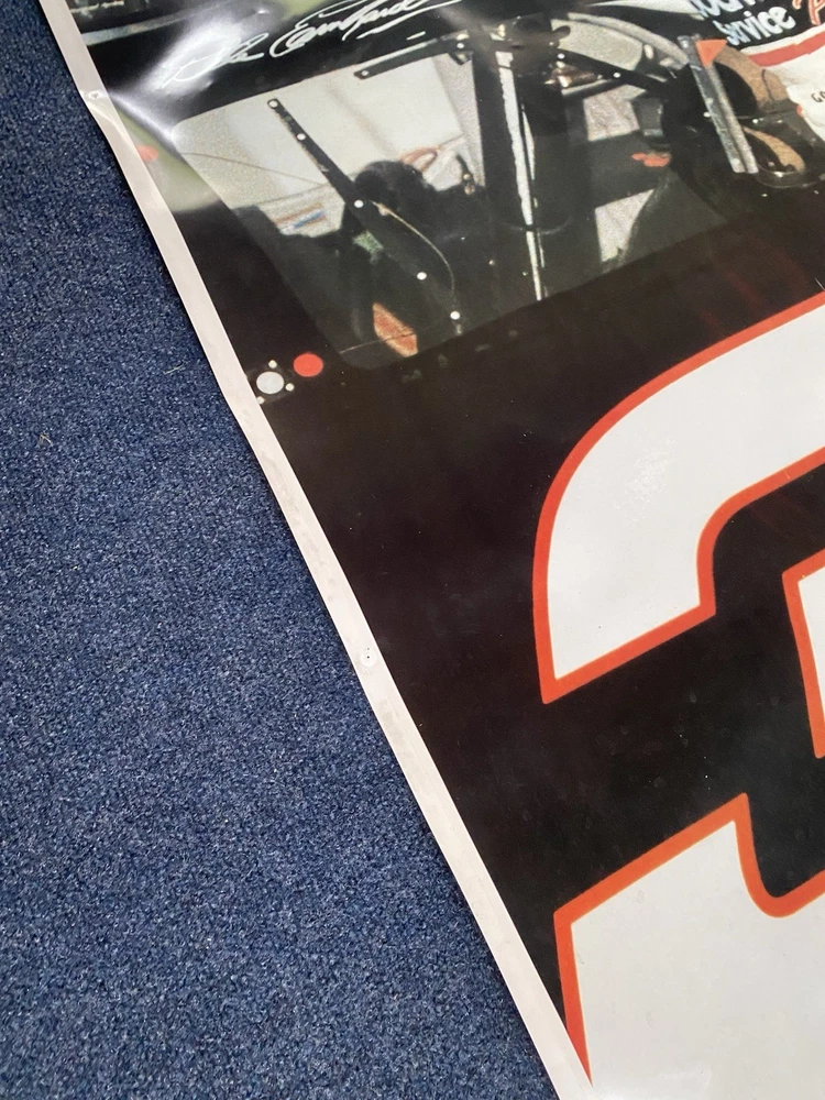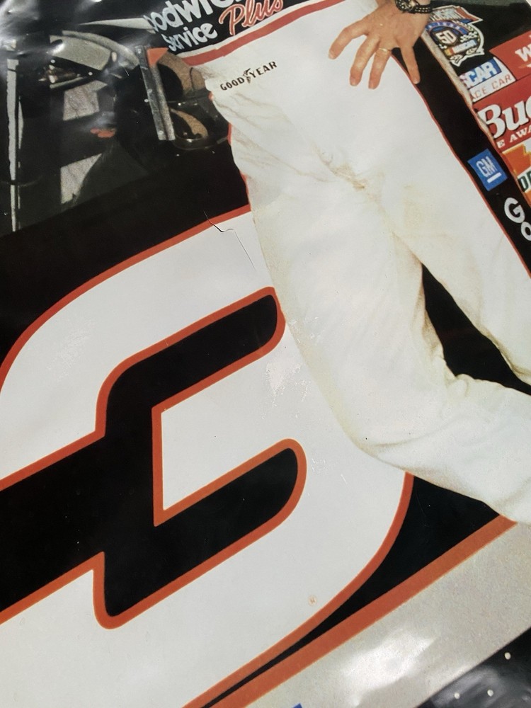 Raise H3ll & praise dale. This is a large 62”x34” pre-owned poster of “The Intimidator”. Overall it is in good to fair condition but has flaws. At closeup viewing there is a tear in the middle near the #3, please view the photo where I show that. Also there is a discolored spot near the number 3, also in the photos. And, there are some minor signs of being pre-owned, overall such as curled corner, holes in the corner where it was tacked to the wall, minor spots of dirt near the border, etc. None of this is excessive, but is there. No tattering, no soiled spots, no grease marks, no damage that really sticks out except for the tear in the middle. It’s a sick poster, and ships safely in a poster tube.