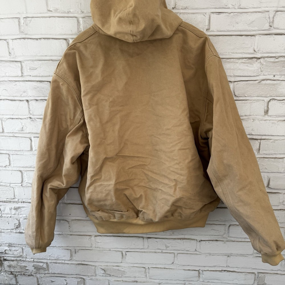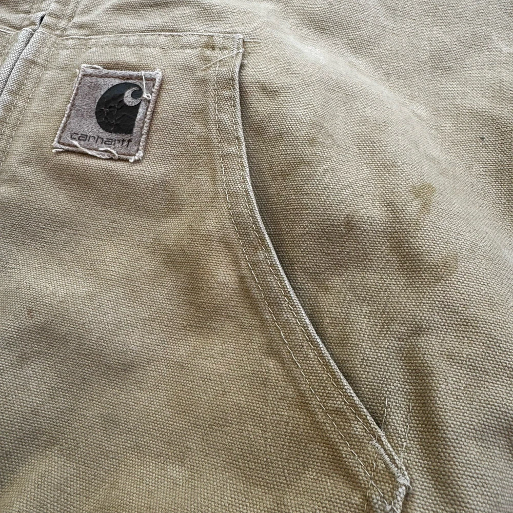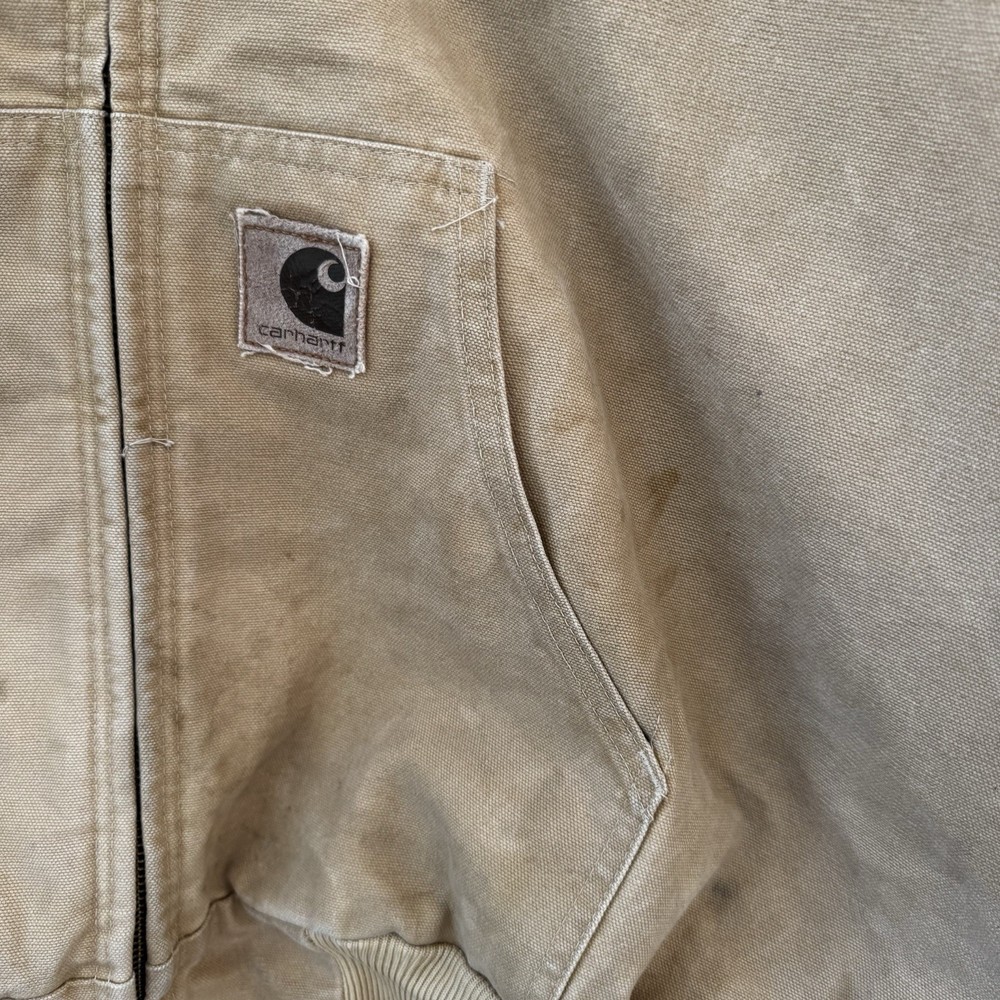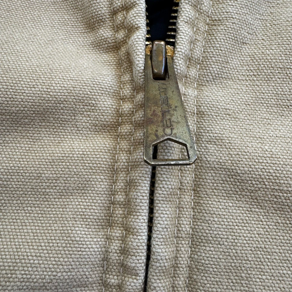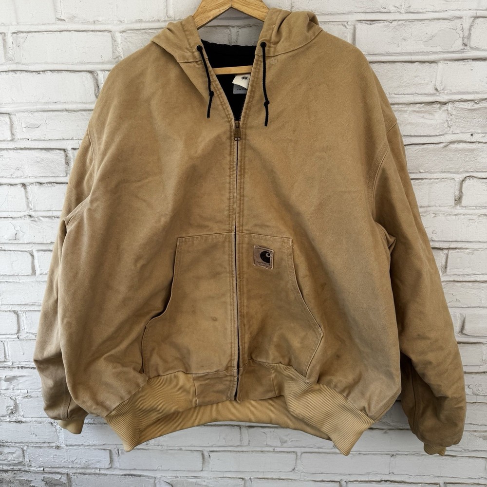 Up for sale is a classic Carhartt work coat in a beautiful beige color. This vintage jacket features a sturdy cotton canvas outer shell, with a quilted nylon lining and polyester insulation to keep you warm. The jacket is hooded, has a button closure, and is designed for regular fit. This Carhartt work coat is perfect for casual occasions, with accents that give it a unique vintage look. It is a USA union made garment, and is available in size 2XL. The jacket is suitable for fall, winter, and spring seasons, and is ideal for hunting and other outdoor activities.