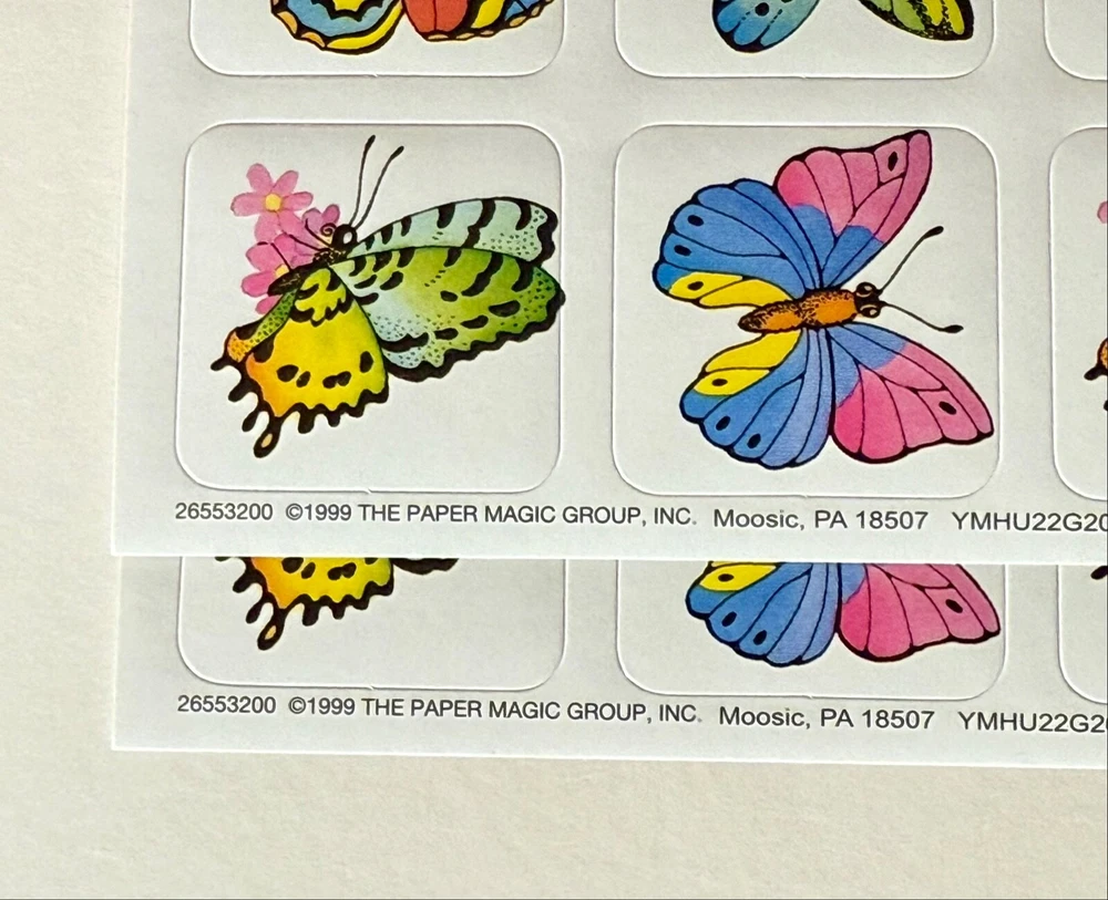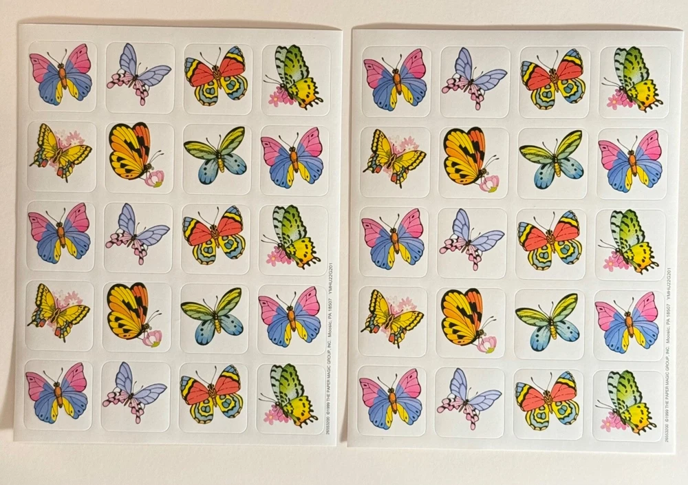 Unearth the Magic of nostalgia with this Vintage 1999 Glossy Sticker Sheet featuring a whimsical butterfly theme. Includes: 2 New Full Sheet Qty. 40 Stickers