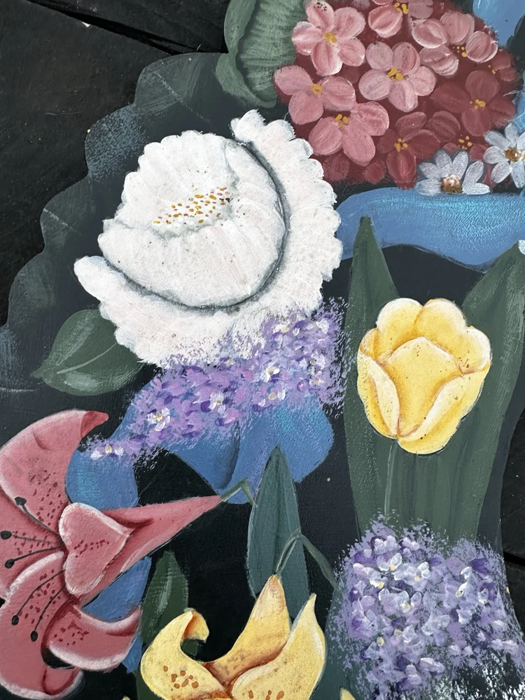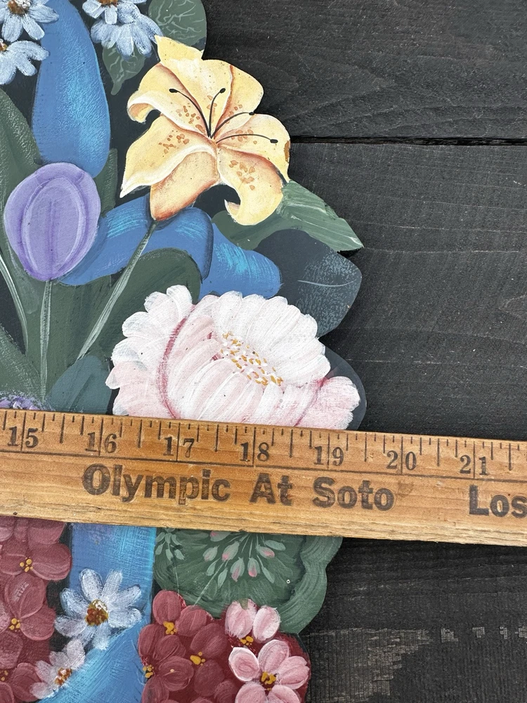 Enhance your home's charm with this vintage 20-inch painted wreath, a delightful blend of floral and rustic elegance. The wreath features an array of vibrant blooms including dahlias, hydrangeas, daffodils, and daisies, meticulously crafted on a durable wooden base. Its multicolored palette adds a festive touch to any space, making it an ideal choice for year-round decoration. Crafted with the West Pattern in 1992, this door decoration brings a shabby farmhouse feel to your living area. Perfect for any occasion, it serves as a versatile and timeless piece that will warmly greet your guests and add a splash of nature's beauty to your doorstep. Rosemary West pattern from 1991. The wreath measures 20” Painted and signed in 1992. Has a few tiny scratches. Please see detailed photos