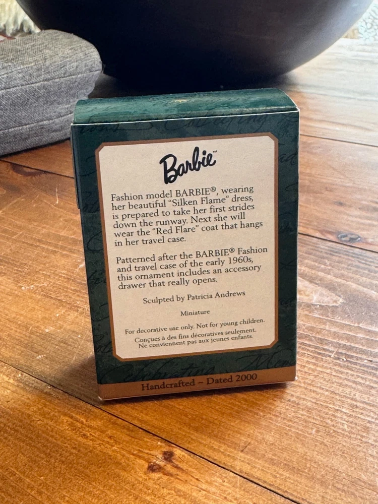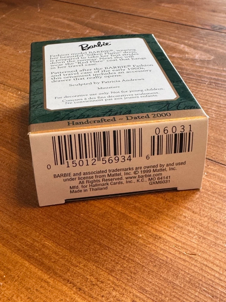 Character: Barbie Silken Flame Theme: Holiday gtin13: 015012569346 Character Family: Barbie UPC: 015012569346 Features: Silken Flame Barbie Design, Includes Travel Case, New in Box (NIB), Vintage 2000 Edition, High-Quality Craftsmanship, Perfect Holiday Keepsake Personalize: No Number of Items: 1 Type: Ornament Brand: Hallmark Shape: Barbie Silken Flame and Travel Case Year Manufactured: 2000 Country/Region of Manufacture: Thailand Occasion: Christmas Department: Adults MPN: Does Not Apply Color: Multicolor
