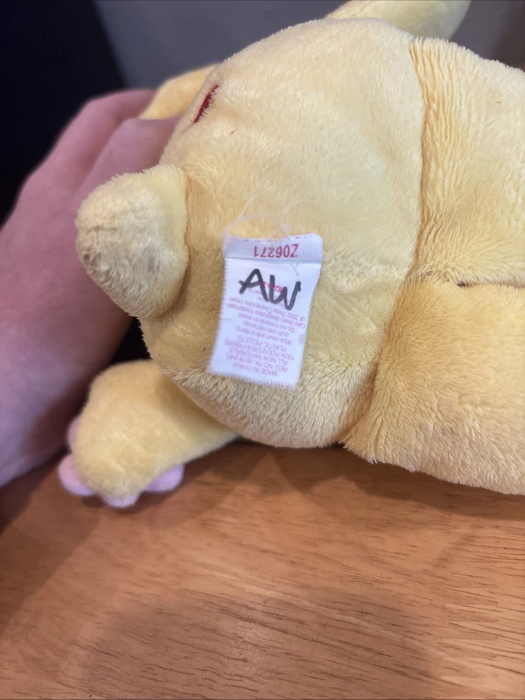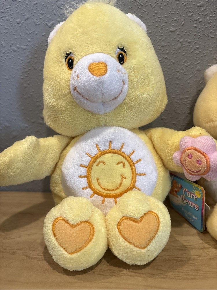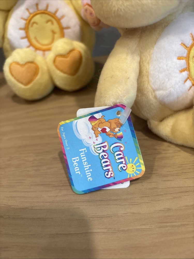 Small one has tags. Big one does not. Big one also has a bit of staining on the back. See photos. Does not talk as well. For collecting and display This Care Bears Funshine plush toy is a must-have for any collector or fan of the franchise. The bear is made of soft fleece material and features a bright yellow color with a happy smiley face. Measuring at 10 inches in size, this original and licensed reproduction toy is perfect for all occasions and would make a great addition to any Care Bears collection. The bear comes from China and was manufactured in 2002, making it a contemporary toy from the 1990s to now. As a single unit sale, this Funshine bear is a great gift for anyone who loves animals or Care Bears. Please see the photos and read the item description carefully before making a purchase.