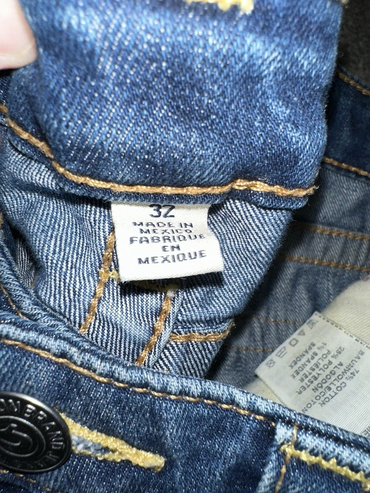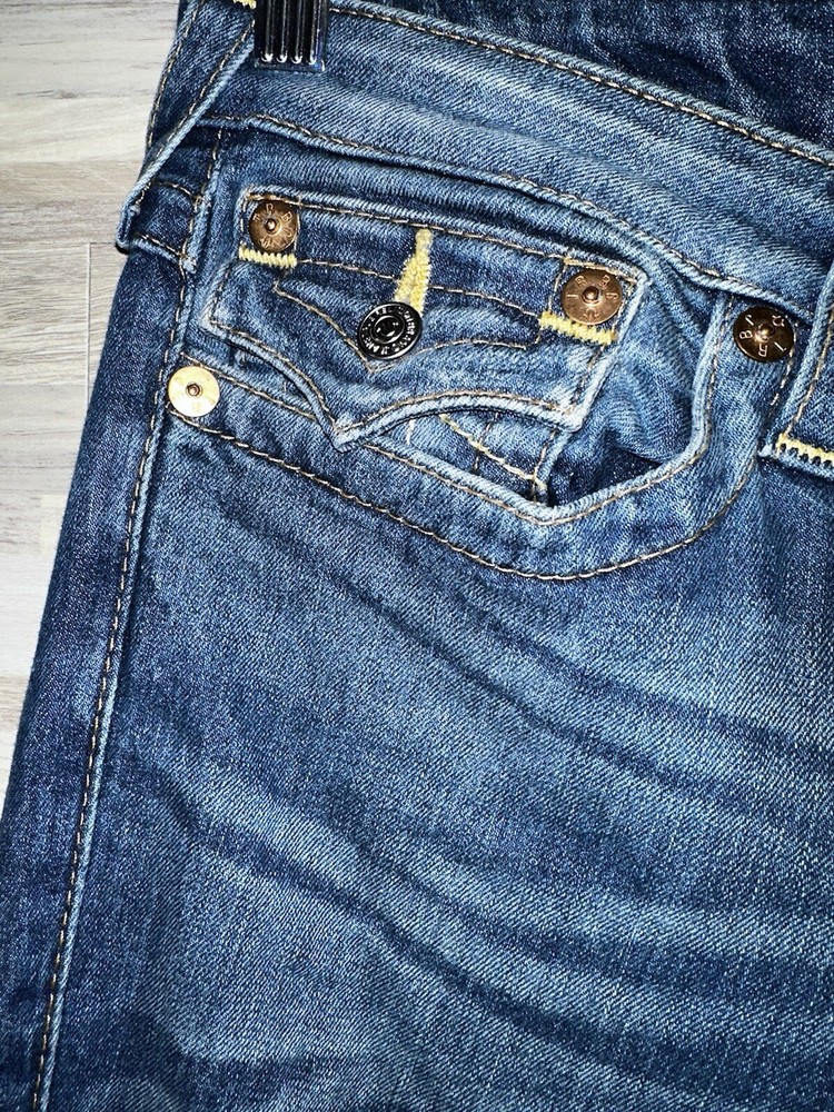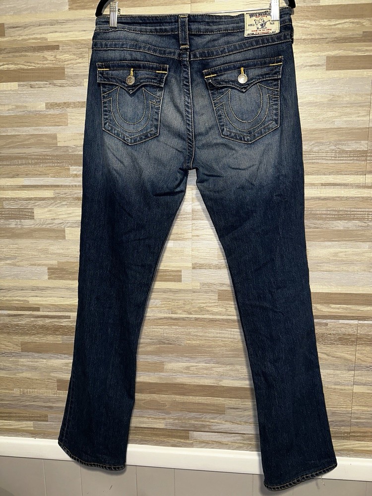 This pair of vintage True Religion jeans is a must-have for any fashion-forward man. The medium wash denim with a solid pattern and button closure is perfect for any season, be it winter, summer, fall, or spring. Made of high-quality cotton with a denim fabric type, these jeans are both comfortable and durable. Featuring a slim straight fit and a 32-inch waist size, these jeans are designed to flatter your figure. The zipper accents, preppy logo theme, and slimming features make these jeans the perfect addition to your wardrobe. Made in the United States in 2003, these jeans are a rare find that will surely turn heads.