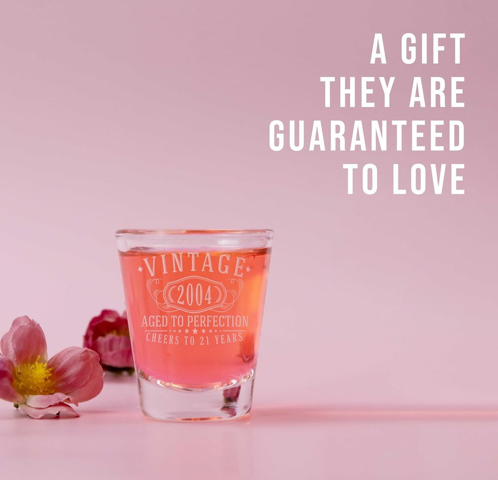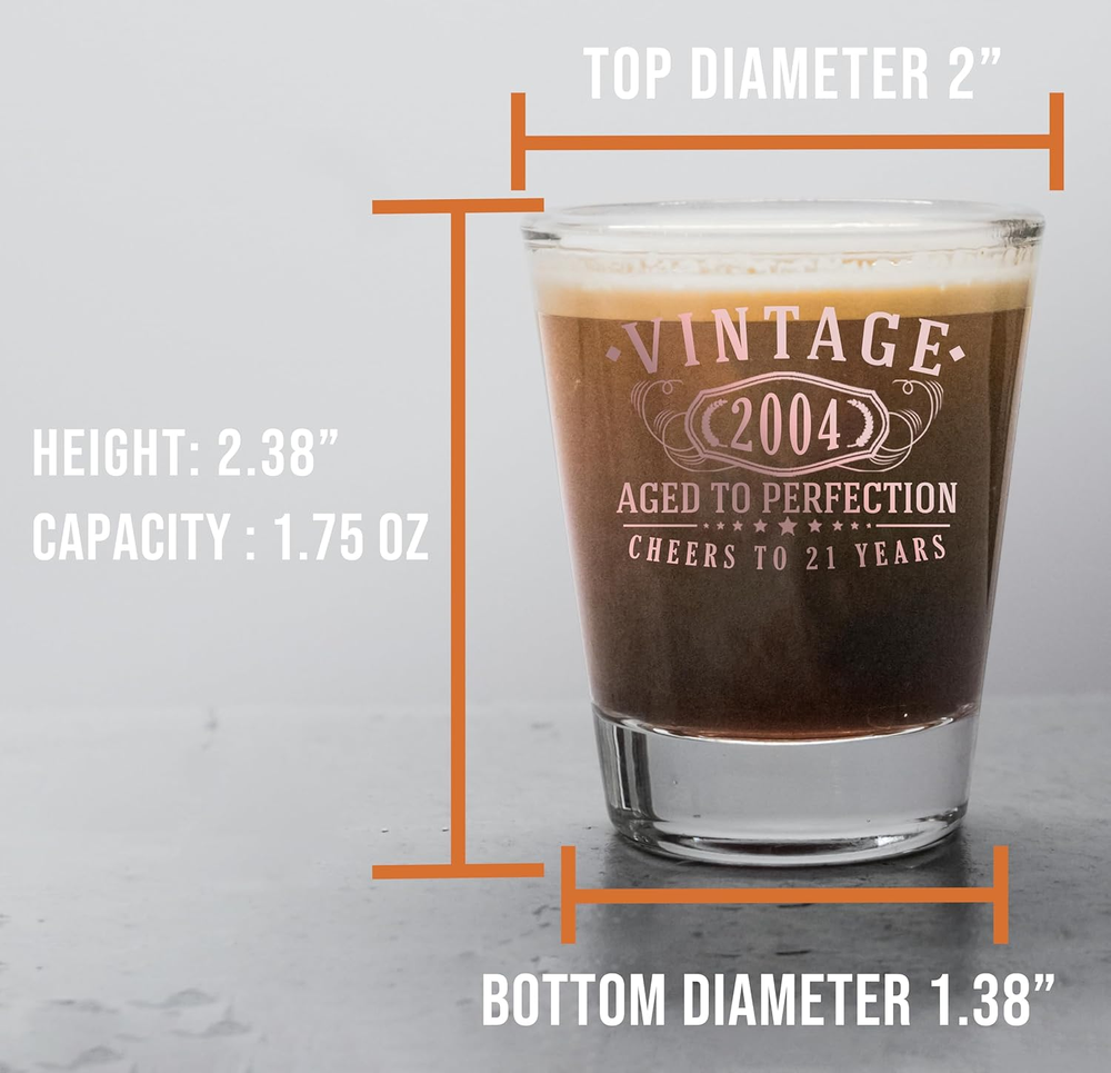 Store New Arrivals Add to Favorite View Feedback Contact Fast deliveries to the customer's home Quality customer service John Make the customers happy! Vintage 2004 Rose Gold Printed 1.75Oz 1Pk Shot Glass - Happy 21St Birthday Gifts Women Men, Cheers to 21 Years, Turning 21 Woman Decorations Decor, Anniversary Bday Party Favors, Best Gift Ideas 1.0 Description This shot glass will hold 1.75 ounces and is a perfect gift for someone who has everything. Mom and Dad are always hard to shop for, or pick up a glass for your brothers, sisters, uncles, aunts, and friends. Everyone will love this shot glass, it’s a gift built to last. Printed design is high quality and dishwasher safe, making these easy to care for. This shot glass with the vintage design is a gift that will make any birthday more special. Height: 2.38 inches, Diameter: 2 inches - Perfect size for a good time with friends and family that enjoy spirits, tequila, vodka, and other liquor. It can also be used as a measuring glass for cocktails. This vintage premium shot glass is made in Fayetteville, Arkansas, by a dedicated local team. We strive to give anyone turning 21 a special way to celebrate. Wish the guy or girl in your life a very happy birthday with this great gift. Gift wrap ready and ideal for lovers of espresso, mixed shooters, and shots. A shot glass makes a playful touch for cake decorations and adds charm to gift baskets. It’s perfect for holding small treats or enhancing dessert presentations with a unique flair. Product Description 21st Birthday Vintage Printed Shot Glass Vintage ‘2004’ Design – The bold, stylish print gives this shot glass a unique, nostalgic look, making it a perfect keepsake for anyone celebrating their 21st birthday in style. Perfect for Gifting – A thoughtful, fun, and practical gift for anyone turning 21. It’s a unique way to celebrate the milestone with something they can cherish. Great for Party Favors & Decorations – Whether used as a toast glass, centerpiece, or party favor, this shot glass adds charm to any 21st birthday celebration. Personalized Shot Glasses Add to Cart Add to Cart Add to Cart Add to Cart Add to Cart Add to Cart Customer Reviews 4.7 out of 5 stars 919 4.7 out of 5 stars 126 4.4 out of 5 stars 67 4.7 out of 5 stars 31 4.9 out of 5 stars 38 5.0 out of 5 stars 11 Price $8.99 $ 8 . 99 $18.99 $ 18 . 99 $18.99 $ 18 . 99 $18.99 $ 18 . 99 $18.99 $ 18 . 99 $18.99 $ 18 . 99 Digitally Printed ✘ ✔ ✔ ✔ ✔ ✔ Pad Printed ✔ ✘ ✘ ✘ ✘ ✘ Personalization Available ✘ ✔ ✔ ✔ ✔ ✔ Multi Quantity Available ✔ ✔ ✔ ✔ ✔ ✔ Full Color Customization ✘ ✔ ✔ ✔ ✔ ✔ Gift Box Available ✘ ✔ ✔ ✔ ✔ ✘ Reusability Reusable Unit Count 1.0 Count Style 2004- Rose Gold Number of Items 1 Color Rose Gold Material Glass Capacity 1.75 Fluid Ounces Theme Birthday Item Weight 4.2 ounces Shape Rectangular Material Feature Dishwasher safe Occasion Birthday Special Feature Dishwasher Safe Product Dimensions 2"W x 2.38"H Included Components Shot Glass ABOUT US We offer the best prices around on high quality products. Our E-store includes media such as books, movies, music and games while offering electronics, toys, sporting apparel, clothing, tools, general home, garden items and more. SHIPPING We are always working hard to ensure your package arrives as soon as possible. Please understand that some factors like weather, high postal traffic, and the performance of shipping companies are outside of our control. We offer free shipping to the lower 48 states and ship within 2 business days of payment, usually sooner. We do not accept P.O. Boxes. Please provide a physical address. For shipping outside of the continental USA, we only use eBay's Global Shipping Program. The item is shipped to KY and then sent to the rest of the world. International customers are responsible for all duties and taxes. Continue to 'check out' to calculate costs for shipping the item to your country. Messages regarding eBay's Global Shipping Program MUST be directed at eBay EXCLUSIVELY. RETURNS We offer a 30-Day Return Policy on items in which you are not completely satisfied with. You have the option of a full-refund or an exchange of the item. No returns are available on items shipped outside of the USA PAYMENT We accept PayPal. CONTACT US This page content is yet to come Please ad us to your favorite seller and visit again later Thank You CUSTOMER SATISFACTION We try our very best to make sure every customer is completely satisfied. If there's a problem, message us! We're happy to help. WE ACCEPT