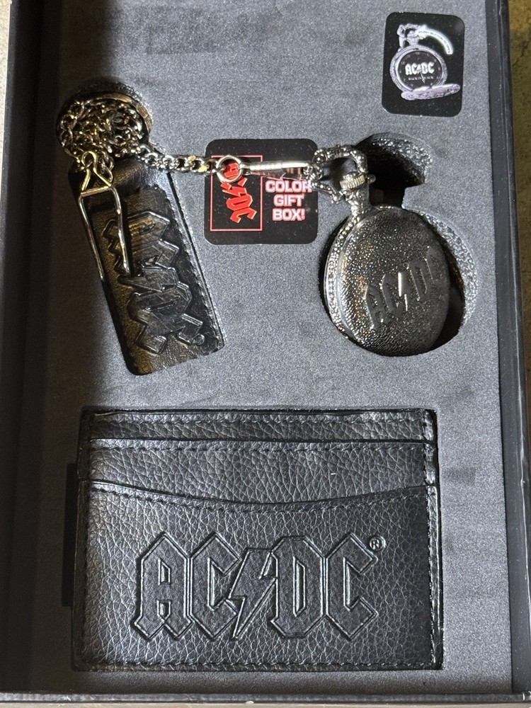 The vintage 2007 AC/DC pocket watch, keychain, and wallet set features a quartz movement and a classic design perfect for casual wear. The pocket watch has a 12-hour dial and is in the style of the iconic rock band AC/DC, making it a unique and stylish accessory. With its analog display and unisex appeal, this set is sure to be a standout piece for any AC/DC fan or watch enthusiast looking to add some rock 'n' roll flair to their collection.