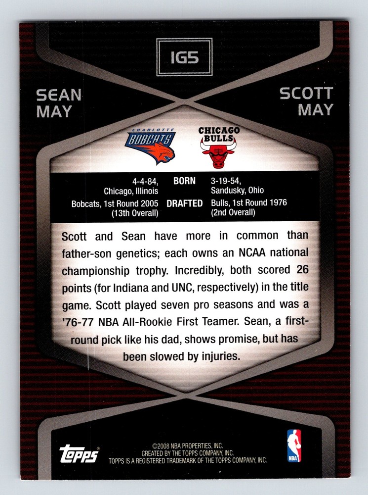 Item Description Title: Scott May Sean May Chicago Bulls Topps 2008 Basketball Card IG5 Description: This unique sports trading card features Scott May and Sean May, capturing a legendary father-son duo associated with professional basketball. Scott May, known for his time with the Chicago Bulls, was a prominent player in the 1970s, earning a spot on the NBA All-Rookie First Team during the '76-'77 season. Sean May followed in his father's footsteps, starting his NBA career with the Charlotte Bobcats after being drafted in 2005. The card, part of the 2008 Topps series, highlights their connection and achievements, both having won NCAA national championships and scoring pivotal points for their respective college teams. The card's design features high-quality images and details on the players' careers, making it a sought-after item for collectors and basketball enthusiasts. MRSP: $5.99 Sport: Basketball Player/Athlete: Scott May | Sean May Season: 2008 Manufacturer: Topps Parallel/Variety: Unknown Set: Topps Basketball 2008 Team: Chicago Bulls League: National Basketball Association (NBA) Card Number: IG5 Counter: 105 Folder: BASKETBALL1224002