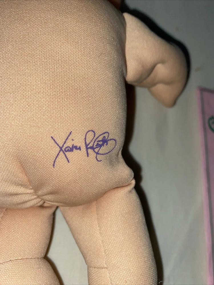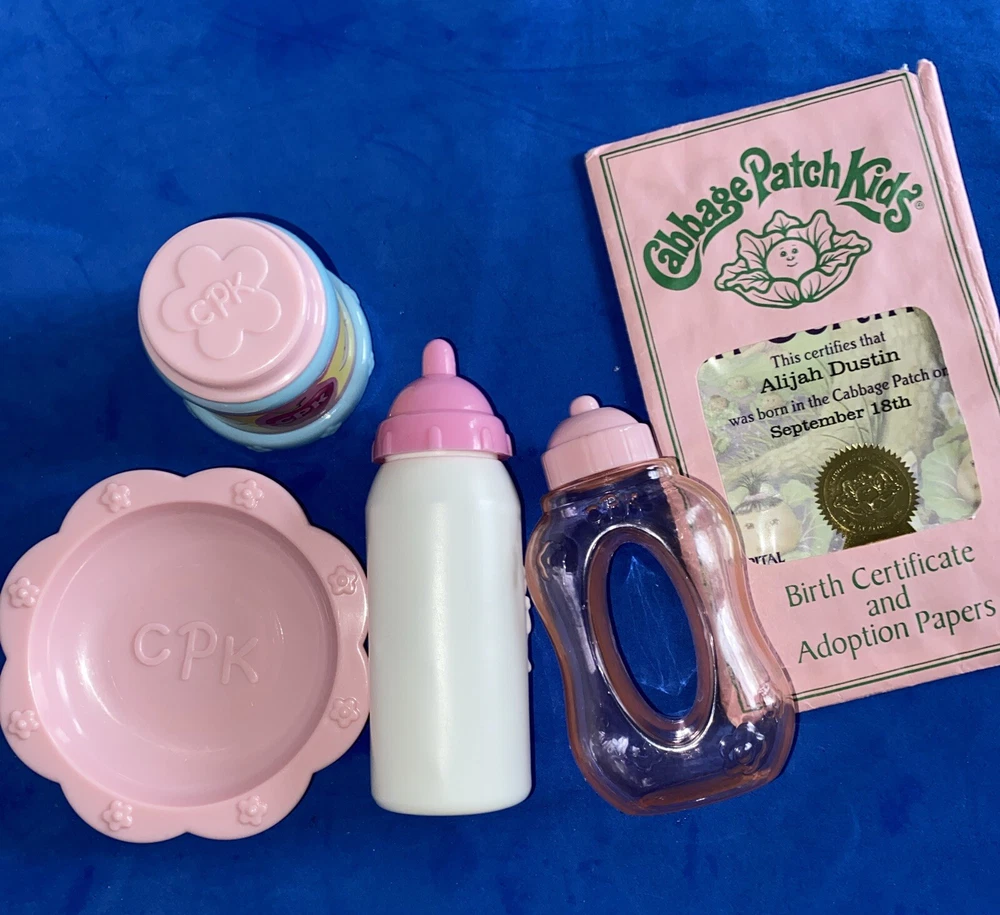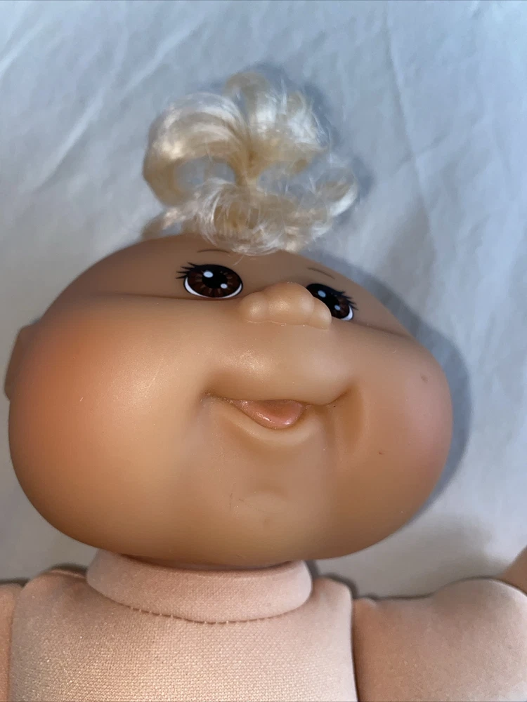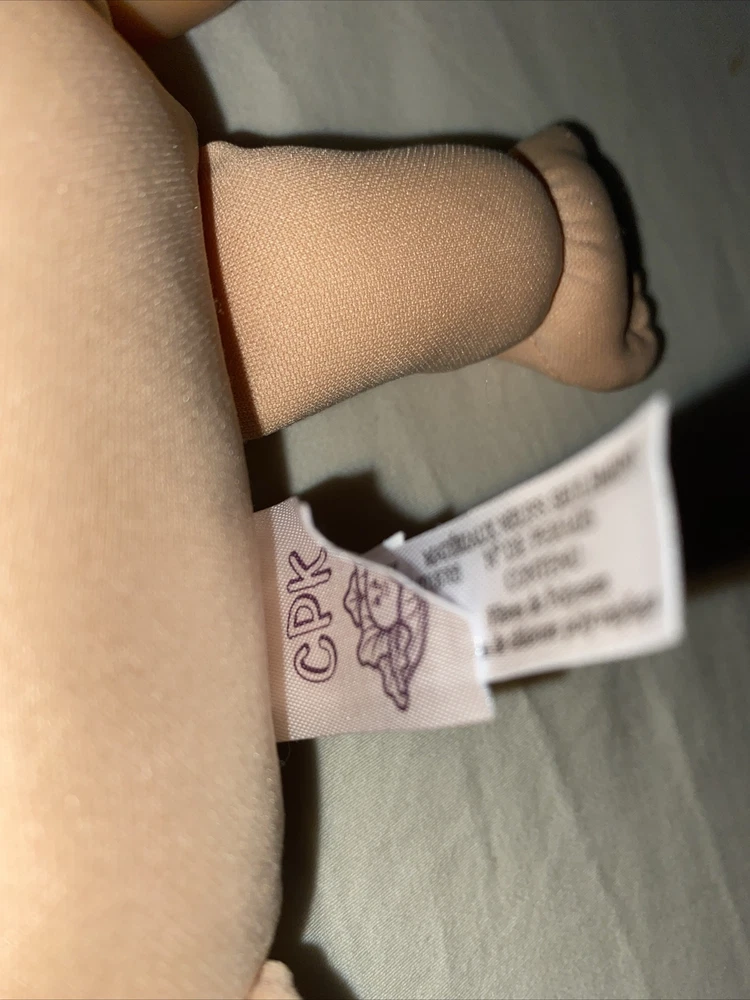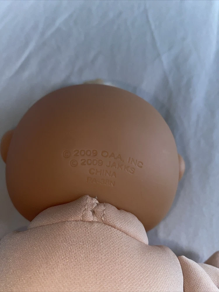 This is a vintage Cabbage Patch Kids baby doll, manufactured in 2009 in China. The doll is a boy with blonde hair, blue eyes, and comes with a diaper. The doll is made of polyester and is part of the Cabbage Patch Kids franchise. The doll is sold without packaging and includes diaper bag yThe doll is Jak’s 2009.