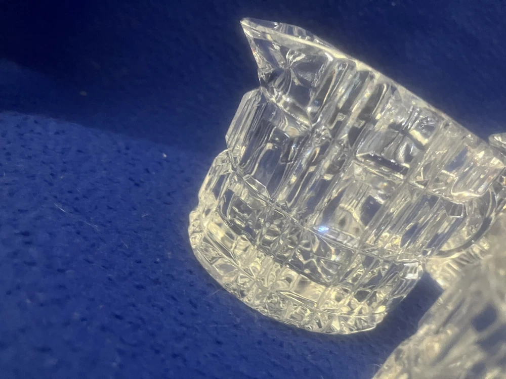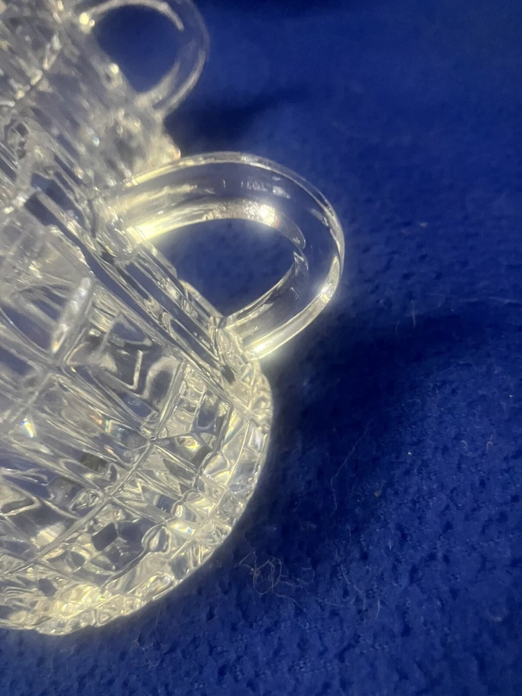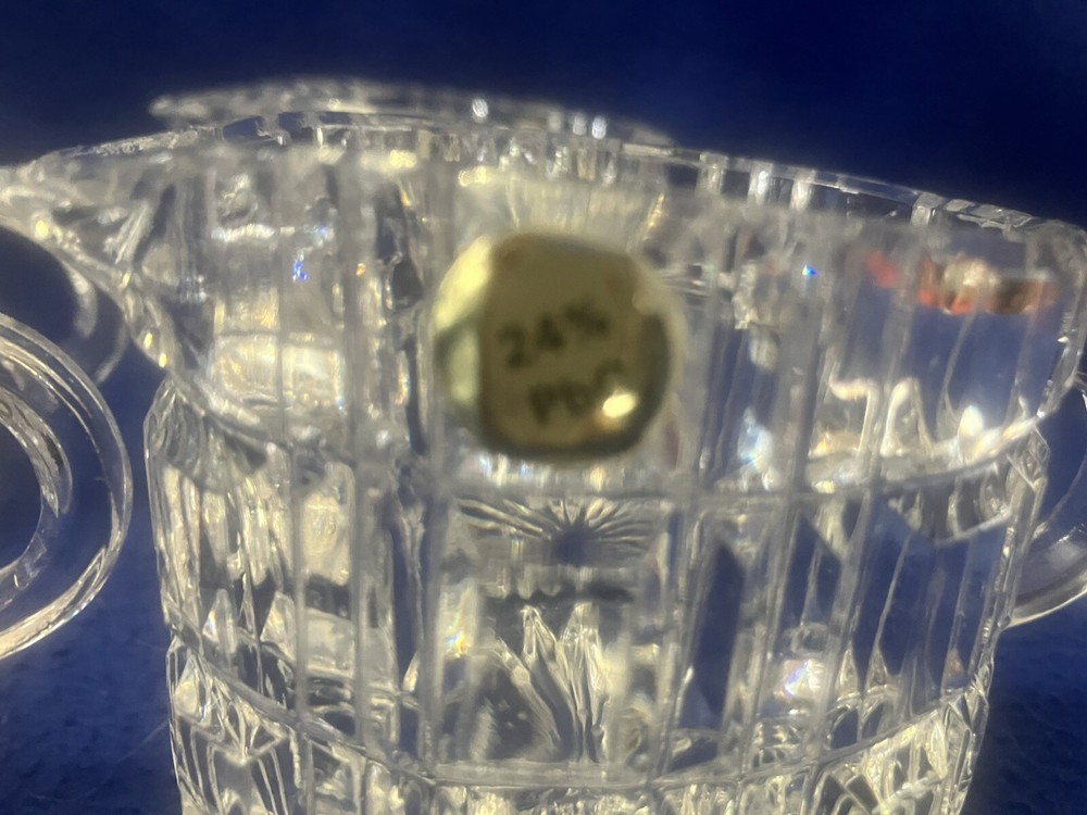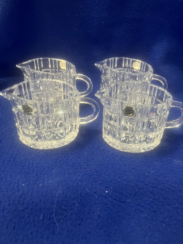 Presenting timeless pieces of elegance: four vintage 24% Lead Crystal Mid Century Modern Creamers, unmarked, featuring a refined oval shape and adorned with a delicate block pattern. Each piece has a gold sticker marked 24% PbO. Each approximately 3.5” in height and 3” long. Use as creamers at individual place settings or to hold cotton or q-tips on vanity or dresser! The sparkle created when light shines through this crystal is just stunning! Perfect for adding a touch of vintage charm to your table or home!