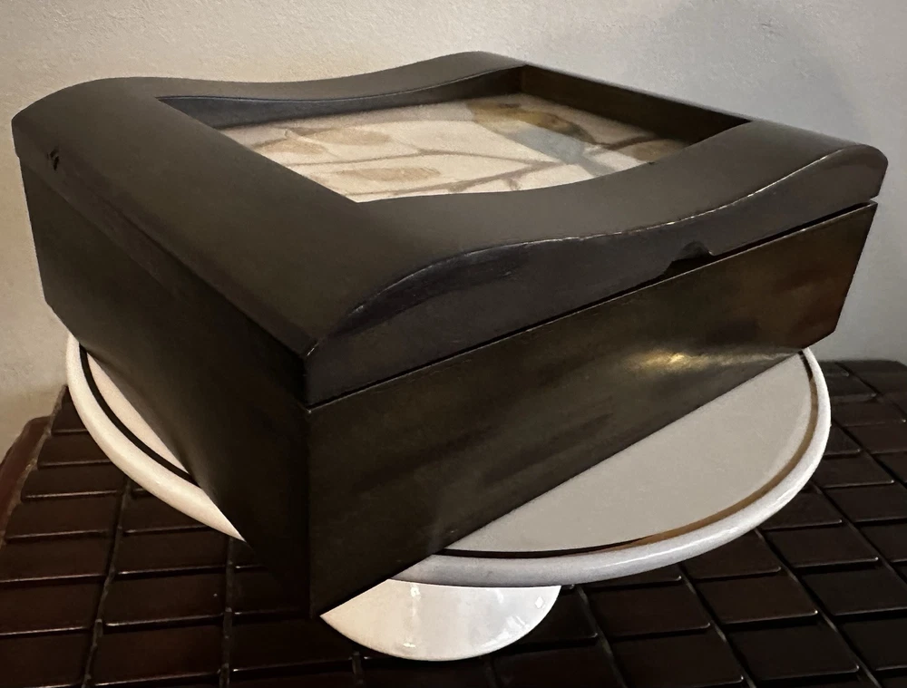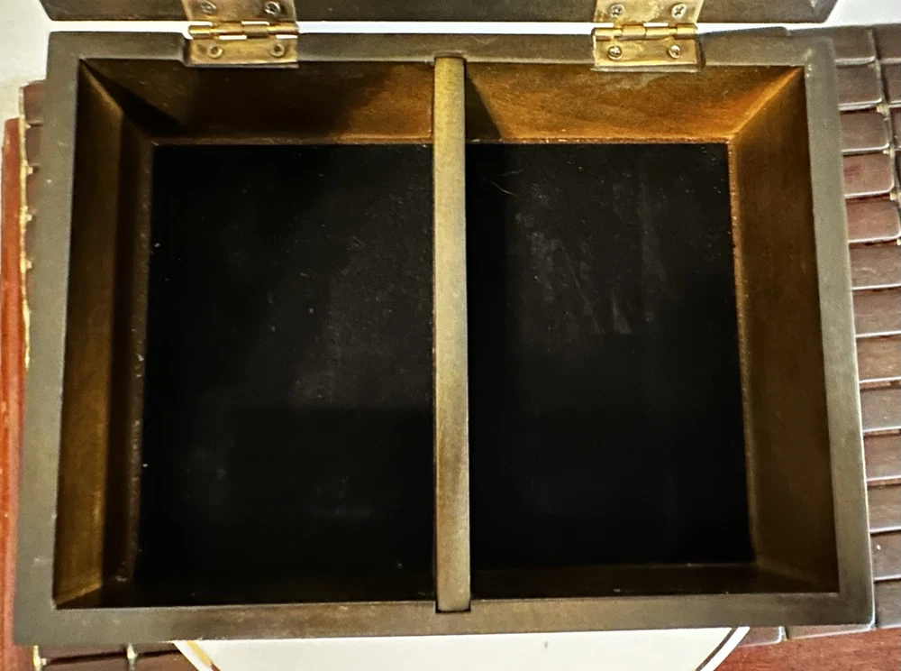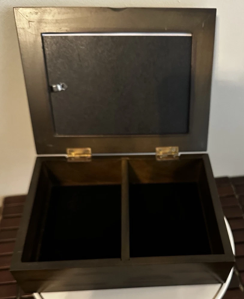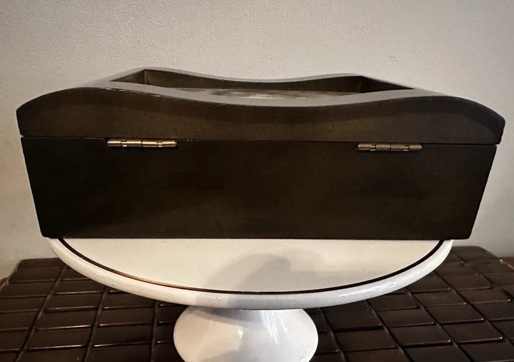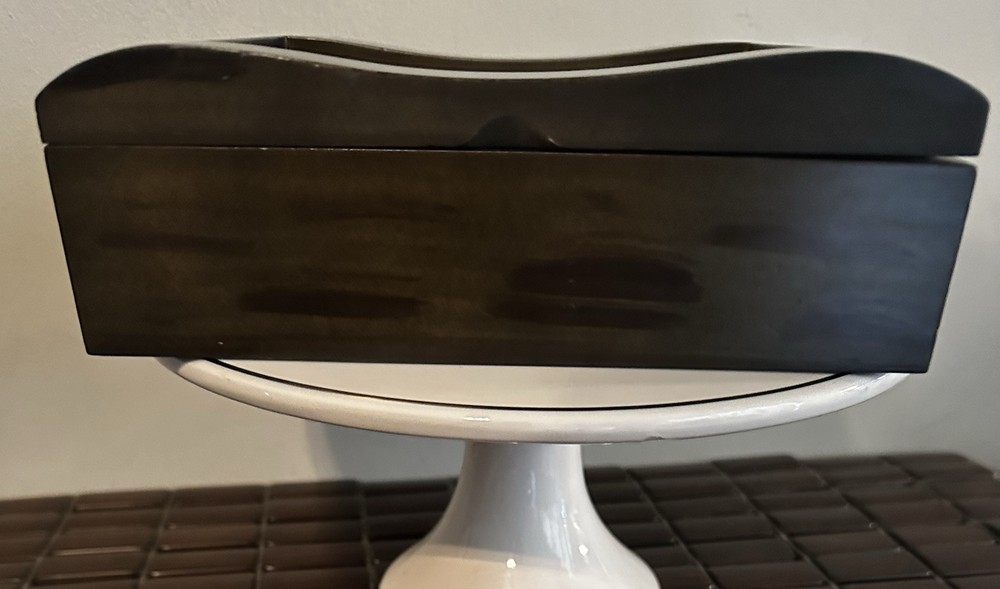 This fantastic Wooden Jewelry/ valet box is sure to match your style because you determine your style. Insert a photo, drawing, Mirror, or any inspirational statement or small poster. Made of beautiful mahogany. Divided into two compartments. Perfect for your jewelry, your wallet, keys, cufflinks - or use for a couple decks of cards or chips. There is plenty of room in this box. Lined with dark velvet. 8”L x 6”W x 2.5”T Great pre owned condition.