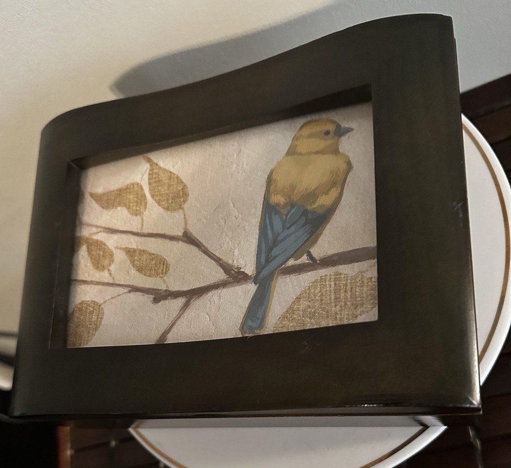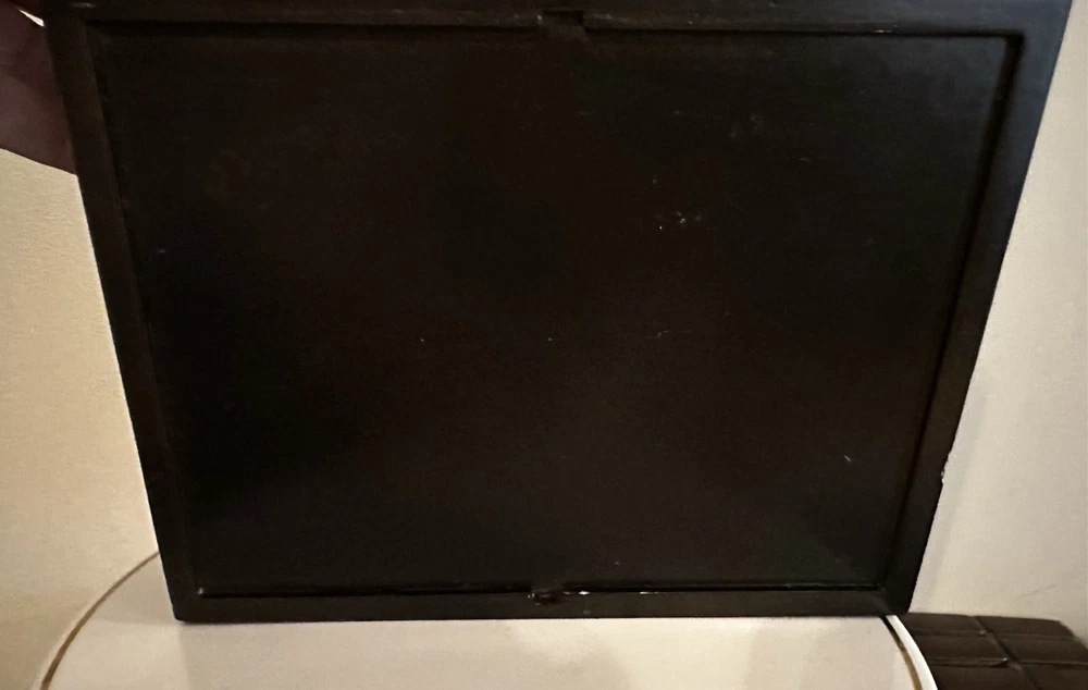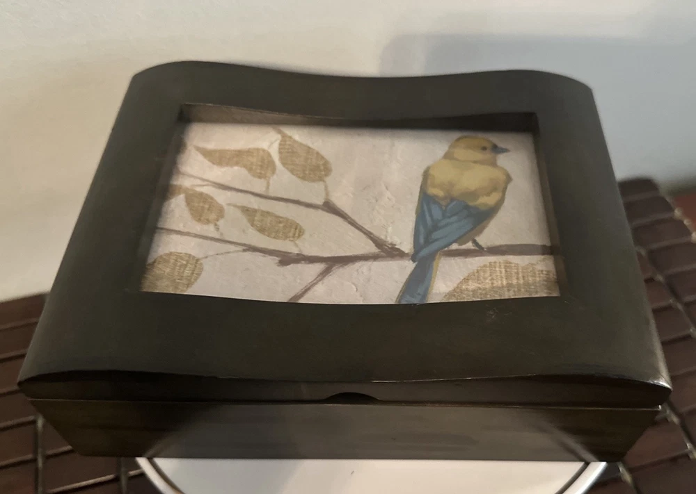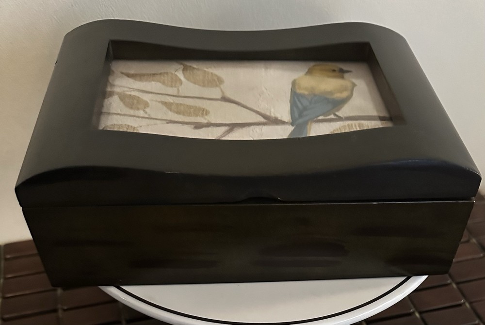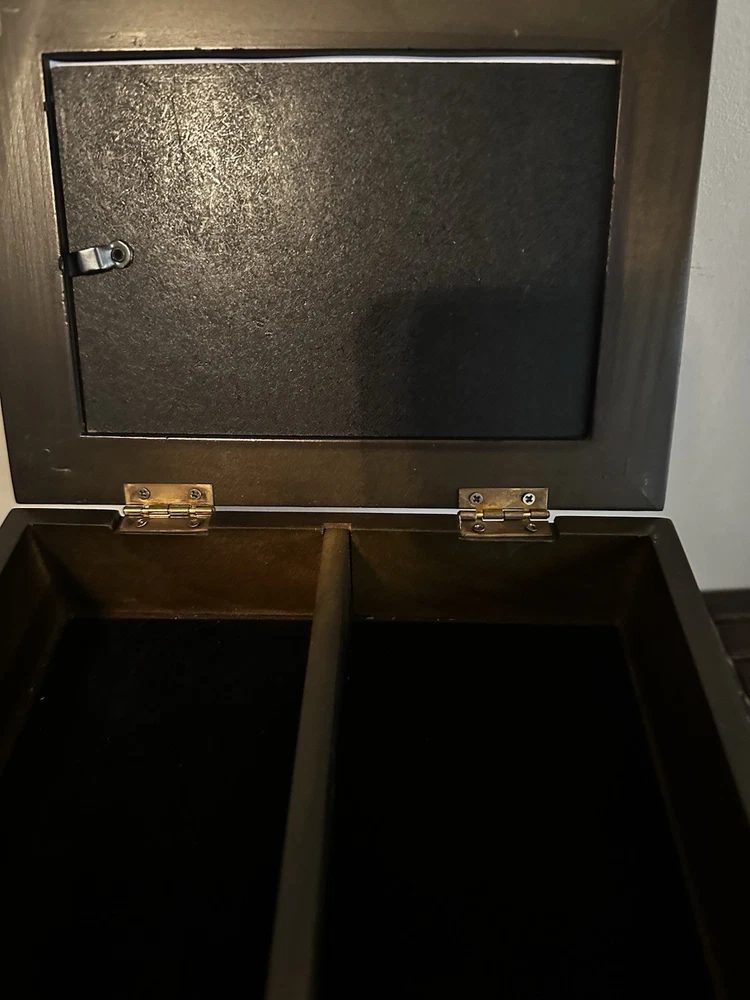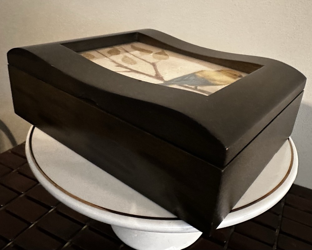 This fantastic Wooden Jewelry/ valet box is sure to match your style because you determine your style. Insert a photo, drawing, Mirror, or any inspirational statement or small poster. Made of beautiful mahogany. Divided into two compartments. Perfect for your jewelry, your wallet, keys, cufflinks - or use for a couple decks of cards or chips. There is plenty of room in this box. Lined with dark velvet. 8”L x 6”W x 2.5”T Great pre owned condition.