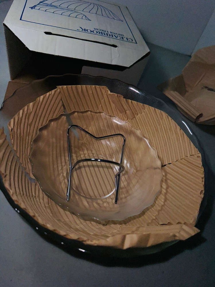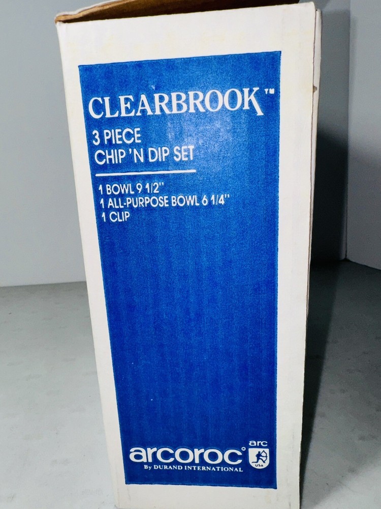 brand new/ open box Vintage 3 PC Chip and Dip Set Durand International for Arcoroc Swirl Pattern USA Made Clearbrook 3 Piece Chip'N Dip set. A great chip and dip set for entertaining. Pretty swirl pattern. Includes: 1 Bowl - 9 1/2" 1 All purpose bowl - 6 1/4" 1 Clip to attach both bowls together