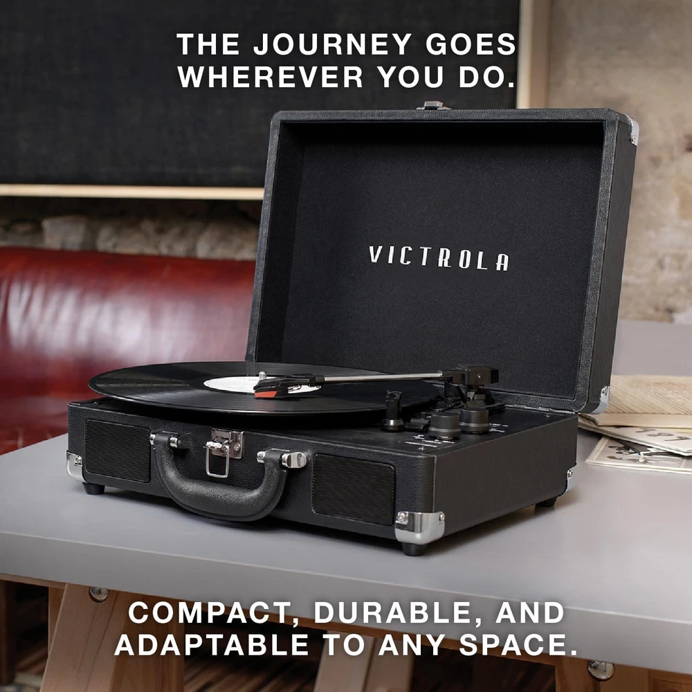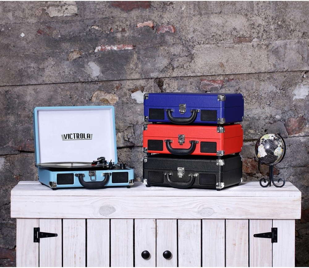 Store New Arrivals Add to Favorite View Feedback Contact Vintage 3-Speed Bluetooth Portable Suitcase Record Player with Built-I Description Item model number VSC-550BT-COB Style Record Player Color Cobalt Blue Is Discontinued By Manufacturer No Product Dimensions 13.9 x 5 x 10.1 inches Material Plastic Country of Origin China Compatible Devices Headphone, Smartphone, Speaker Item Weight 5.5 Pounds Connectivity Technology Wireless, Wired Model Name Vintage 3-Speed Bluetooth Portable Suitcase Record Player with Built-in Speakers Special Feature Built-In Bluetooth Receiver Included Components Bluetooth Record Player THREE SPEED BELT-DRIVEN TURNTABLE - This 3-speed (33 1/3, 45, 78 rpm) suitcase record player features UPGRADED PREMIUM SOUND QUALITY and sits on sound isolating feet that prevent vibration. It is perfect for your living room, bedroom or office. TAKE YOUR TUNES ANYWHERE - Housed in a vintage suitcase with an easy carry handle, Victrola's blend of retro and contemporary design give you the ultimate flexibility to listen to music where you want and how you want – a great choice for vinyl lovers. Clean only with a dry cloth EXPANDED CONNECTION OPTIONS - Stream smartphone audio through the turntable’s built-in Bluetooth speakers. Easily connect external speakers via the stereo RCA outputs, or use the Line input for non-Bluetooth devices like a CD player. For personal listening, connect your headphones to the headphone jack. NO STEREO SYSTEM OR EXTRA EQUIPMENT REQUIRED. Get it up and running in minutes. Retro looks combined with the convenience of modern technology makes this affordable record player ideal for beginners & vintage enthusiasts ALL THE CONTROLS YOU NEED - Features an Input select knob, Power/Volume Knob & an Auto stop switch that stops spinning records once the record is finished playing. A RECORD PLAYER THAT SUITS YOUR PERSONALITY - Combined with Victrola’s unparalleled sound quality and exquisite craftsmanship, and a wide range of styles, patterns and colors to choose from, get ready to create lifelong music memories The Victrola portable suitcase record players classic design lets you take your tunes anywhere! A portable design with convenient carry handle, 3-speed belt driven turntable and built-in Bluetooth speakers seamlessly play smartphone audio for all to enjoy! Additional features include a custom tuned Pre-Amp for improved audio clarity and bass performance, 3.5mm Aux-In, RCA outputs, and a headphone jack - all great features to enjoy your music at home or on the go! ABOUT US We offer the best prices around on high quality products. Our E-store includes media such as books, movies, music and games while offering electronics, toys, sporting apparel, clothing, tools, general home, garden items and more. SHIPPING We are always working hard to ensure your package arrives as soon as possible. Please understand that some factors like weather, high postal traffic, and the performance of shipping companies are outside of our control. RETURNS We offer a 30-Day Return Policy on items which you are not completely satisfied with. You have the option for a full-refund or an exchange of the item. PAYMENT We accept PayPal. CONTACT US This page content is yet to come Please ad us to your favorite seller and visit again later Thank You CUSTOMER SATISFACTION We try our very best to make sure every customer is completely satisfied. If there's a problem, message us! We're happy to help.