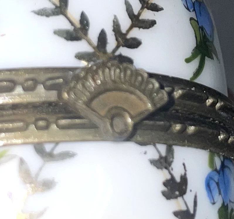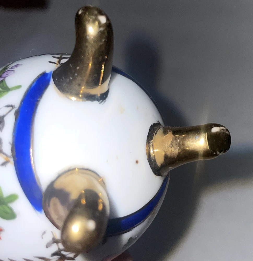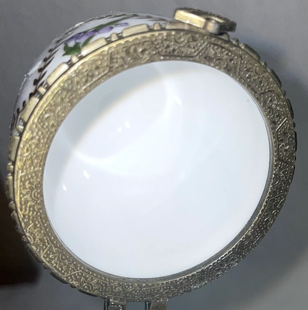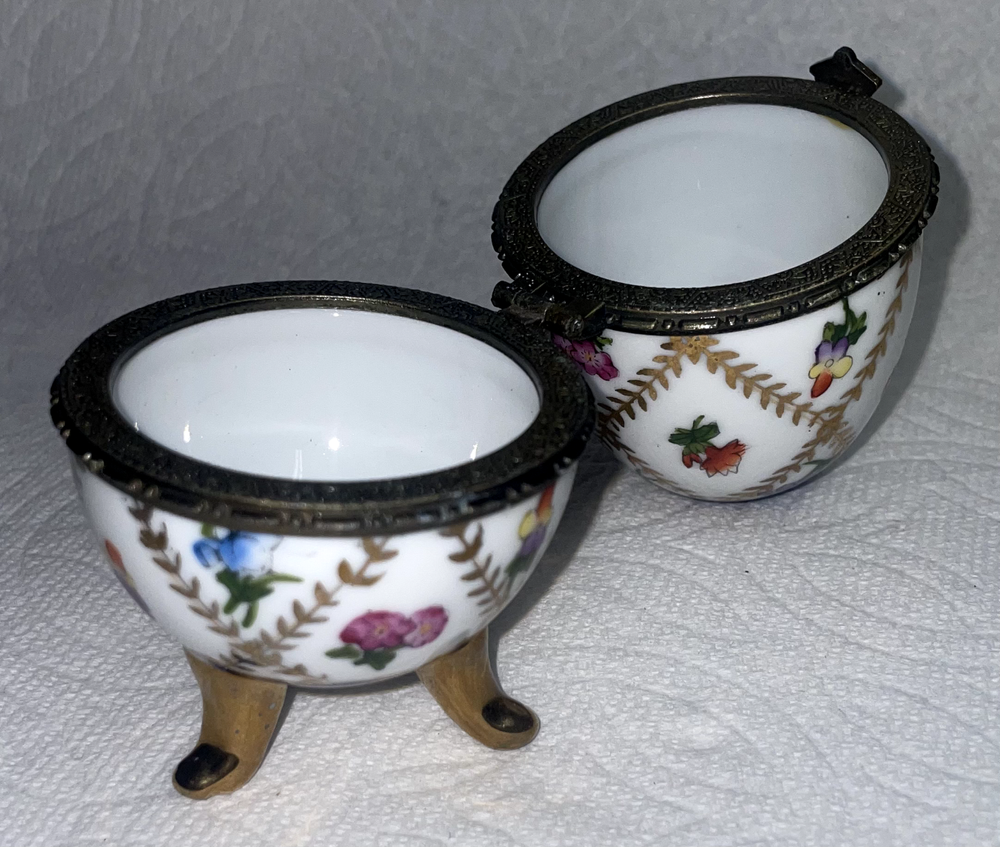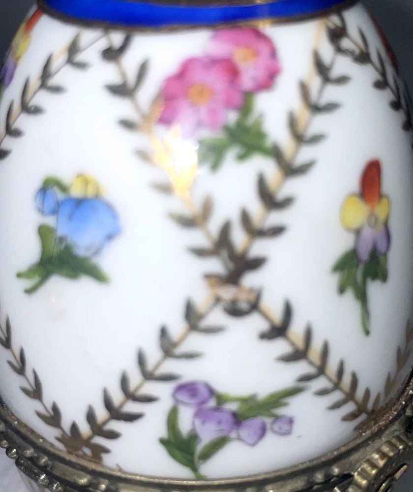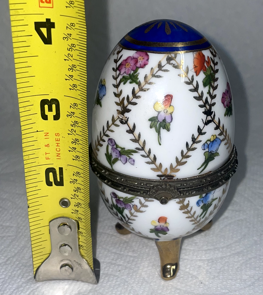 Hinged Porcelain tri-Footed Egg Shaped Trinket Box Pre-owned, no chips or cracks. No back stamp or origin. The egg shaped trinket box has 3 legs hand painted gold gilt. The unit measures 4 inches high 2" wide. ATTENTION REGARDING SHIPPING !! Shipping costs are expensive. Here is an offer that is hard to refuse. If you buy 2 or more items totaling $50 or more , I will handle the shipping cost (ground) anywhere in the continental United States. The items cannot be listed as having to be shipped alone due to SPECIAL PACKING NEEDS . eBay does not adjust the shipping cost removal from the invoice automatically. I can do it on the final invoice after you have the items in your shopping basket, before you pay. If eBay forces payment before that is done, you will receive a refund of shipping cost made before your package is shipped within the first business day following the transaction. The free shipping offer does not apply to Priority or Expedited shipping, although we can discuss a fair reduction in shipping cost should you desire the shipping upgrade. LOOKING FOR LESS EXPENSIVE SHIPPING? Click on "See details" next to Expedited Shipping Fee above to see other shipping options. eBay calculates the shipping fee based on package size, weight and type of shipping you select. SAVE SHIPPING COSTS! – USE COMBINED SHIPPING Shipping costs are high. The best way to save money on shipping costs is through combined shipping,… purchasing more than 1 item and having them shipped together. The cost per item drops substantially. To do this you MUST NOT pay for items until after the combined shipping cost has been calculated on the invoice. If you pay before this has been done you will end up paying the individual shipping cost for each item, and I am unable to issue refunds for shipping overpayments when this occurs because eBay does not refund the fees they charge me on the refunded amount.