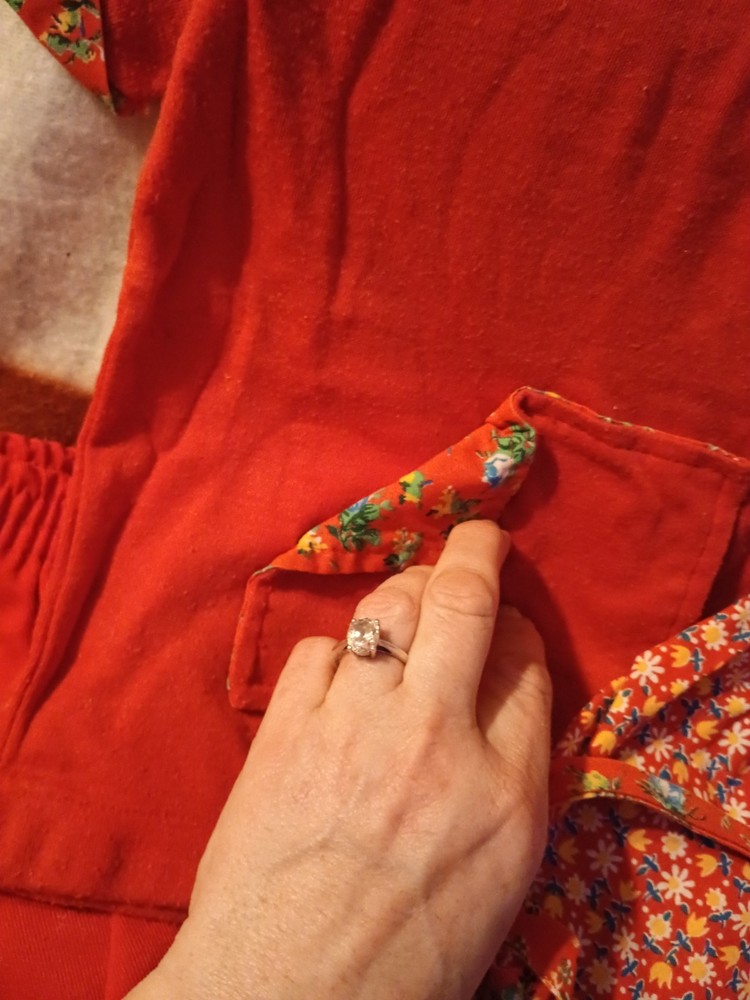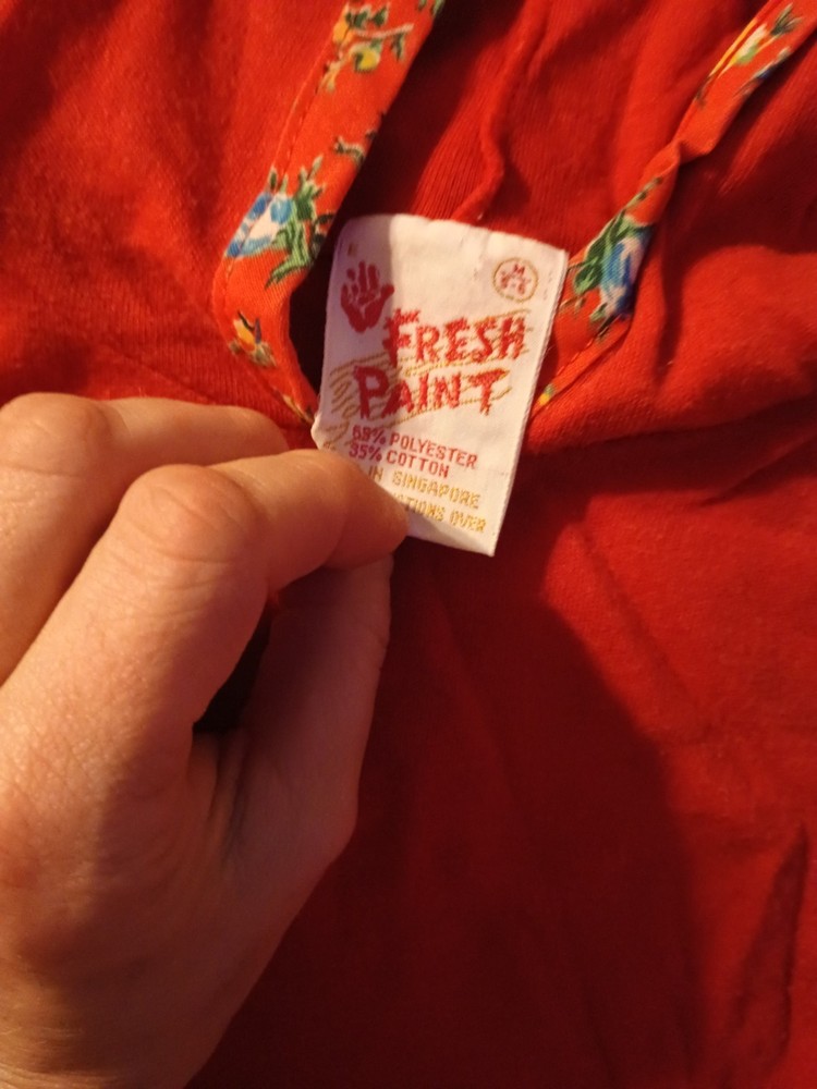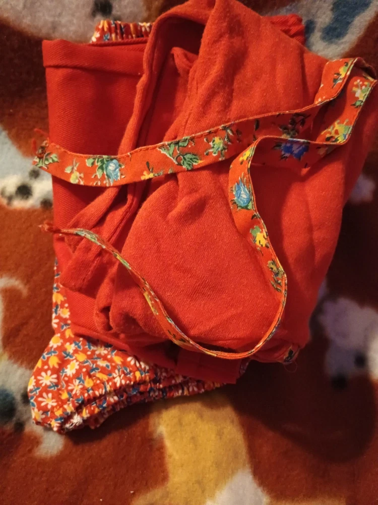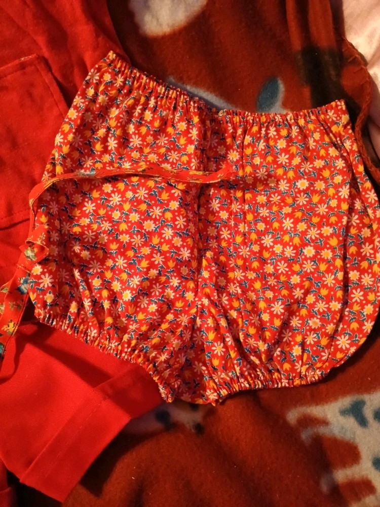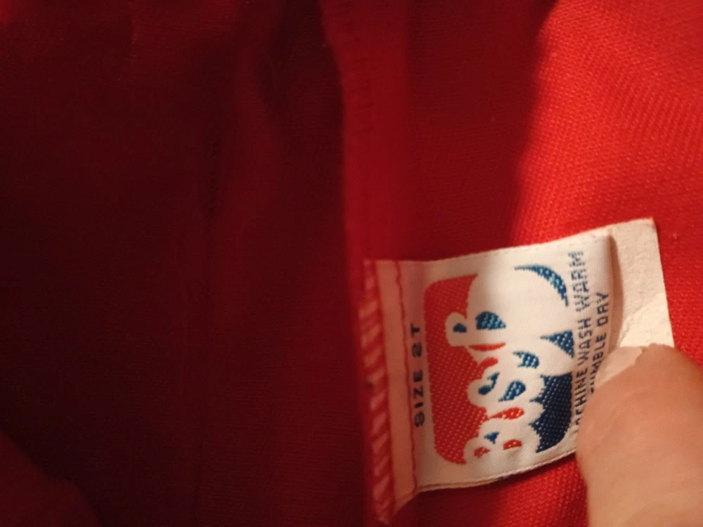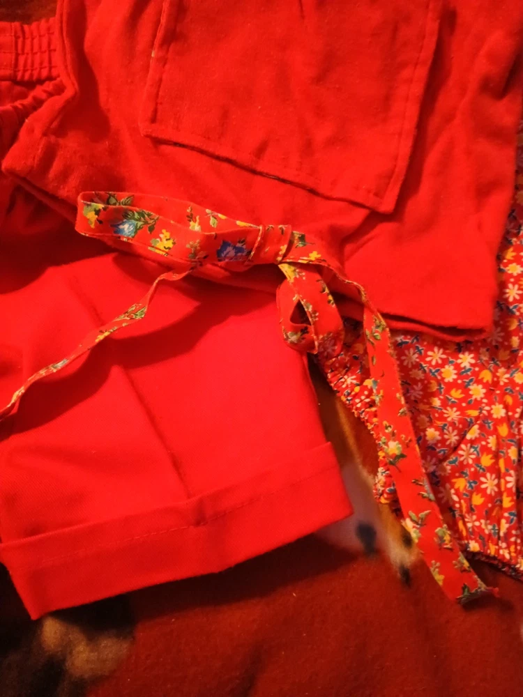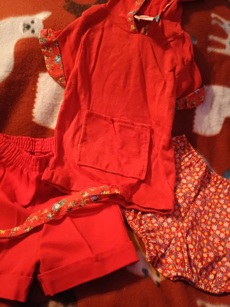 This vintage 3-piece girls set in size 2t-3t is adorable with a floral pattern and red color. Made from a comfortable cotton blend fabric, the set includes a t-shirt, shorts, and a casual shirt, perfect for the summer and spring seasons. The outfit has a 60s theme and features a bow accent, adding a charming touch to the set. The brand, BusyB, ensures quality and style for your little one.The front pocket of the red shirt does need to be resown. It's just one corner of the pocket of the shirt...it is pictured.An easy fix though!