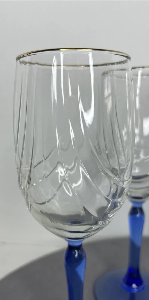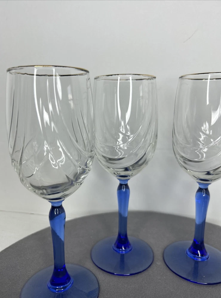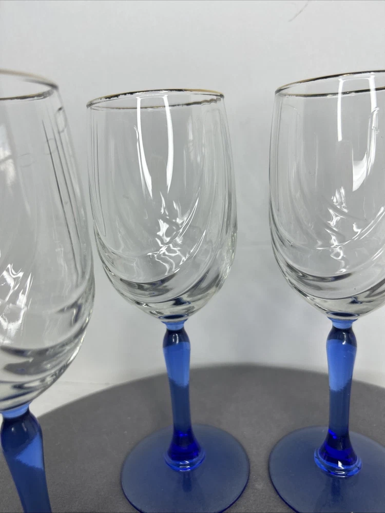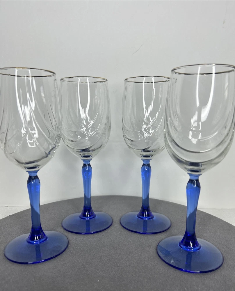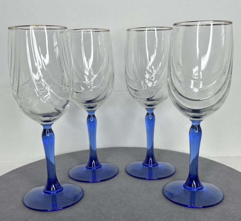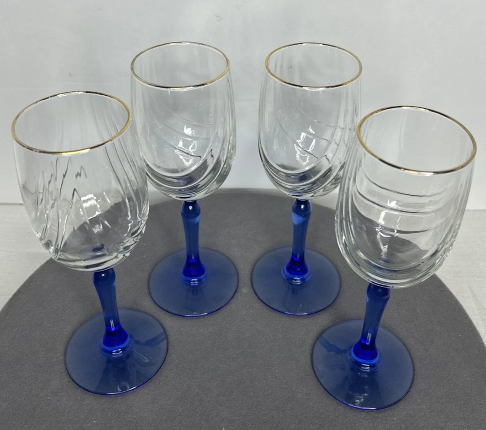 Vintage Lenox Crystal Wine Glass Set includes four round glasses with cobalt blue stems, with a dual swag draped design and gold rims. Hand-blown in 1980's, these 9 oz glasses feature an Art Deco style. The elegant design is perfect for all occasions. A luxurious addition to any glassware collection, these wine glasses were manufactured in France and together they weigh about 4 lbs. Vintage 4 Lenox Crystal Blue Stem Wine Glasses Dual Swag & Gold Rim - 1980's, these are in excellent vintage pre-owned condition, with NO chips, cracks or repairs. Please review all pictures for proper assessment of their excellent vintage pre-owned condition.