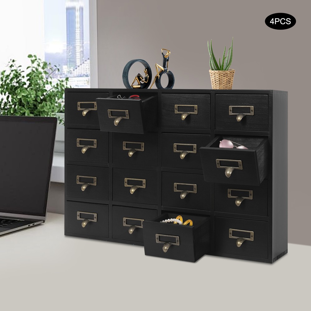 Vintage 4 PCS Drawer Cabinets Pink 64-Drawer Storage Box Storage Cabinet Key Features Build to Last : Premium pine wood and plywood with spray paint and aging processes make this product environmentally friendly , safe, rust- resistant , corrosion- resistan t, and not easy to deform, so it can maintain aesthetics and practicality for a long time. Storage Assistant: The 4 cabinets allow you to use them individually or together for added convenience. 64 compact drawers make it easy to organize and store jewelry, art supplies, cards, notes, tea bags, and other small items. In addition, the top platform allows you to store other items such as table lamps, books, and cups to fully meet your storage needs. Vintage Appearance : The classic black look, rectangular structure, and wood grain make this product retro and elegant, which can be easily integrated into most usage scenarios. Space-saving: Its compact design (each size: 19.69*13.78in) and 4-tier design make full use of tabletop and vertical space, and keep your room neat and clean. Suitable Load-bearing : High-quality materials and sturdy construction allow each cabinet to hold up to 22.05 lbs, so you can use it with confidence. Ideal Gift : Beautiful appearance and practical function make it can be a housewarming gift for family and friends. Easy Clean-up : With its simple construction and smooth surface, you can simply wipe off surface dust with a towel (not included). Ready to Use: This product does not require assembly, and you can use it directly after receiving it, which is very convenient and greatly saves your time. Customer Service : We aim to provide quality products and services. If you have any problems, please feel free to contact us. We will reply to you and solve the problem for you as soon as possible. Details Label Holder: It is convenient for you to put labels on the outside of different drawers for easy identification. Drawer Handle : The zinc alloy handle is strong and firm, convenient for you to hold and put items inside. Application It can be used in a pharmacy, office, porch, living room, study, or bedroom to store medicine, jewelry, headbands, art supplies, cards, notes, cosmetics, tea bags, crafts, lipstick, photos, oils, office supplies, files, coffee utensils, and more. Specifications Color: Black Material: Pine Wood, Plywood, Zinc Alloy Process: Spray Paint, Aging Shape: Rectangle Style: Vintage Assembly Required: No Mounting Type: Tabletop Mount Each Cabinet Load Capacity: 10kg/22.05lbs Number of Cabinets: 4 Number of Drawers: 64 Each 16-drawer Cabinet Size (L*H) : 50*35cm/19.69*13.78in Overall Product Size: 100*10*70cm/39.37*3.94*27.56in Package Size: 61.5*40*56.5cm/24.21*15.75*22.24in Gross Weight: 22kg/48.5lbs Net Weight: 20kg/44.09lbs Package Included 4*16-drawer Cabinets Notes Please check the size carefully before ordering. Please note that the package does not contain any other items except the cabinets. Please allow the slight color difference caused by the shooting light and the 1-3 cm error due to manual measurement, and make sure you do not mind before ordering. On Dec 23, 2025 at 21:58:59 PST, seller added the following information: