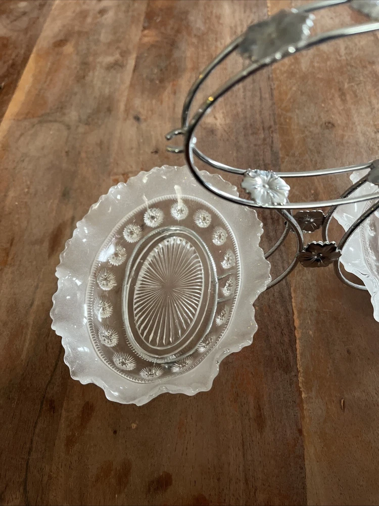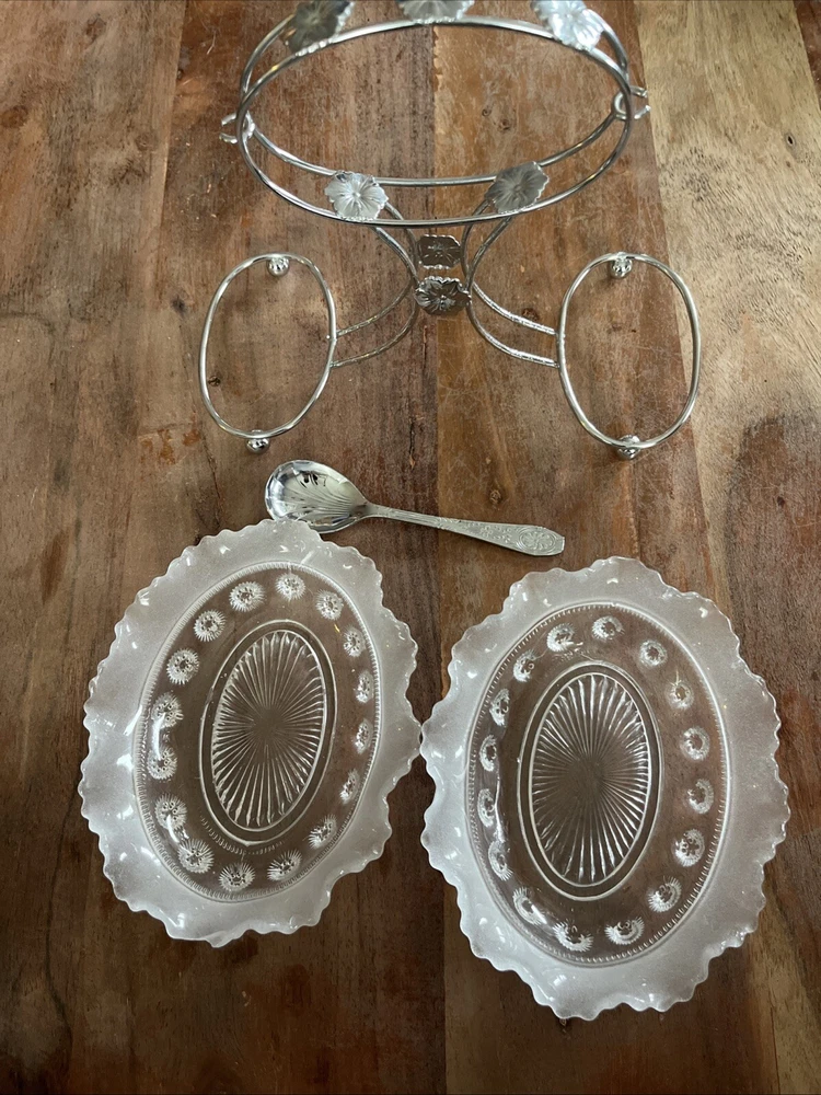 Add a touch of vintage charm to your dining experience with this 4-piece set from Sheffield, England. This set includes a beautifully crafted olive or relish dish, complete with a carrier and a spoon, all made from high-quality chromium plate for lasting durability. The intricate design and attention to detail make this set a perfect addition to any dinnerware collection. The dish and spoon set is perfect for any occasion, whether it's a formal dinner party or a casual family meal. The set is not handmade and has not been modified in any way, ensuring its originality and authenticity. Bring the elegance of vintage dinnerware to your home with this stunning set from Sheffield.