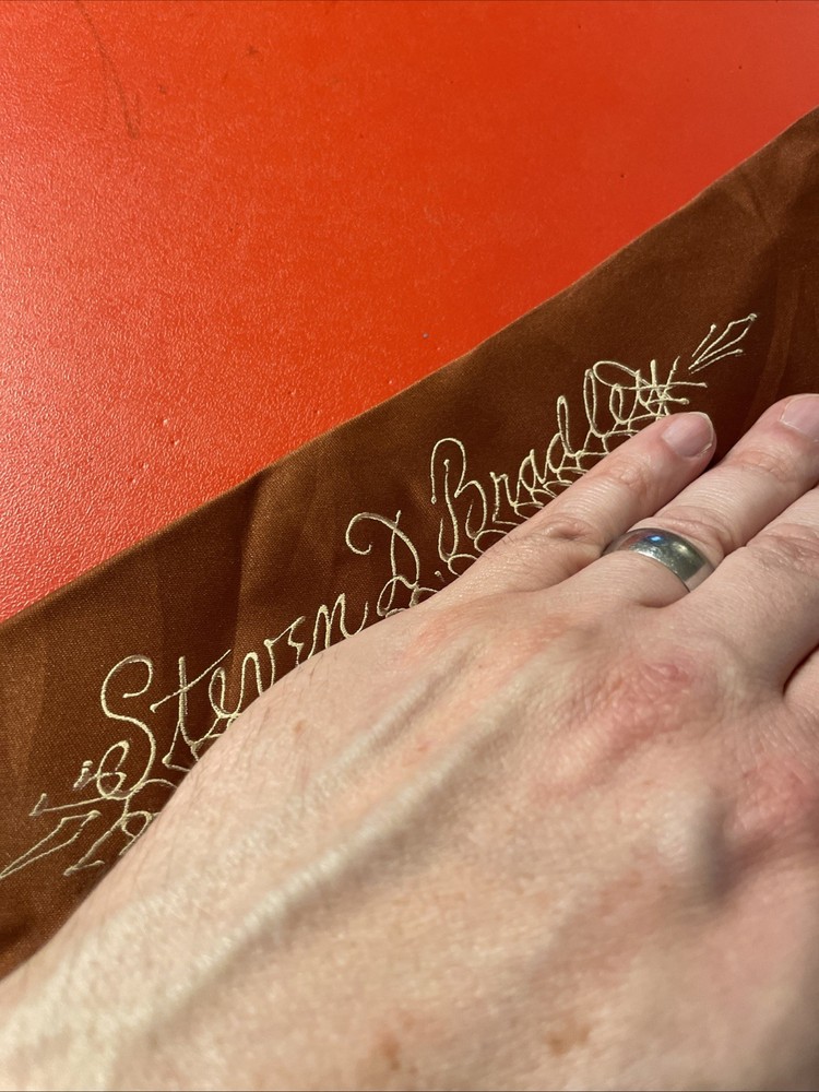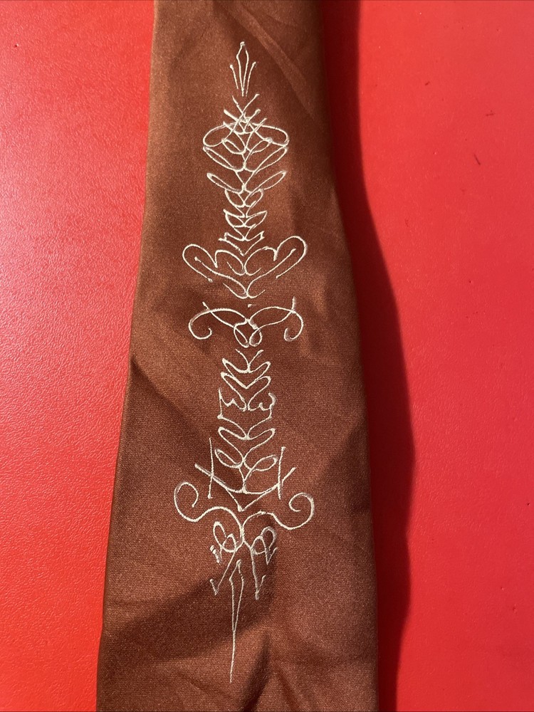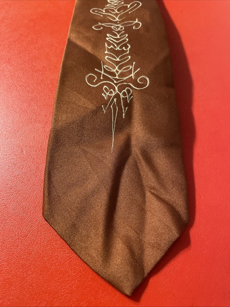Make a statement with this vintage tie from the 40s to 50s era. The mirrored hand-painted name pattern adds a unique touch to this classic piece. With its copper color and EARLY polyester fabric type, this tie is perfect for adding a touch of art deco, swing, and rockabilly style to your wardrobe. The tie features a classic width and a retro, symmetrical design that is perfect for any occasion. Spencer’s Gifts presents this one-of-a-kind tie, made in the United States, that will surely make you stand out from the crowd. The tie is perfect for any fan of atomic, retro, and symmetrical designs. Get ready to add a vintage touch to your wardrobe with this exquisite piece. VERY EARLY polyester and also very early from Spencer’s! Hand painted and also even the brand logo on back is painted too.