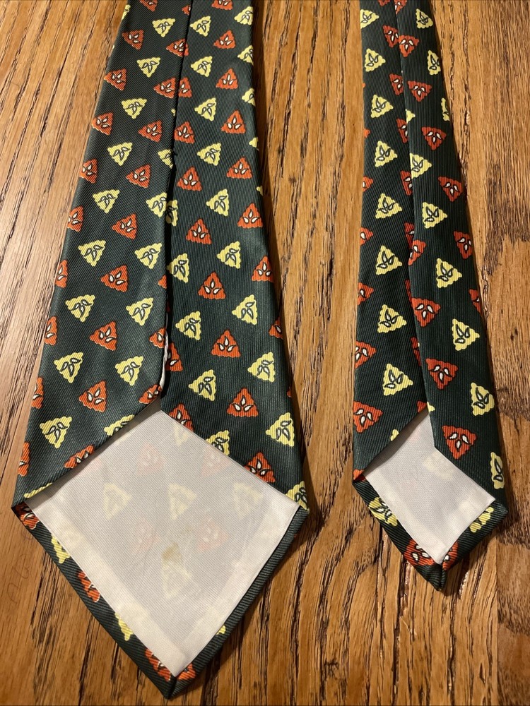 Make a statement with this vintage 40s wide rayon swing tie featuring an atomic art deco abstract arrowhead pattern. The multicolor tie is made of satin fabric and has a wide width that's perfect for a rockabilly look. This unique tie is a great accessory for men's vintage clothing and adds a touch of retro flair to any outfit. The tie is made in the United States and is a vintage item, making it a great addition to any collection. The fabric type is rayon, and the tie is perfect for those who want to make a bold statement with their fashion. The tie's theme includes art deco, swing, 40s, atomic, wide, and rockabilly, making it a versatile accessory for various occasions.