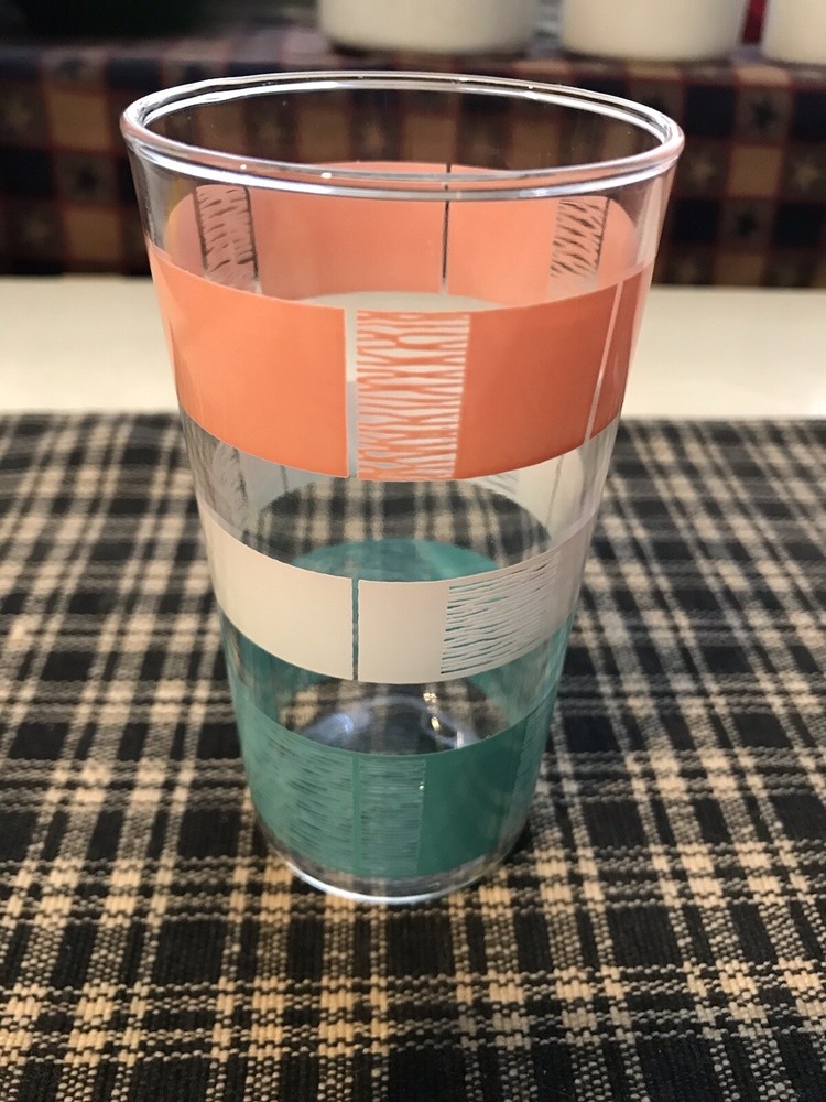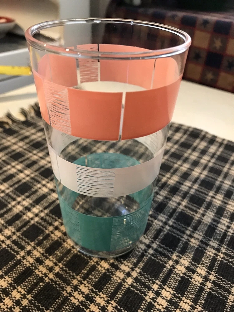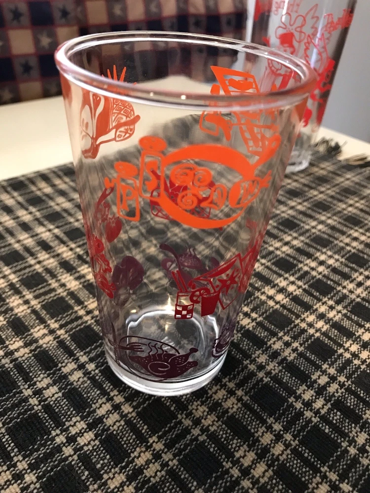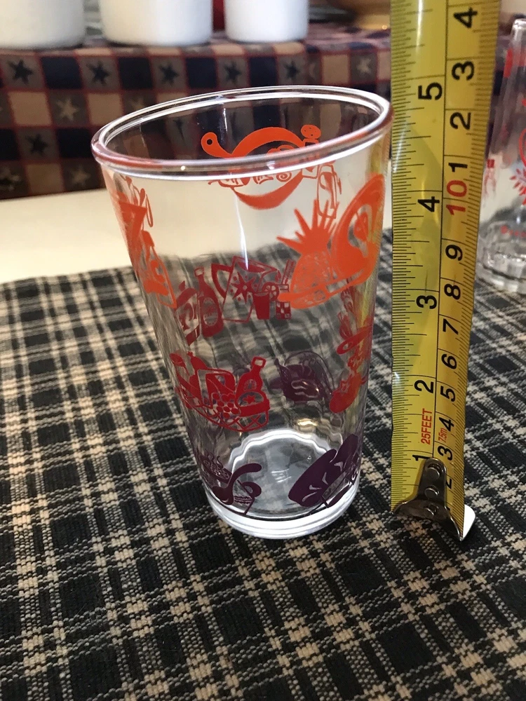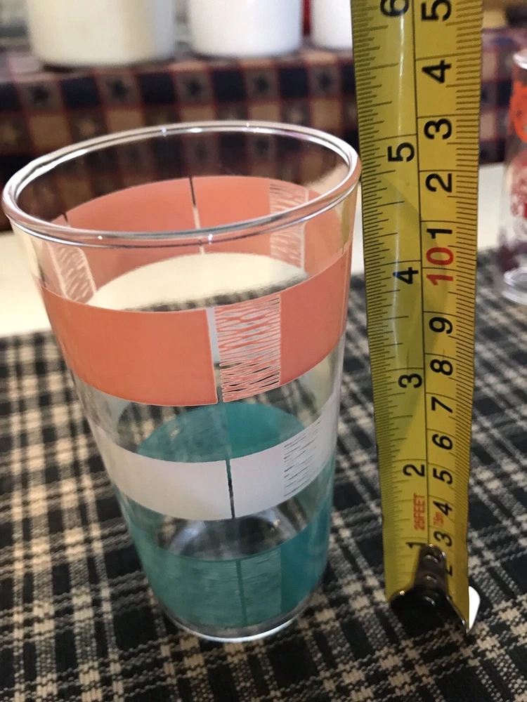 This is a mixed set of 4 vintage drinking glasses made by various brands such as Hazel Atlas, Libbey, Anchor Hocking, and Swift Company. The glasses are round in shape and have a mid-century modern style. They are multicolored and made of glass, and were manufactured in the United States during the 1950s. This set is perfect for all occasions .