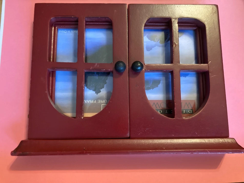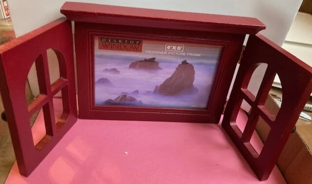 The product is a vintage 4x6 wood tabletop photo frame with a design of windows open. It has a height of 5 5/8 inches, a length of 7 7/8 inches, and a width of 1 1/8 inches. The frame is suitable for holding 4x6 inch photos and is made of wood. It would be a charming addition to home décor, perfect for displaying cherished photos. See photos for nicks and scratches