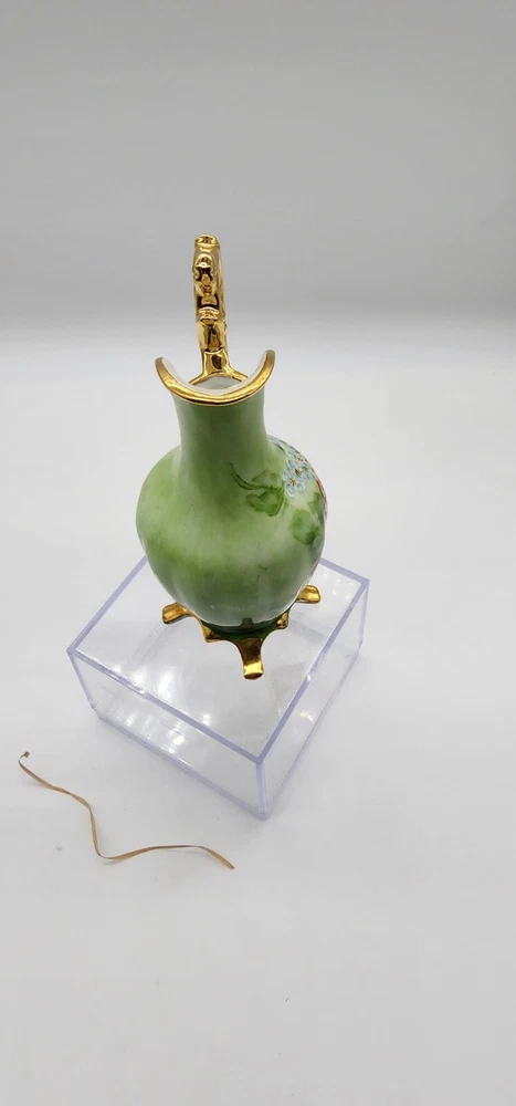 This small Floral and gold pitcher is in great condition. There are no chips or cracks that can be seen. It is 5 inches tall and 2 inches wide. It is all hand painted.