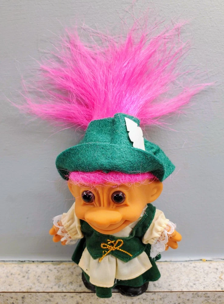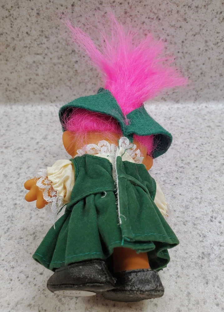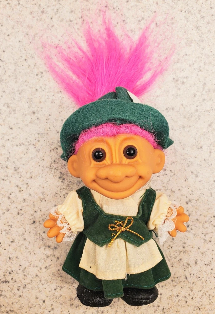 Discover a nostalgic treasure with the Vintage 5" Russ Troll Doll, from the Around the World Series, representing Germany, dressed in a green hat and dress with white shirt adorned with lace, with a back closure. This charming collector's piece, stands at an adorable 5 inches. This troll is a perfect addition for enthusiasts of all ages, from teens to adults, and part of the dolls Around the World Series for collectors. This doll is a delightful little troll that brings a touch of whimsy and a little fantasy into your world.