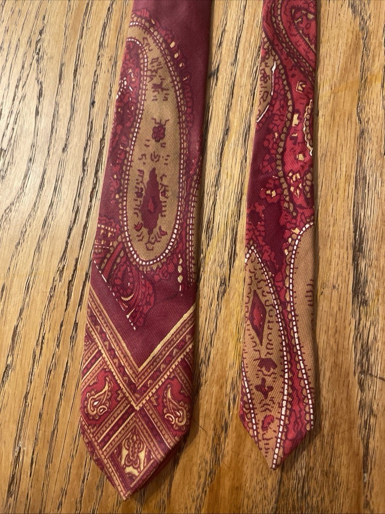 The Vintage 50s 60s Acetate Skinny Tie is a stylish and unique accessory for men. Made in the United States with a luxurious satin fabric and featuring a retro paisley pattern, this necktie exudes a rockabilly vibe with a touch of preppy style. The multicolor design adds a playful pop to any outfit, making it a stand-out piece for those looking to make a statement with their fashion choices. This vintage tie is perfect for adding a touch of nostalgia to any ensemble.