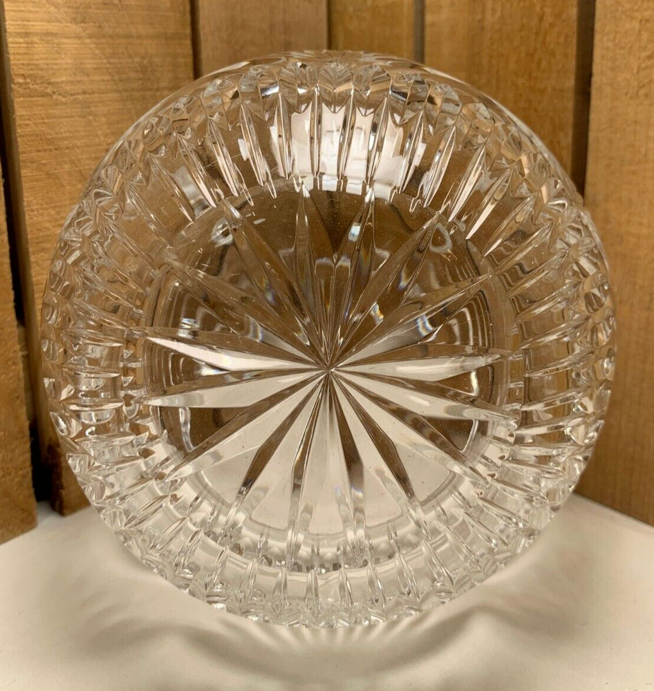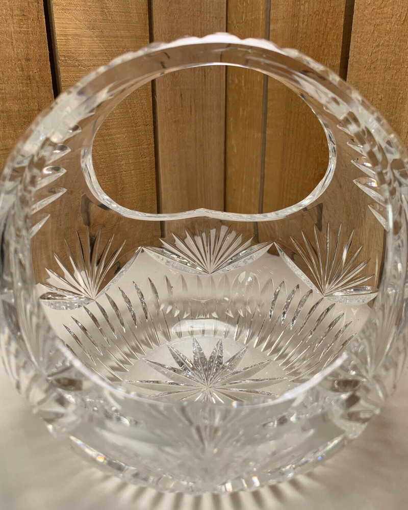 Vintage Round Clear Crystal Nut, Candy, Snack, Flower, or Fruit Basket or Dish. Approximately 5 3/4" tall and 5 3/4" diameter. Weighs 2 lb 5 oz. We try to find out as much information as possible on each item we have available. On occasion we may make a mistake and appreciate your feedback. This item does not appear to have any crack or chips. Please see all photos as they are part of the description. We try to list as many details as possible, however some items are vintage and pre-owned so flaws are to be expected.