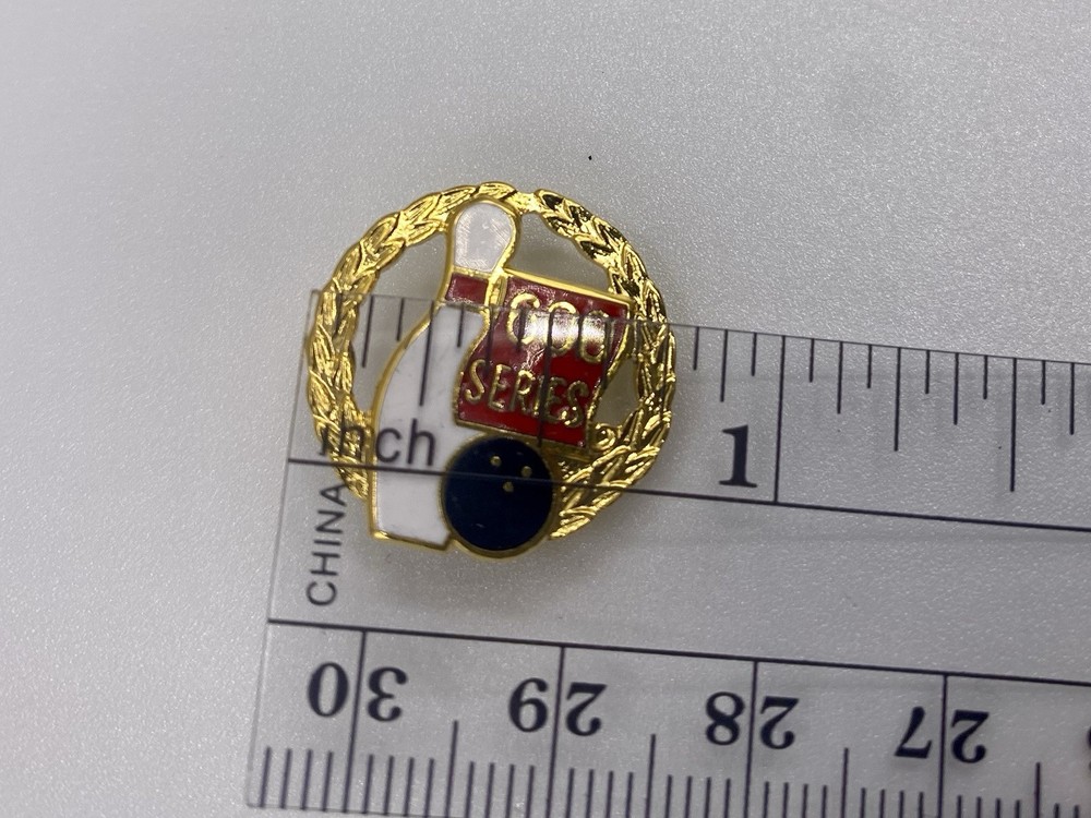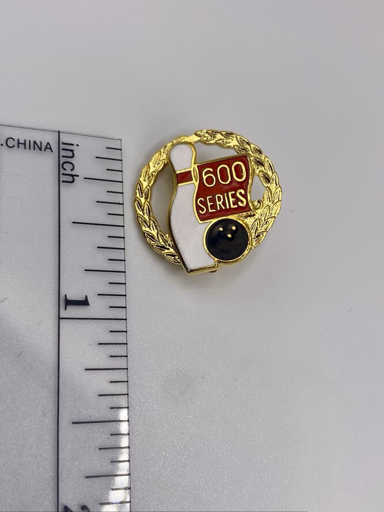 This vintage lapel pin celebrates a classic 600 series bowling score. The pin features a traditional bowling silhouette and is a great addition to any sports-themed collection.