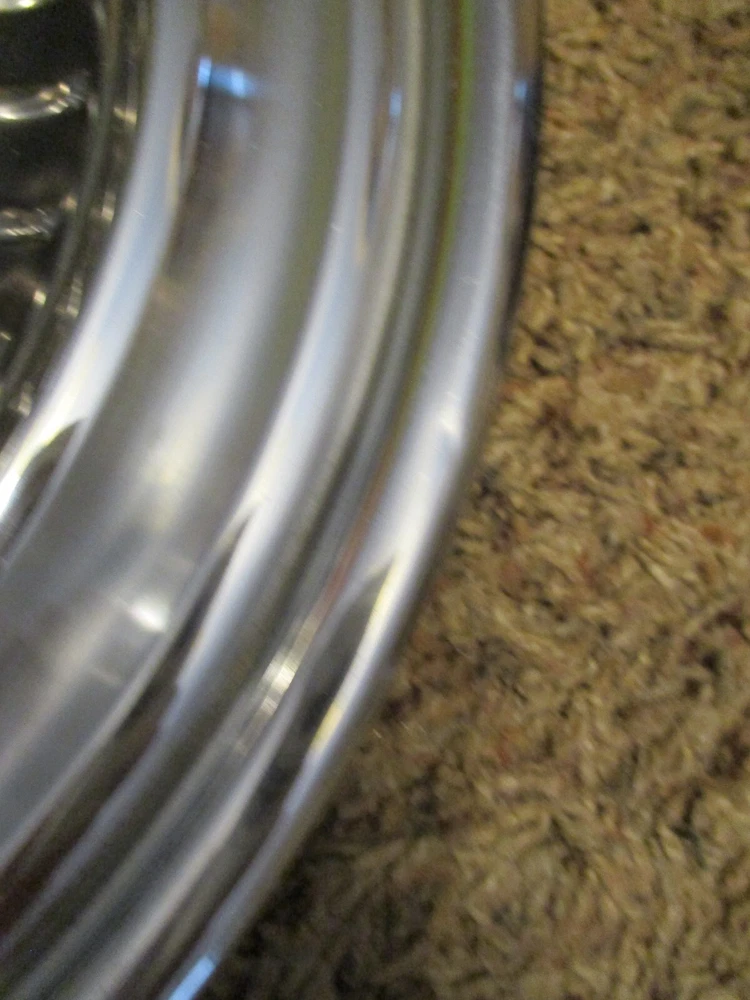 Used wheel covers. There are a few small dents. Paint is worn on black area. Some discoloration on center area. Please look at detailed pictures for condition. If you need more pictures please ask. See pictures for size.