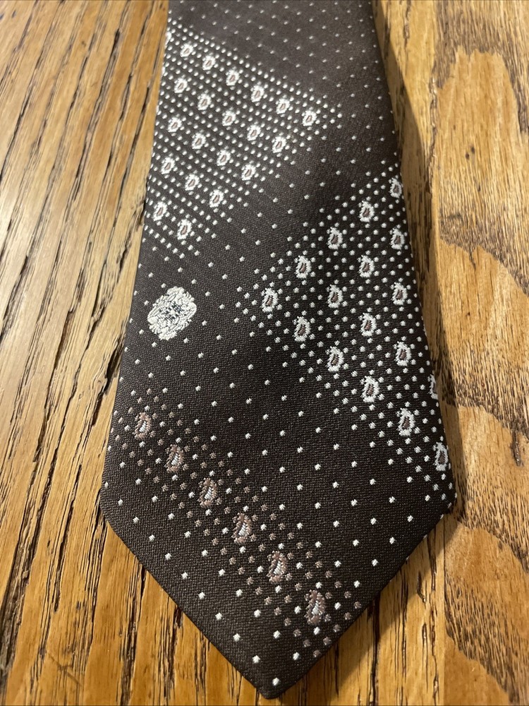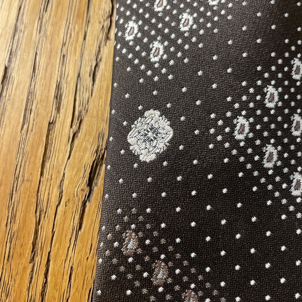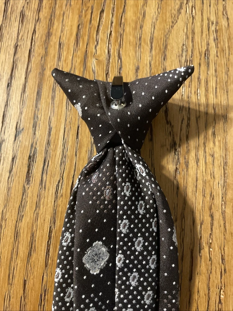This vintage 60s 70s polyester clip-on tie is a perfect accessory for men looking to add a touch of retro flair to their ensemble. The geometric pattern and multicolor design give off a Mod, Disco vibe, making it a standout piece for those who appreciate retro fashion. Made in the United States, this woven tie is classic in width and showcases the unique style of the era. The clip-on attachment type allows for easy wear, making it a convenient addition to any man's wardrobe.