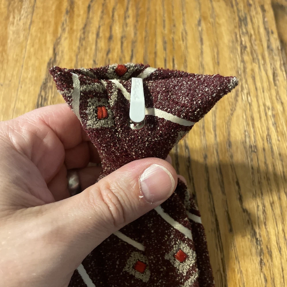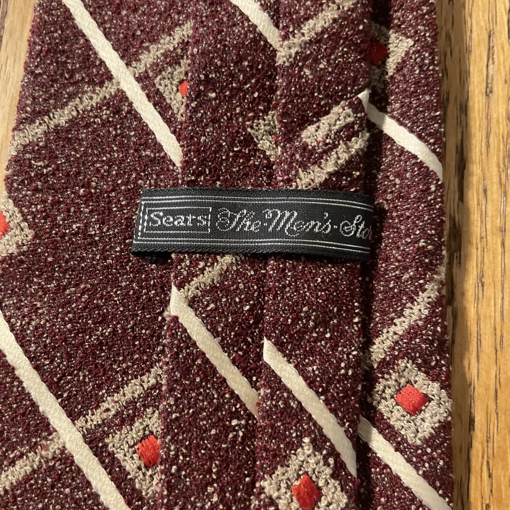 This vintage 60s 70s Sears polyester clip on wide tie is a retro piece perfect for those looking to add a touch of Mod and Disco flair to their outfit. The multicolor geometric pattern on this woven polyester tie adds a unique and eye-catching element to any ensemble. With its clip-on style and wide width, this tie is a versatile accessory that can elevate a variety of looks with its retro charm. Made in the United States by Sears, this tie is a nostalgic piece that embodies the vibrant style of the 60s and 70s era.