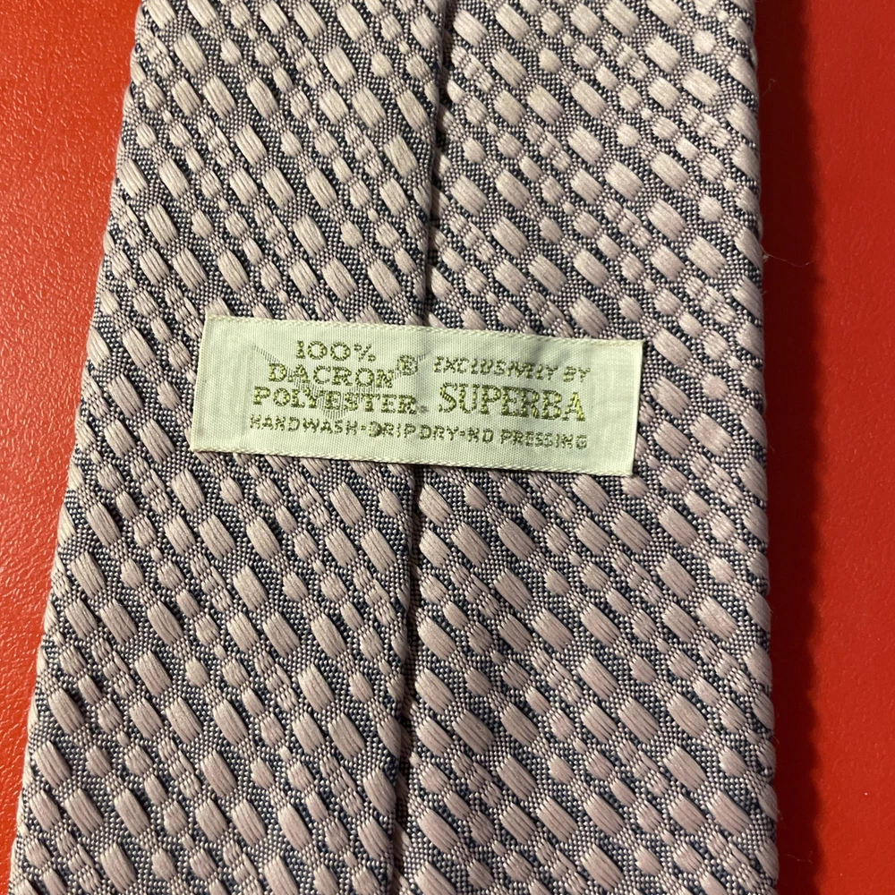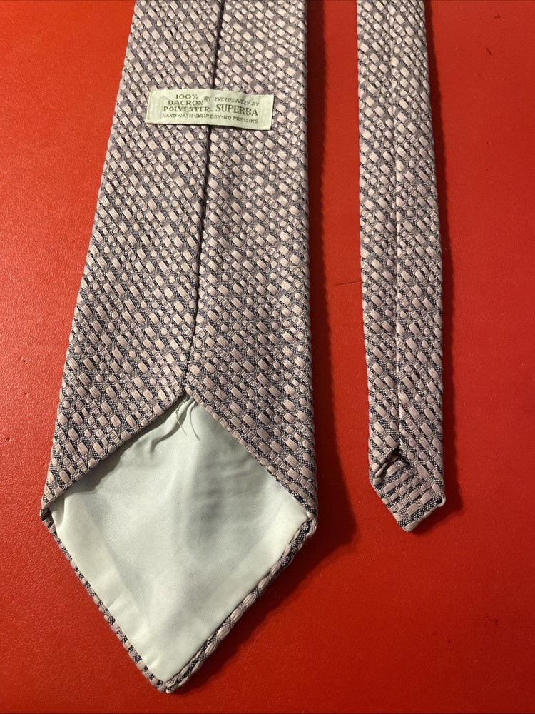Add a touch of retro flair to your wardrobe with this vintage Superba tie. The periwinkle color and solid color woven pattern make it a perfect accessory for a mod or disco-themed outfit. Made from polyester and woven fabric, this wide tie is a great addition to any vintage collection. The tie features a retro design that is perfect for adding a touch of nostalgia to your look. The tie is perfect for men's accessories and can be used to complete a vintage outfit. This United States made tie is a great addition to any wardrobe and is sure to make a statement. Whether you're going for a retro look or just want to add a touch of vintage style to your outfit, this Superba tie is a must-have.