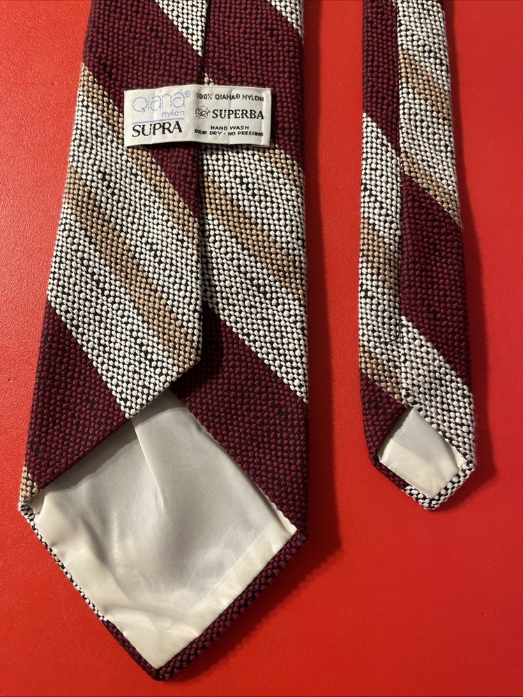 Elevate your wardrobe with the Superba vintage tie, a timeless piece that captures the essence of the Mod, Disco, and Retro themes. Crafted from durable Qiana Nylon, this tie is woven with a classic striped pattern in vibrant, multicolor hues that stand out with impeccable style. The wide width of the tie adds a touch of sophistication to the piece, making it an ideal choice for the fashion-forward individual. Proudly made in the United States, this retro necktie is a testament to the quality and style of the 60s and 70s era. Perfect for adding a vintage touch to any outfit.