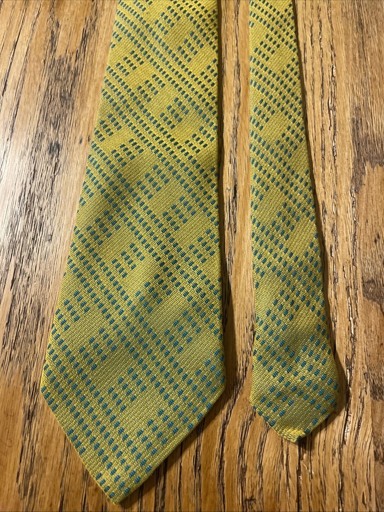 The product is a vintage 60s acetate wide tie with a geometric pattern in multicolor, perfect for those embracing a retro Mod or Disco style. Made in the United States, this woven tie adds a touch of nostalgia to any outfit. The wide width and textured material make it a standout accessory for men looking to channel their inner 60s fashion icon.