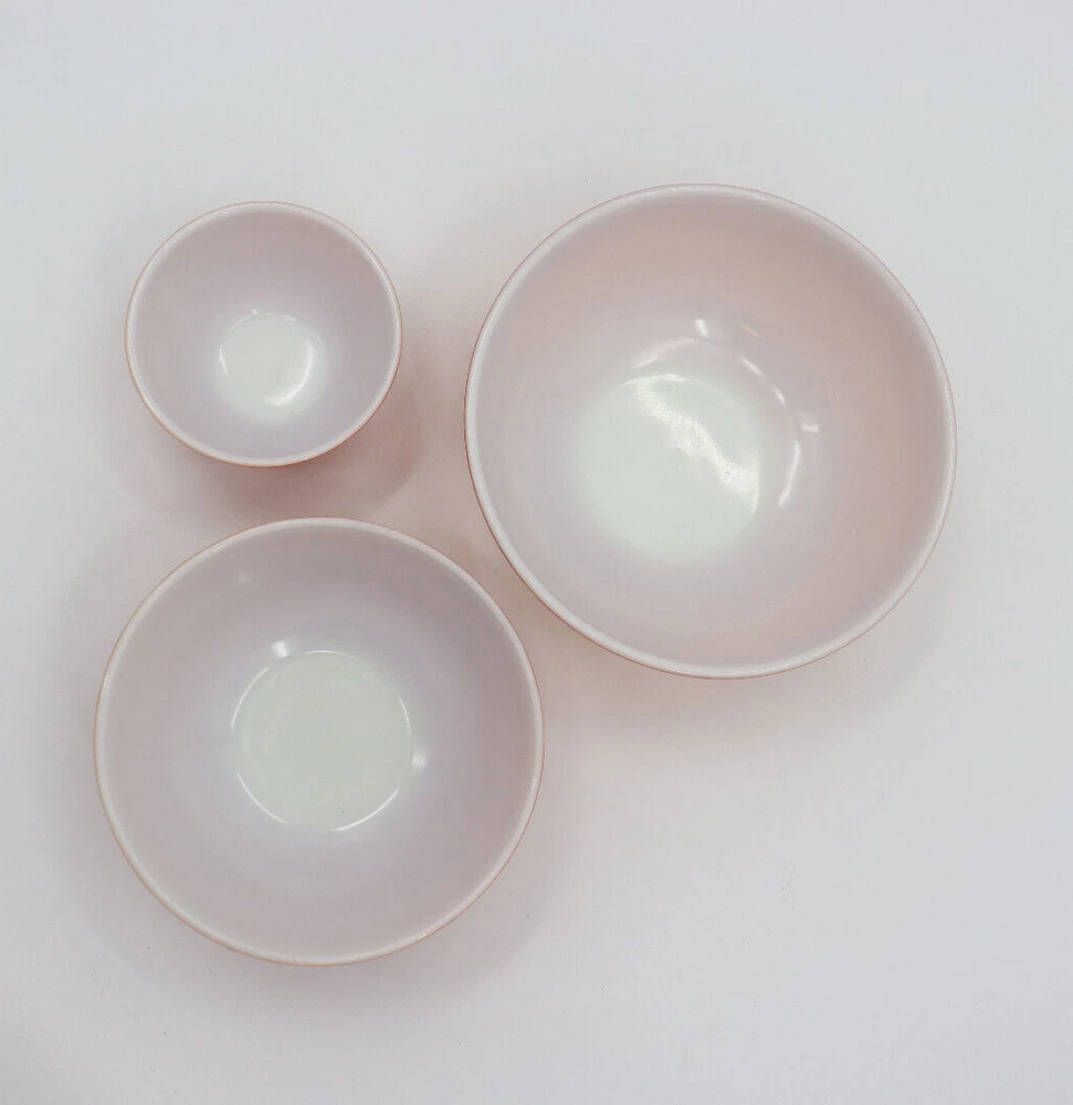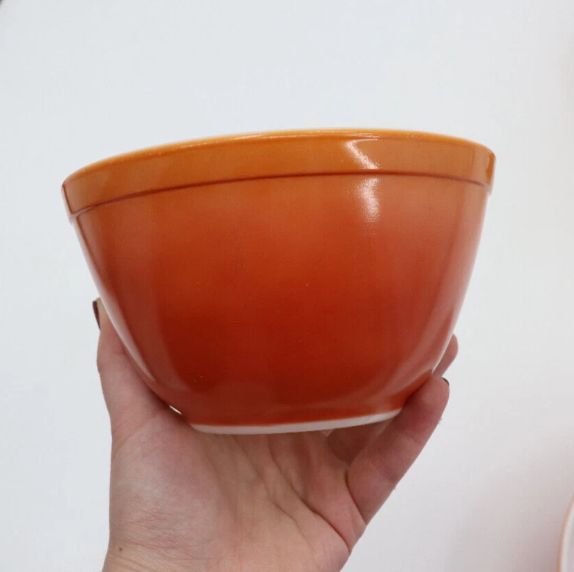 Vintage Pyrex Dishes in the pattern Flameglo, which is a red to orange ombre. These mixing bowls were made in the 1970s for a short period of time. It is missing one nesting bowl, so it is not a complete set. These dishes are great for use or to add to your Pyrex collection. The bowls range from good to fair condition. Shows signs of wear from age and use, such as discoloration, scratches and other markings. The largest bowl in the set has the most scratches. See photos for details. From largest to smallest, the diameter of the bowls measure as followed: 10.5", 8.75", 5.75". Message me with any questions!