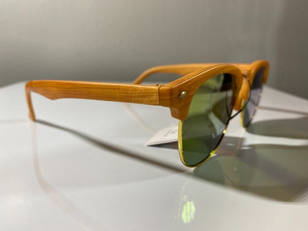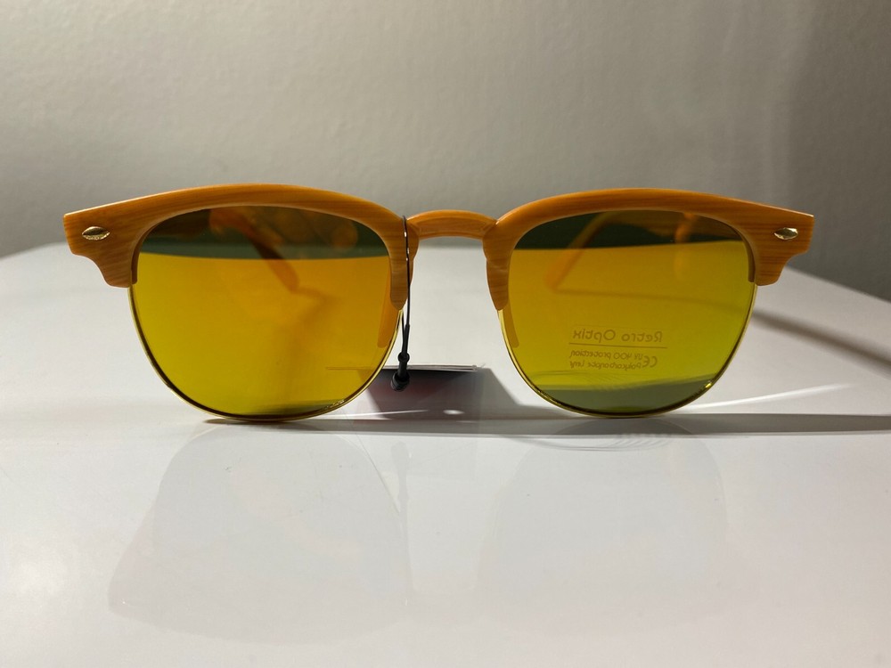 Classic 60's style sunglasses with wood like frame and yellow reflective lenses.