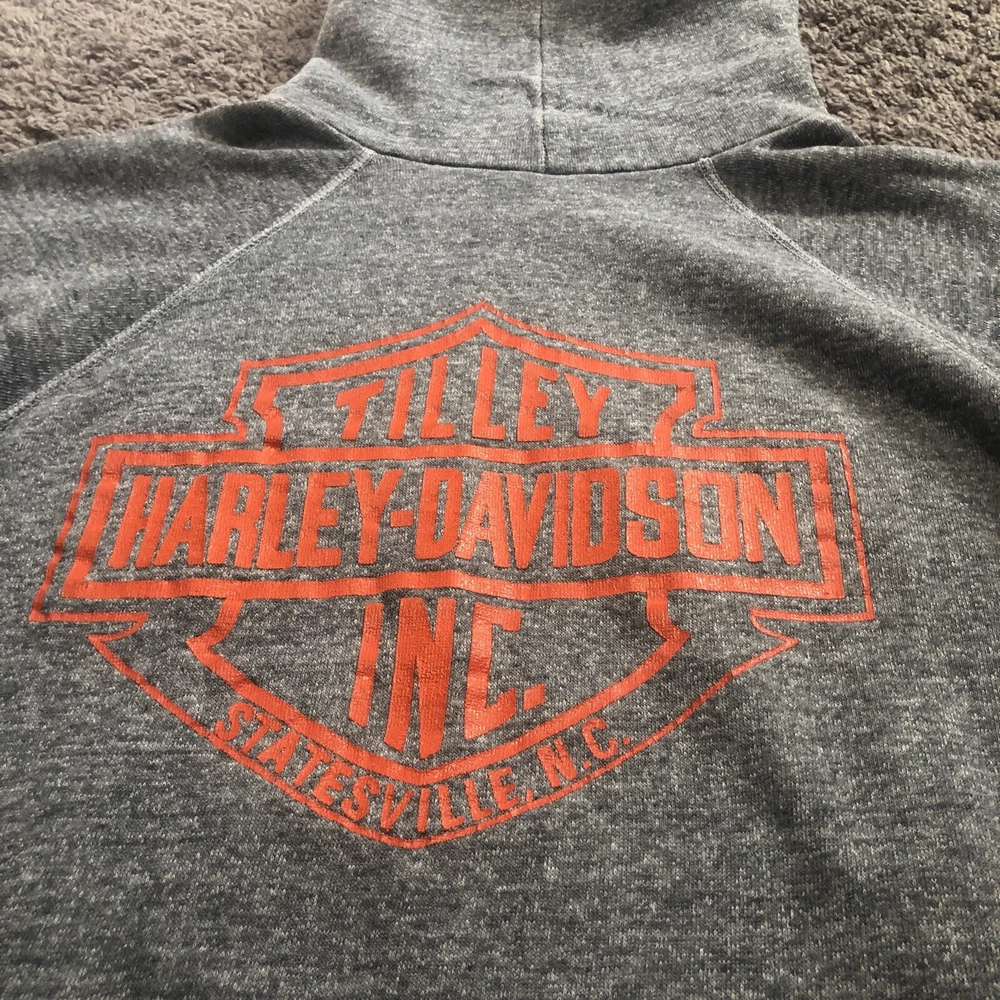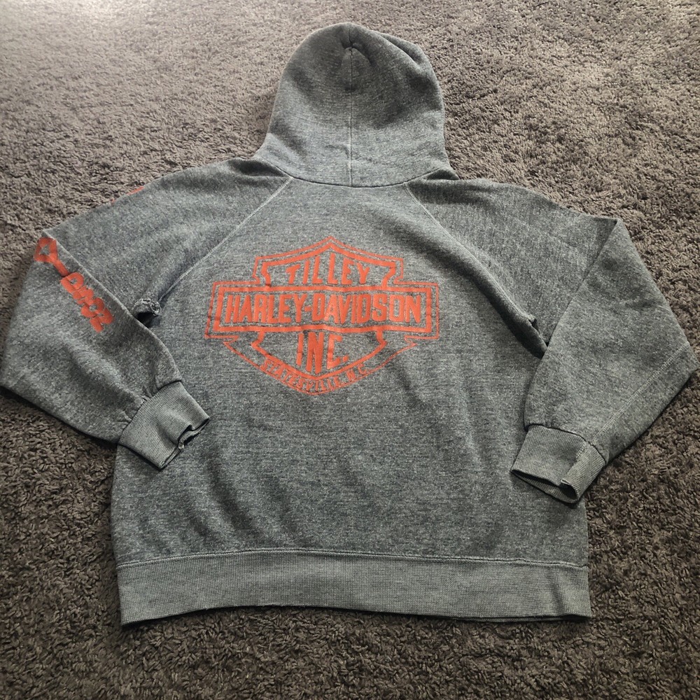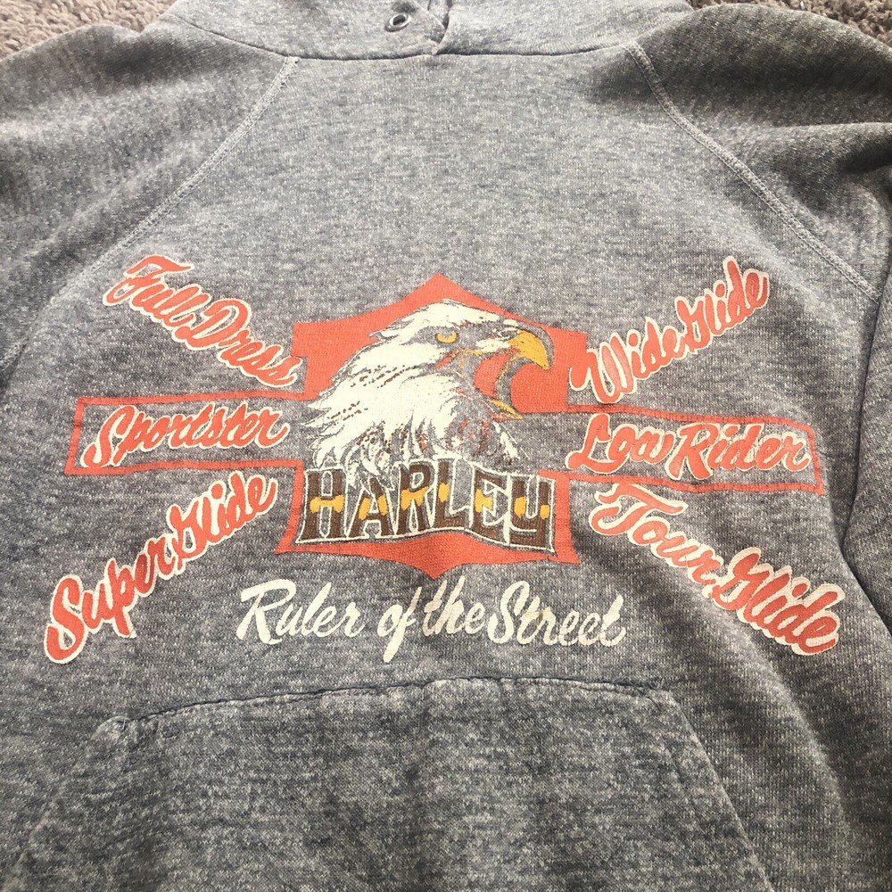 Vintage 70s 80s Harley Davidson Eagle Raglan Hoodie Size Small Grey Tilley Inc. Good condition for age with some flaws Size tag is missing, but measurements are provided in photos. A couple holes under each arm, stitching up could be a fix. Small hole at pocket corner. Small hole at bottom hem too. Missing drawstring. Graphics look to be in really nice looking shape.